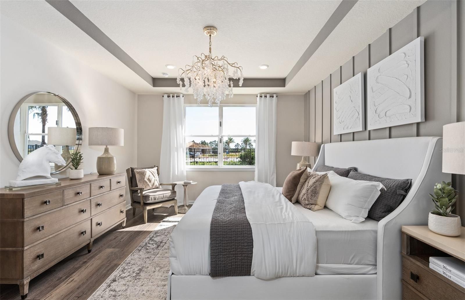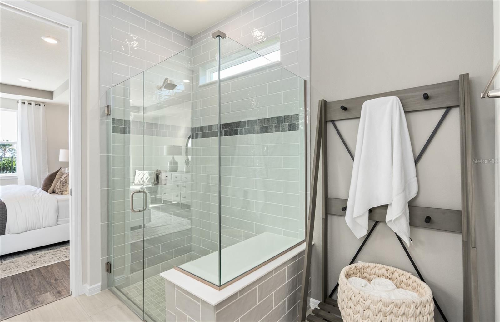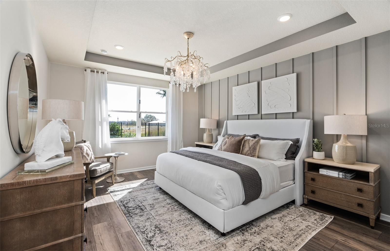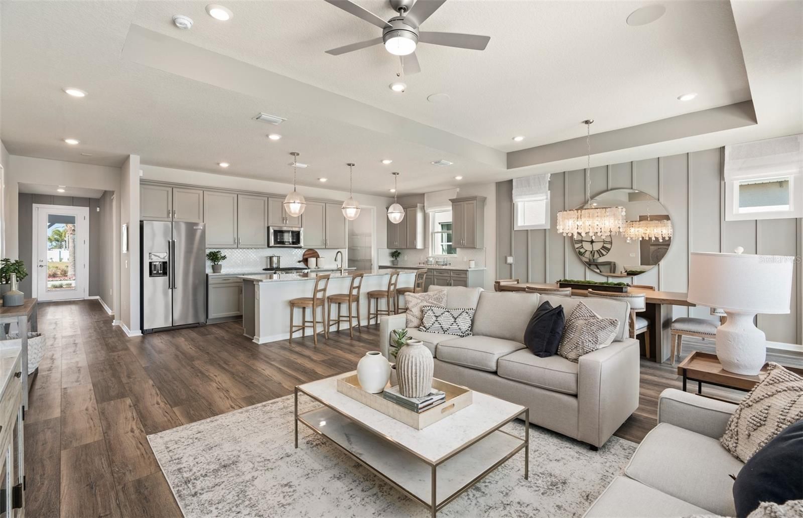 Experience the perfect blend of luxury and convenience with the Palmary dream home. Formerly a model home, this stunning one-story residence showcases a thoughtfully designed layout with 3 spacious bedrooms, 2 full bathrooms, and a 2-car garage. Enjoy your private outdoor oasis featuring an in-ground pool with a sun shelf and a covered lanai pre-plumbed for an outdoor kitchen. Step inside to the heart of the home, the gourmet kitchen is a standout feature, equipped with 42" Stone Gray cabinetry, quartz countertops, a sophisticated decorative tile backsplash, stainless steel sink, and upgraded faucet. Whirlpool stainless steel appliances, including a refrigerator and natural gas range, complete this culinary haven. The open-concept living area, flooded with natural light from expansive windows and highlighted by tall ceilings and a tray ceiling at the gathering room, creates an airy, welcoming space perfect for relaxing or entertaining. Retreat to the luxurious owner’s suite, a serene sanctuary with a spacious walk-in closet and a spa-like en suite bathroom. Dual vanity sinks, a frameless glass enclosed walk-in shower with a built-in bench, an enclosed toilet, and a linen closet complete the tranquil space. At the front of the home, the two spare bedrooms and bathroom provide ample space for guests or personal use. The practical laundry room, complete with built-in cabinetry, a utility sink trimmed in quartz, and Whirlpool washer and dryer makes everyday tasks a breeze. Designer-curated selections elevate this home with pendant pre-wiring, comfort-height toilets, brushed nickel hardware and plumbing fixtures, Sherwin Williams City Loft interior paint, and wood-look luxury vinyl plank flooring throughout the entire home (except for the bathrooms and laundry rooms which are outfitted with tile). For modern convenience, this home is equipped with a smart thermostat, surround sound pre-wire, security system pre-wire, digital IP camera pre-wire, LED downlights, and additional data ports. Blending luxury, comfort, and cutting-edge connectivity, this home is designed for today’s lifestyle. Schedule an appointment to see it today!
