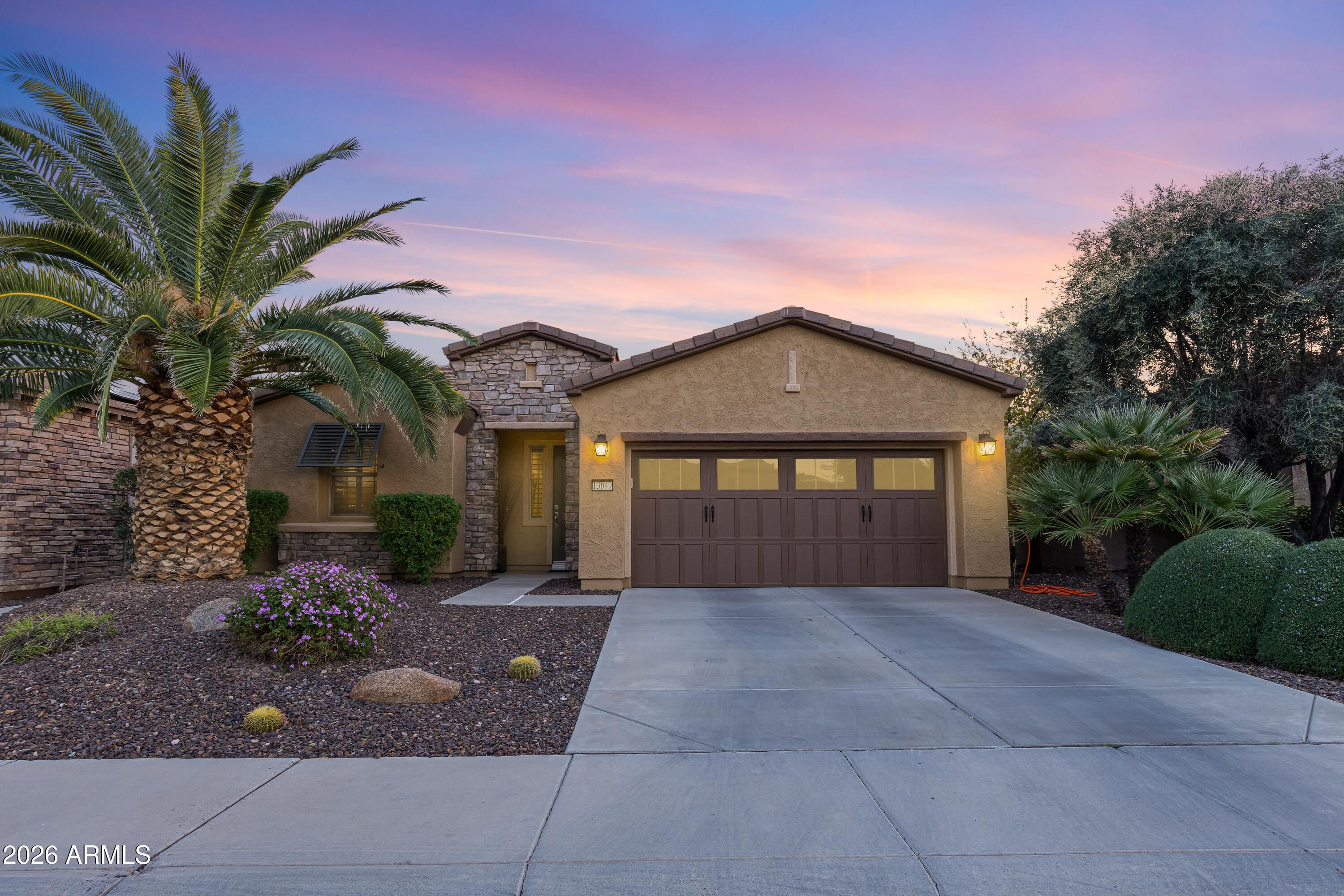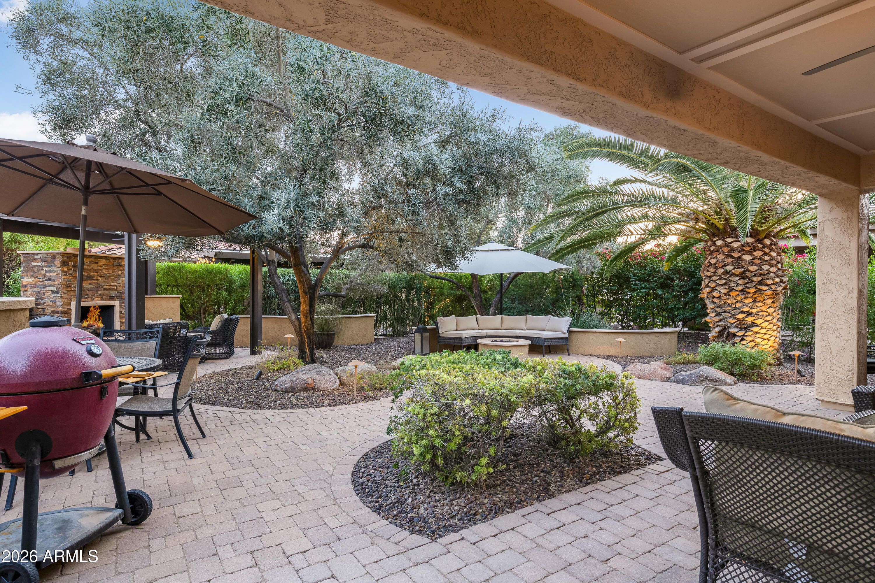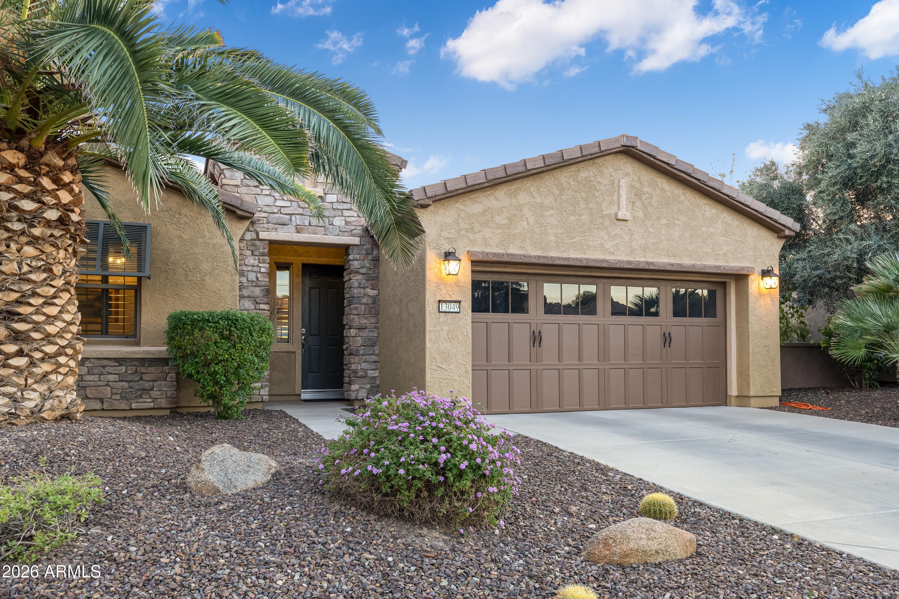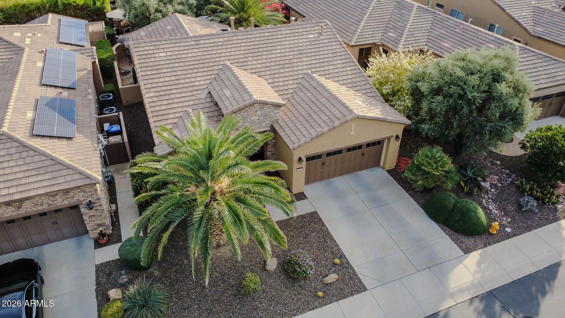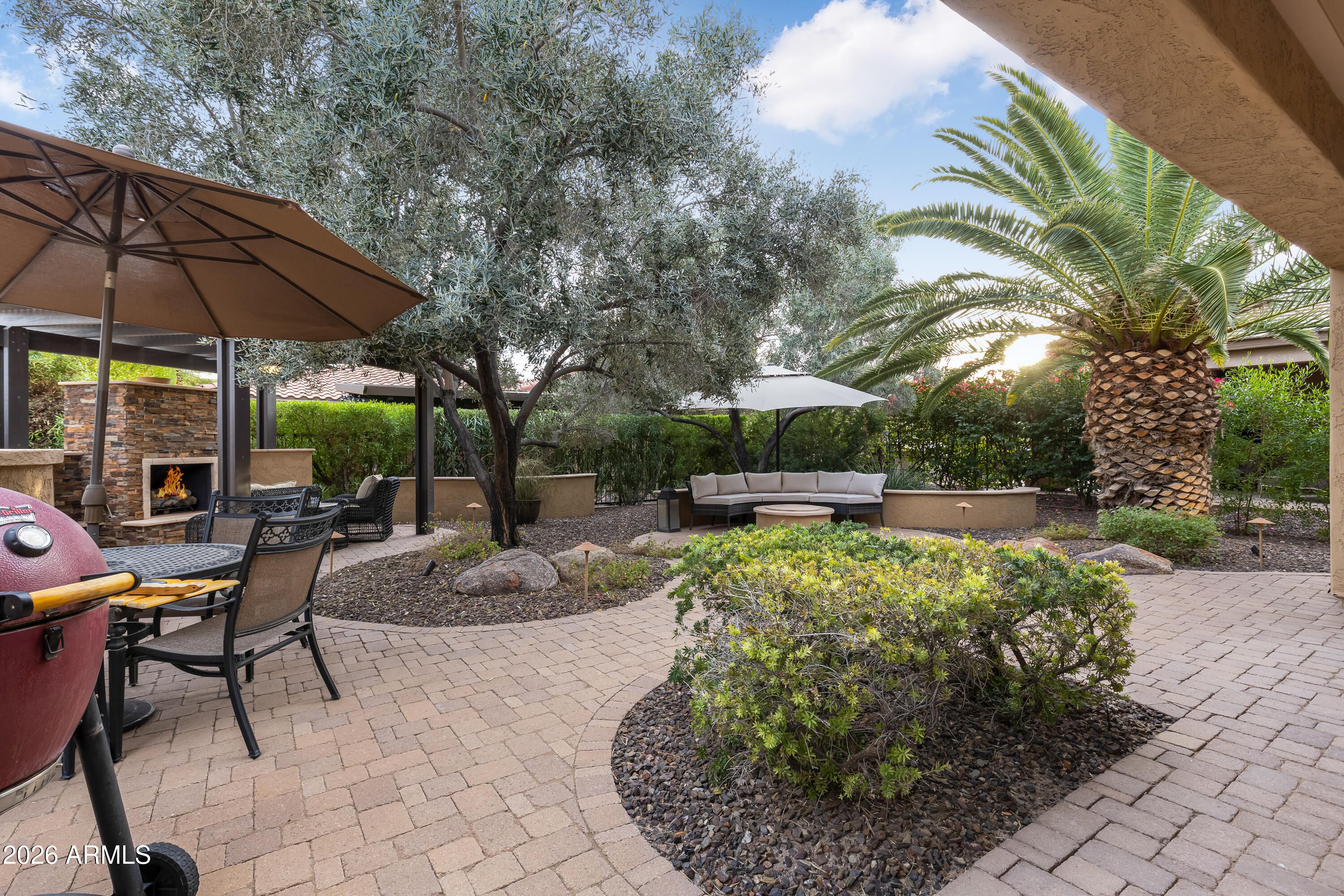 ULTIMATE SMALLER TURNKEY HOME & SETTING. Nestled on a private, south-facing lot, this impeccably maintained 2008 Rivas model showcases exceptional craftsmanship and designer upgrades throughout. From the moment you arrive, the elegant entry impresses with a door featuring sidelights, decorative wood panel accent wall with chair rail, crown molding, recessed can lighting, and refined two-tone paint complemented by decorative trim above doors and windows. The chef's kitchen is both beautiful and functional, featuring premium granite slab countertops, a travertine tile backsplash, staggered upper cabinetry, pantry, reverse osmosis system, and a curated mix of LG and GE appliances—perfectly designed for entertaining and everyday living. The great room is a true showpiece, highlighted by a custom-built shiplap media wall with integrated storage units, gas fireplace wrapped in travertine tile surround, decorative wood panel accents, surround sound, and roller sunscreen shades, all overlooking the serene backyard oasis. The owner's suite offers a private retreat with plush low-nap carpet, upgraded ceiling fan, private door to the backyard, and a spa-inspired bath featuring quartz countertops and backsplash, upgraded lighting, faucets, and fixtures, plus a stunning chiseled-edge porcelain tile shower with heavy glass enclosure. A thoughtfully designed guest suite includes a built-in Murphy bed and desk with an adjacent full bath beautifully finished with tiled countertops and a shower surround. Central Vac ! Step outside to a true backyard paradise featuring a huge extended patio with a custom ceiling, surround sound, recessed can lighting, ceiling fans, and elegant pavers. Entertain with ease thanks to a BBQ gas stub, a built-in stacked-stone fireplace under a pergola, and a separate gas fire pit. A four-foot privacy wall with integrated path lighting frames the space, while lush, mature landscaping with natural boulders creates a serene retreat. The show-stopping Pineapple Palm is truly a must-see to be believed.