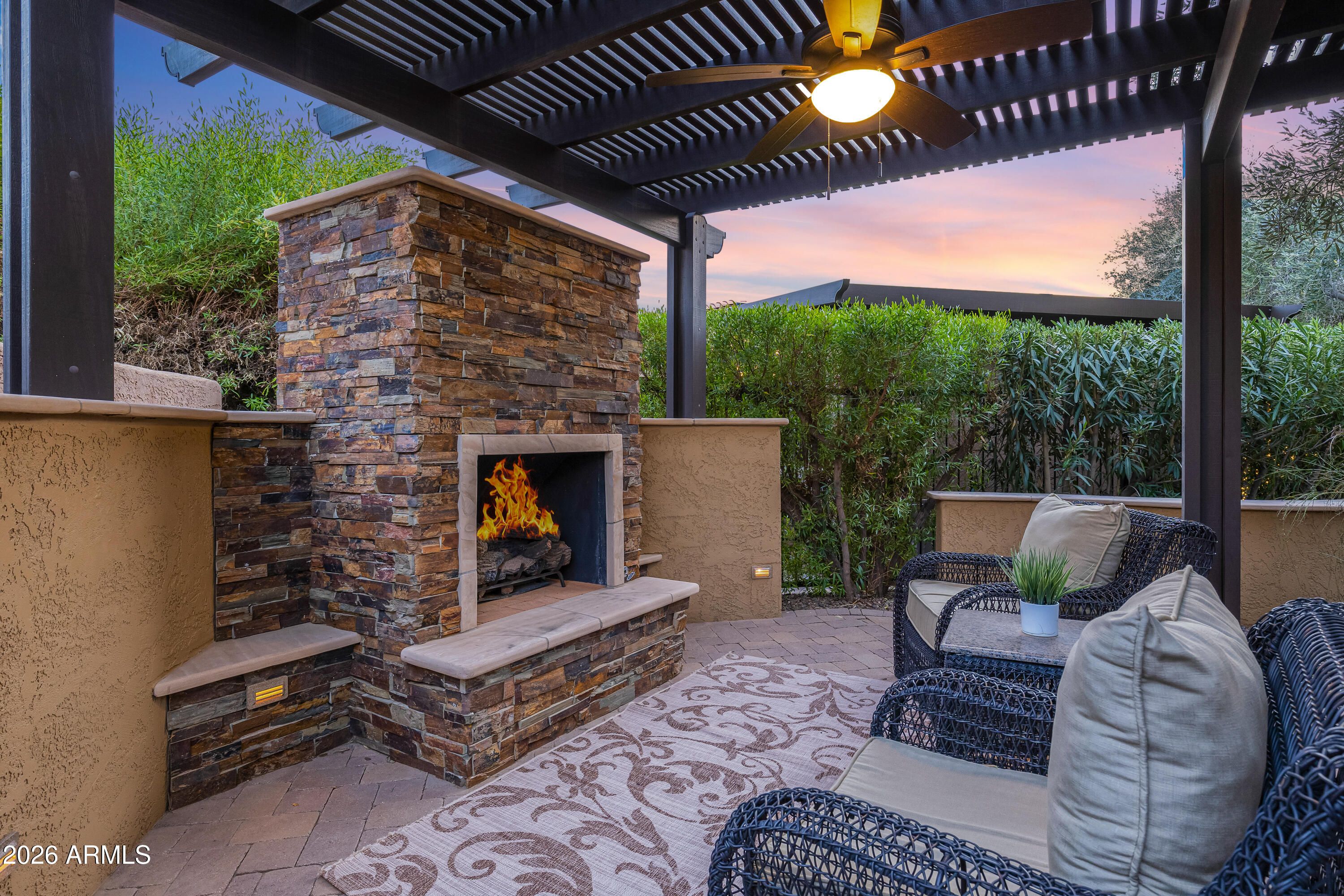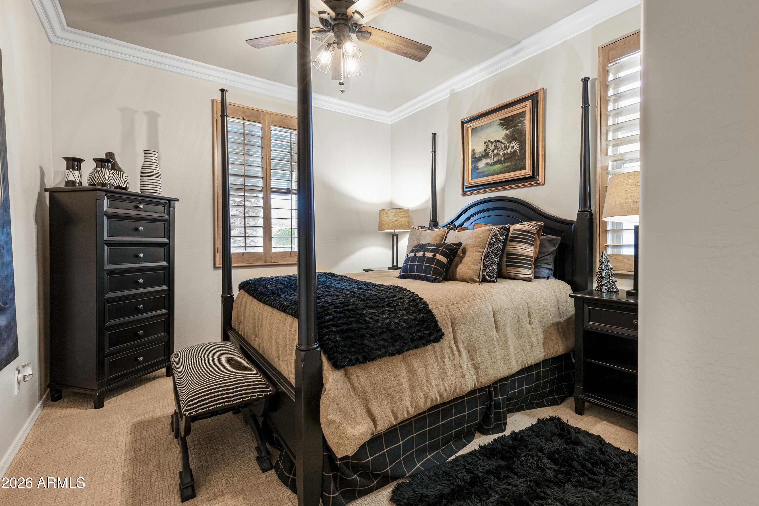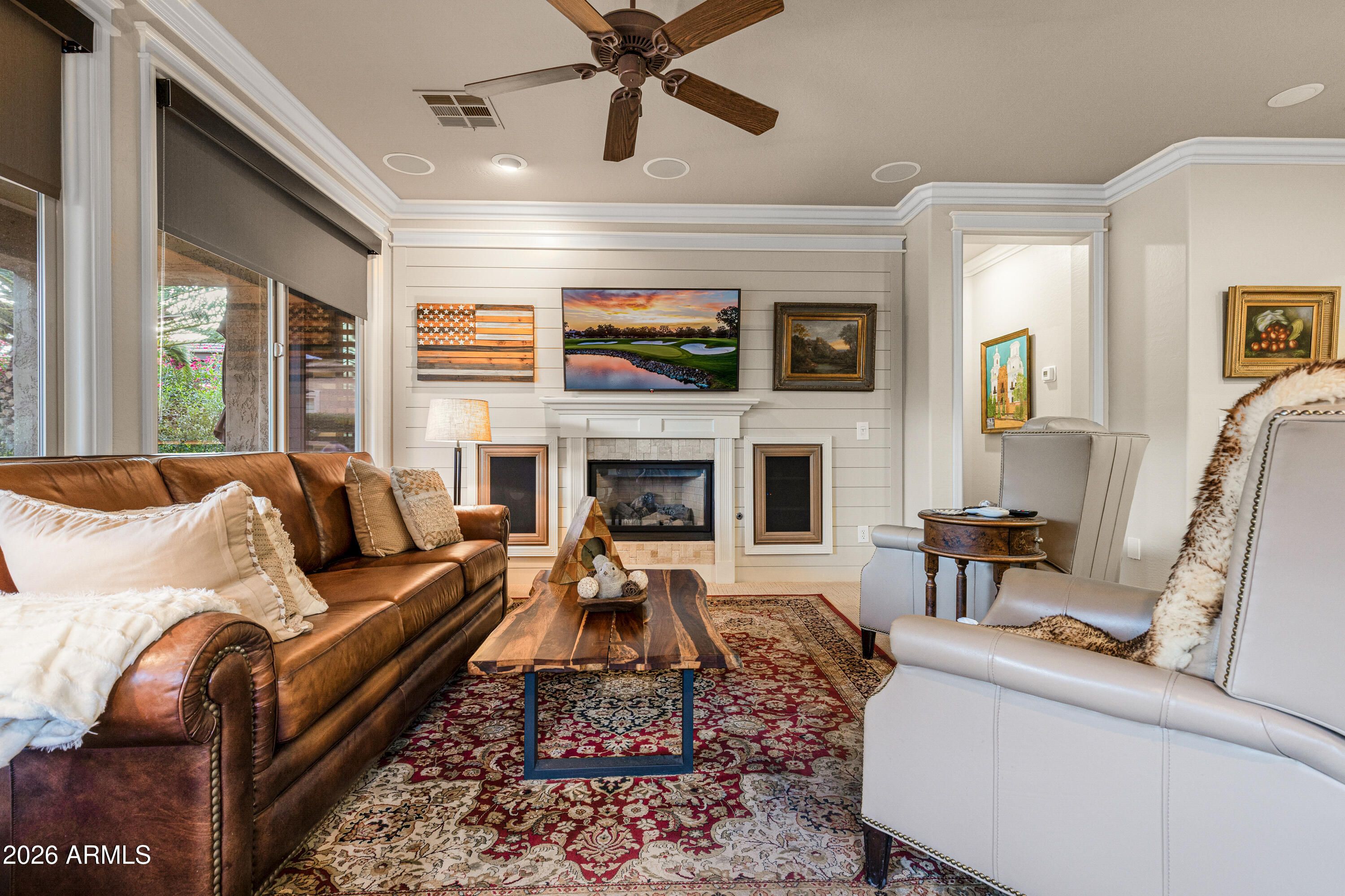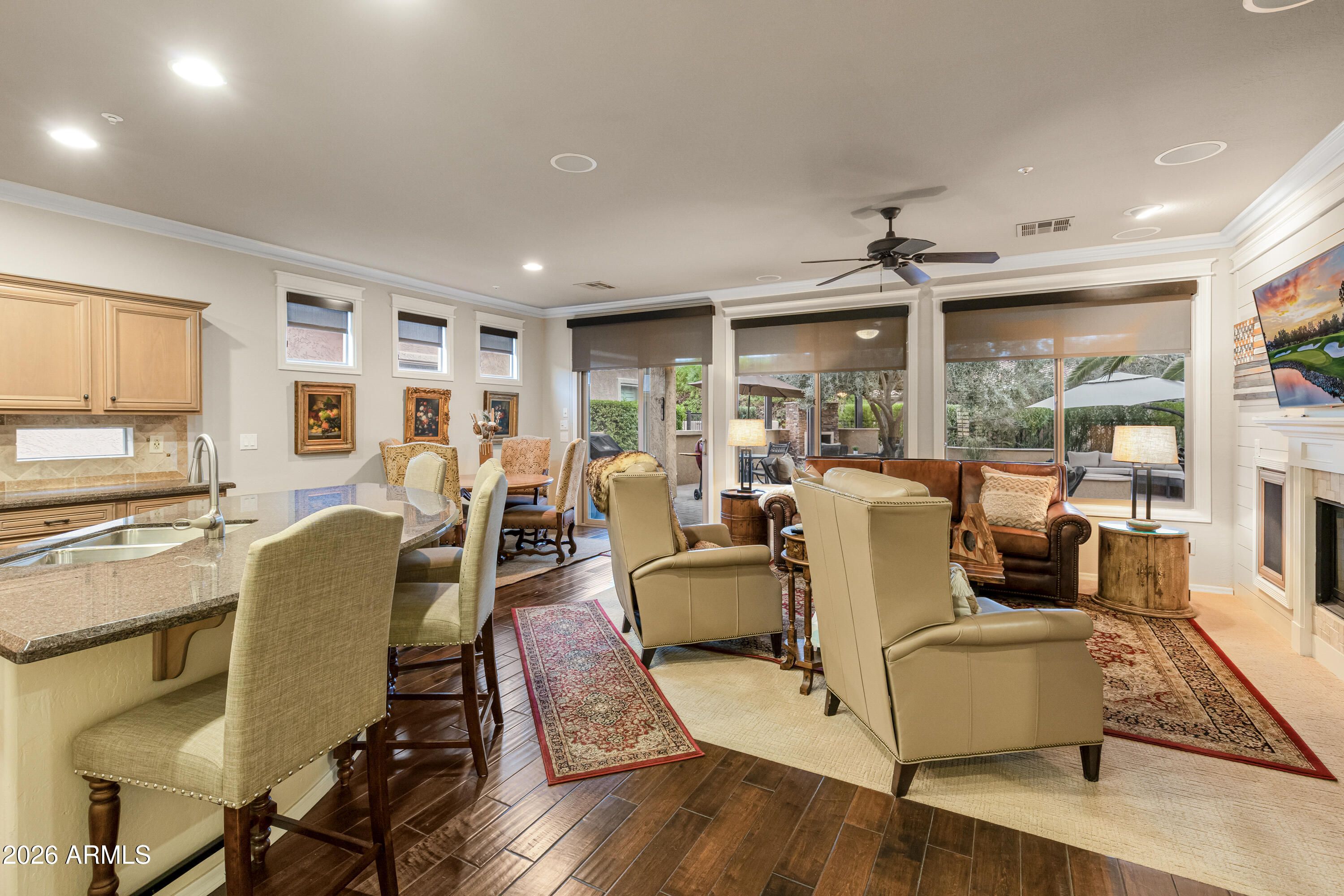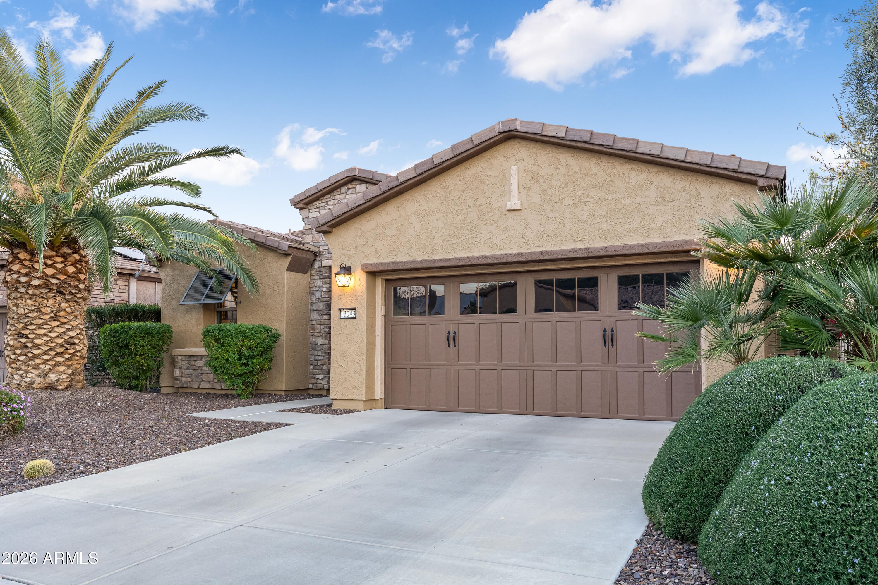 ULTIMATE SMALLER TURNKEY HOME & SETTING. Nestled on a private, south-facing lot, this impeccably maintained 2008 Rivas model showcases exceptional craftsmanship and designer upgrades throughout. From the moment you arrive, the elegant entry impresses with a door featuring sidelights, decorative wood panel accent wall with chair rail, crown molding, recessed can lighting, and refined two-tone paint complemented by decorative trim above doors and windows. The chef's kitchen is both beautiful and functional, featuring premium granite slab countertops, a travertine tile backsplash, staggered upper cabinetry, pantry, reverse osmosis system, and a curated mix of LG and GE appliances—perfectly designed for entertaining and everyday living. The great room is a true showpiece, highlighted by a custom-built shiplap media wall with integrated storage units, gas fireplace wrapped in travertine tile surround, decorative wood panel accents, surround sound, and roller sunscreen shades, all overlooking the serene backyard oasis. The owner's suite offers a private retreat with plush low-nap carpet, upgraded ceiling fan, private door to the backyard, and a spa-inspired bath featuring quartz countertops and backsplash, upgraded lighting, faucets, and fixtures, plus a stunning chiseled-edge porcelain tile shower with heavy glass enclosure. A thoughtfully designed guest suite includes a built-in Murphy bed and desk with an adjacent full bath beautifully finished with tiled countertops and a shower surround. Central Vac ! Step outside to a true backyard paradise featuring a huge extended patio with a custom ceiling, surround sound, recessed can lighting, ceiling fans, and elegant pavers. Entertain with ease thanks to a BBQ gas stub, a built-in stacked-stone fireplace under a pergola, and a separate gas fire pit. A four-foot privacy wall with integrated path lighting frames the space, while lush, mature landscaping with natural boulders creates a serene retreat. The show-stopping Pineapple Palm is truly a must-see to be believed.