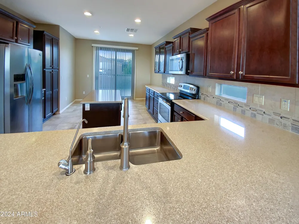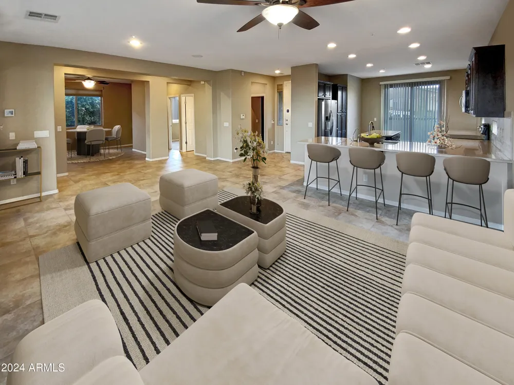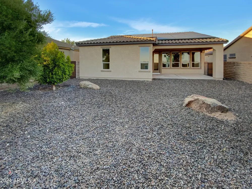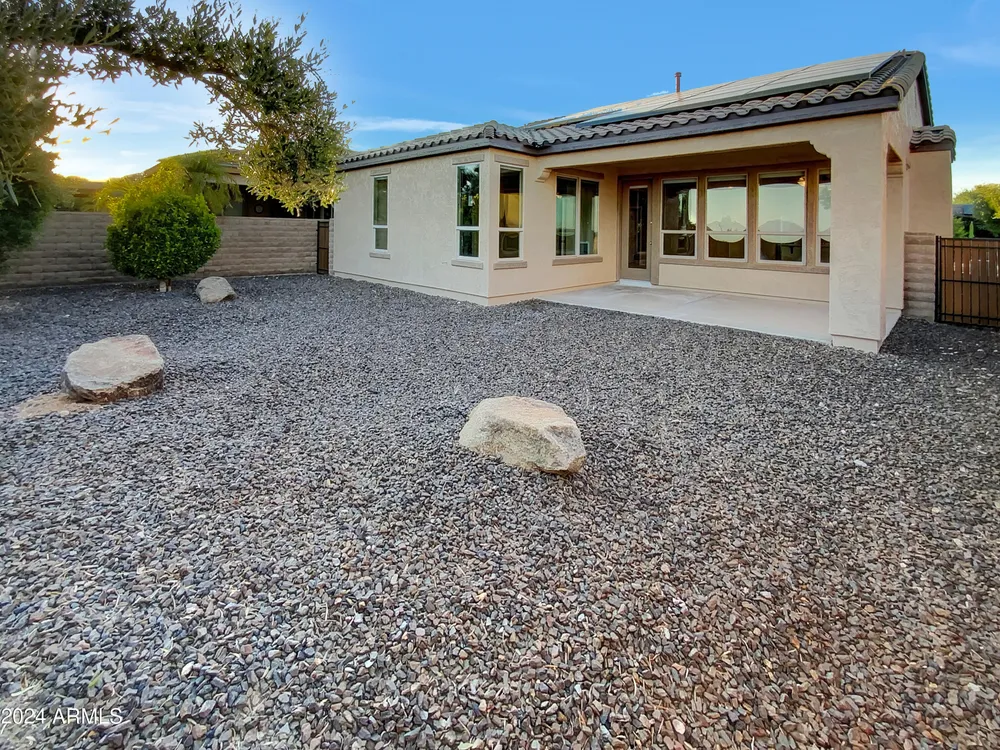 Included 100-Day Home Warranty with buyer activation. Welcome to this beautiful home in Trilogy in Vistancia, a 55+ community. Large courtyard. Two bedrooms plus a den. The interior is designed with a neutral color paint scheme that all stainless steel appliances and accent backsplash in kitchen and a center island. The primary bedroom features a walk-in closet and an ensuite bathroom with double sinks. Partial flooring replacement adds a fresh touch. enjoy the covered patio overlooking a fenced-in backyard, surrounded by low maintenance landscaping. Be sure to visit the Kiva Center, the hub of Trilogy to view the community pool, and many activities that are available!