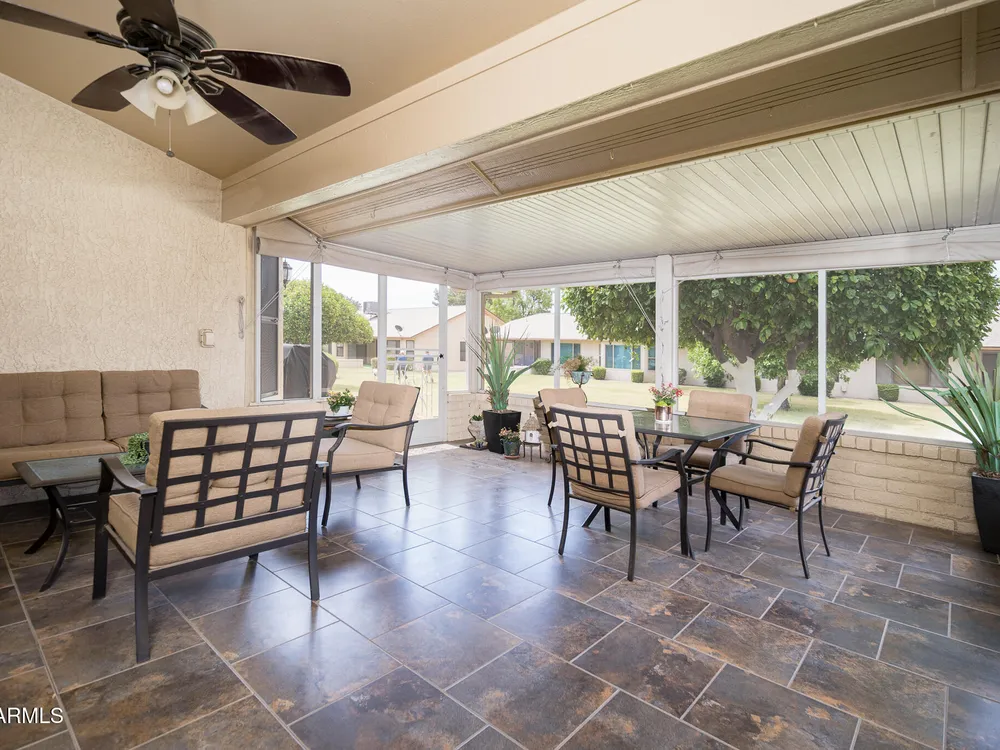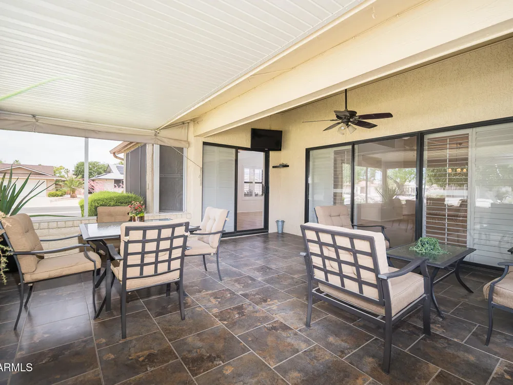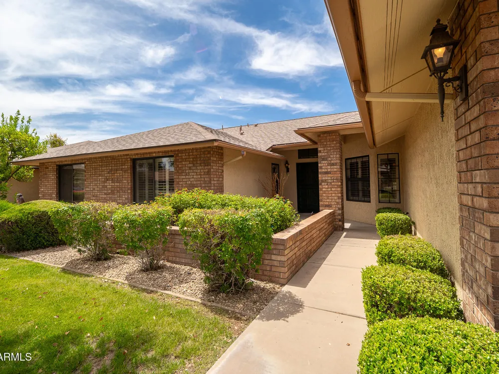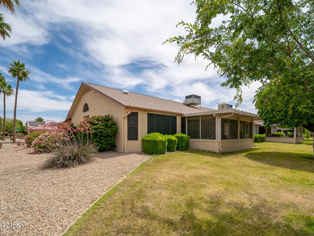 PRICE IMPROVEMENT! Welcome to this pristine, meticulously maintained home nestled on a beautifully manicured corner lot, showcasing the popular Gemini floor plan & a charming brick façade that adds timeless curb appeal. A graceful water fountain feature greets you at the front entrance, setting a tranquil tone as you step inside. Vaulted, flat ceilings create a sense of openness, while plantation shutters throughout add a touch of elegance. Solar tubes bring in an abundance of natural light, enhancing the home's warmth. The kitchen features sleek Corian countertops, raised panel cabinetry with convenient pull-out shelves, a built-in workspace, & task lighting. An R.O. system provides fresh, filtered water at both the tap & refrigerator. A spacious utility room offers additional cabinetry works great as a home office or hobby space. The large primary bedroom invites relaxation with a cozy, padded window seat & a generous walk-in closet. The ensuite is well-designed with double vanities & a separate space for the toilet & shower. Step outside to the oversized patio, fully screened-in with a tiled floor & drop-down shades offering privacy & shade. The garage features epoxy-coated floors & ample storage, making organization simple and efficient. Live your best life in Sun City West, the Active Adult community brimming with beauty and first-rate amenities to keep you engaged all year round! Residents enjoy 4 Rec Centers, 7 Beautiful Golf Courses, a Sports Pavilion and activities galore!