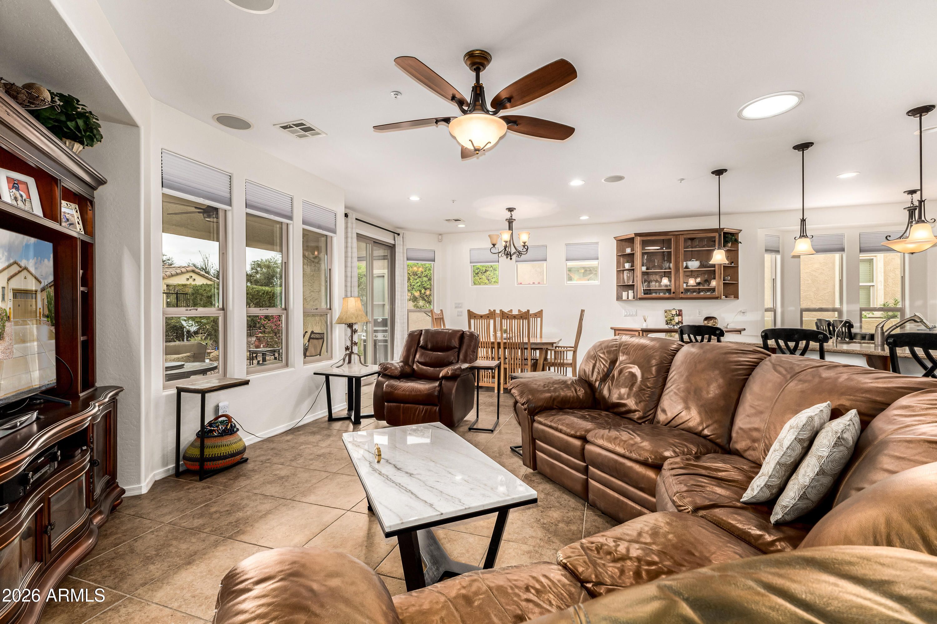 A floor plan that rarely comes on the market. This upgraded and RECENTLY REFRESHED Solis offers 2BR + DEN and over 1,800 SF with an open Great Room layout ideal for entertaining. Major features include a private backyard retreat with EXTENDED COVERED PAVER PATIO, multiple seating areas and PUTTING GREEN, REMODELED BATHROOMS with upgraded showers, NEW TILE FLOORING in bedrooms and baths, SURROUND SOUND indoors and on the patio, Allen-Roth CELLULAR SHADES, 2-FT EXTENDED GARAGE, and NEWER A/C. The expansive kitchen features stone countertops, TILED BACKSPLASH, stainless steel appliances with GAS RANGE, pendant lighting, STAGGERED CABINETRY with PULL-OUT DRAWERS, breakfast bar, pantry, built-in hutch, and BAY WINDOW dining area -- all opening seamlessly to the Great Room. The primary suite offers a SLIDING GLASS DOOR with direct patio access and walk-in closet with CUSTOM ORGANIZER. Spacious den includes GLASS FRENCH DOORS. Additional highlights: North/South exposure, tubular SKYLIGHT, 18" diagonal tile, 5 ceiling fans, security system, water softener, R/O system, Nest smart thermostat, low-maintenance landscaping, and private SIDE COURTYARD with RETRACTABLE AWNING and privacy wall.Welcome to the active adult community of Trilogy at Vistancia where you will find outstanding amenities, including 2 clubhouses, pickleball, tennis, bocce ball, fitness centers, swimming & golf, just to name a few! Trilogy is part of the community of Vistancia, a master-planned development that includes beautiful homes, parks & hiking trails, award-winning community centers & golf courses, commercial & retail shops, along with incredible rolling hills & desert landscape all around! The future 320-acre 5 North at Vistancia commercial core is coming soon, home to the new ALA K-12 charter school. Vistancia has ranked as the #1 Master Planned Community in AZ for 13 years in a row (2013-2025)! Resort-style living at its best. Come & see why!