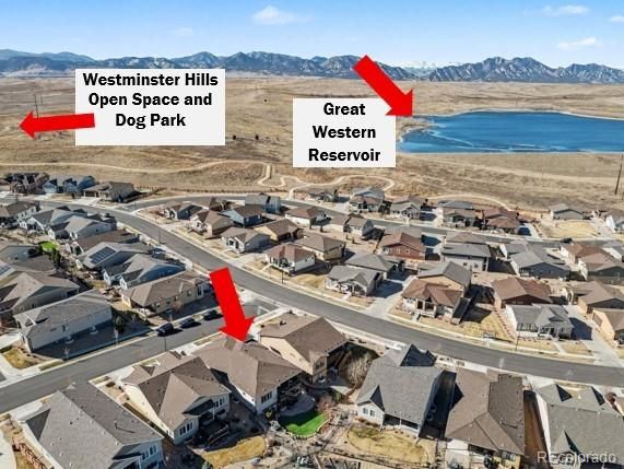 Now you can live in the premier active 55+ community of Skyestone! 13063 Sandstone Drive is full of luxury upgrades and sits on a unique lot specifically chosen by the original owner for privacy. More than $130,000 in upgrades have been added including upper and under cabinet lighting and premium appliances in the kitchen (Wolf Gas Range, Thermador Double Ovens, Bosch Dishwasher); a custom closet system in the primary bedroom; a tankless gas water heater, whole house humidifier, a water conditioner and filtration system; and custom window coverings. The interior of the home is finished in a modern, elegant style–from the sparkling chef’s kitchen to the spacious and bright great room. The private primary suite offers a spa-like retreat with a generous walk-in shower. A comfortable guest room, guest bath, a study, laundry and mudroom round out the main floor. The unfinished basement offers great storage or the room to expand your living space. Entertain on the elevated back deck or the extended patio and enjoy the extensive, professional landscaping (French drains, retaining wall, artificial turf, fencing). The community's Skyestone Lodge offers resort-style amenities, including an outdoor pool and hot tub, pickleball courts, fitness center, billiards, and scenic trails. Just 15 minutes to Boulder and under 30 minutes to downtown Denver, this home offers easy access to city conveniences, while also providing a peaceful, suburban lifestyle. The Westminster Hills Dog Park and Standley Lake Recreation Area and Wildlife Refuge are a short walk away. There’s also a quaint Par 3 golf course and the Omni Interlocken Golf Course nearby. Buyer is required to pay $2,292 as a private transfer (community enhancement) HOA fee at closing.