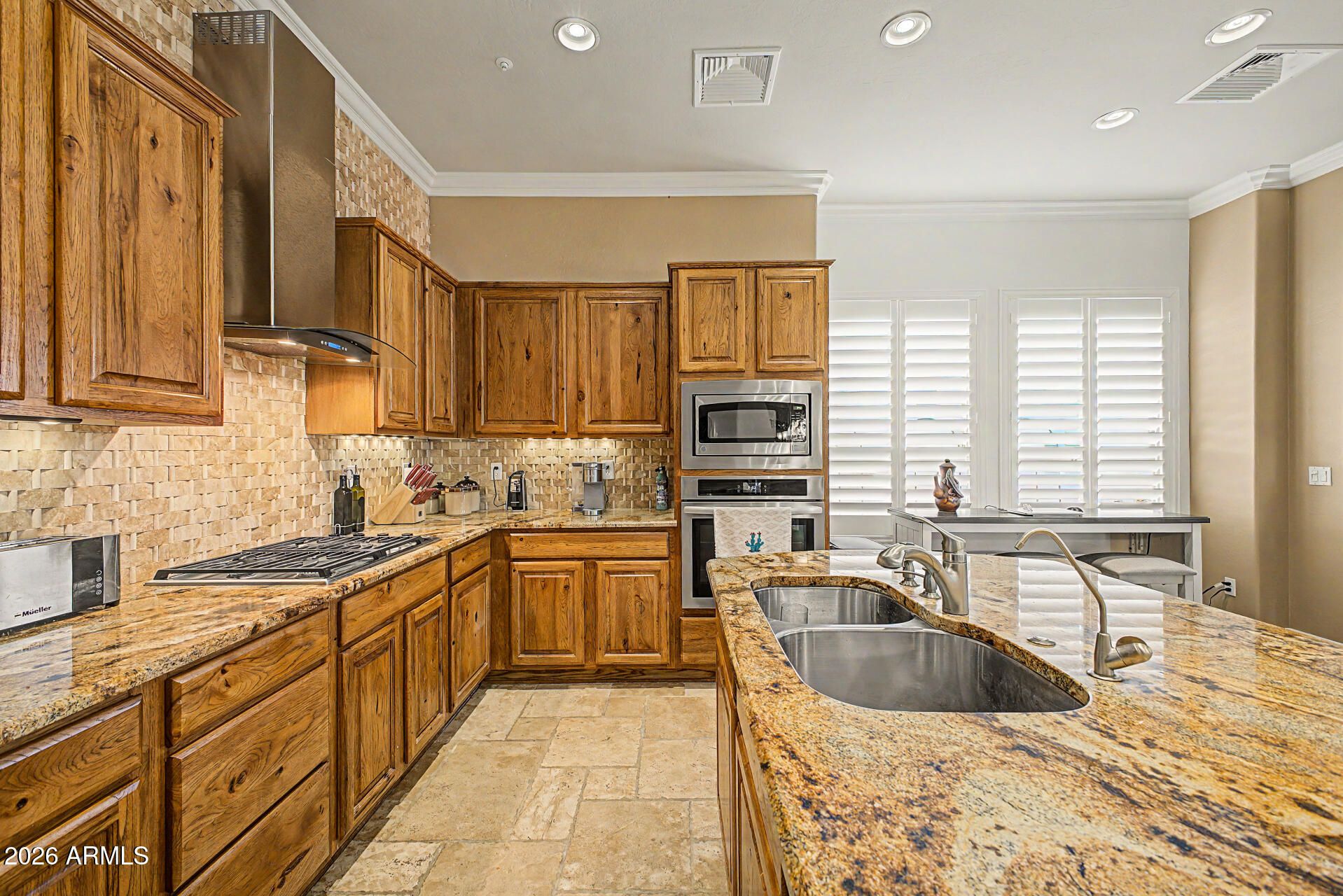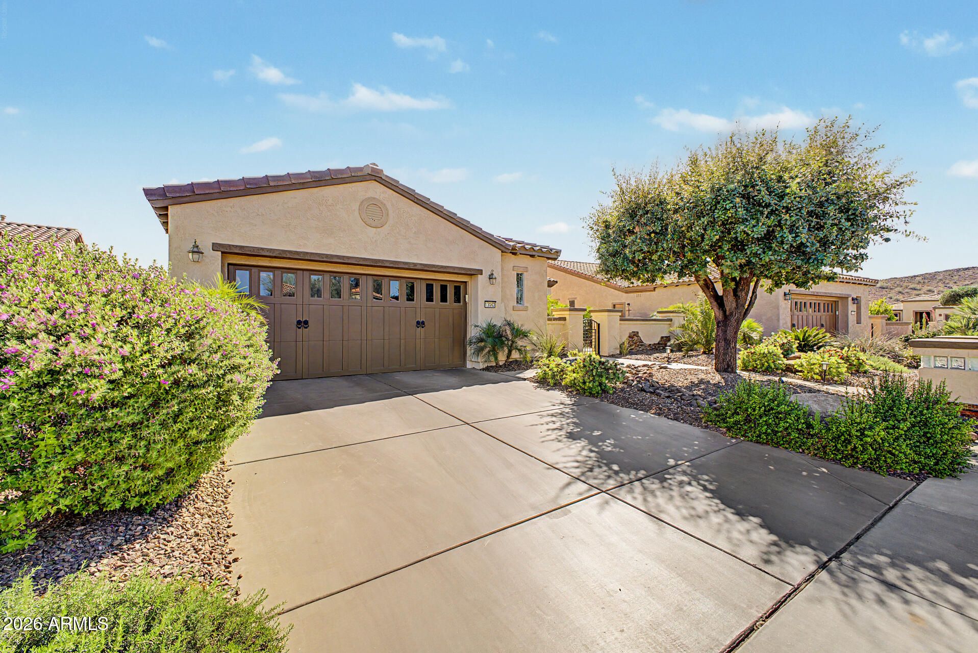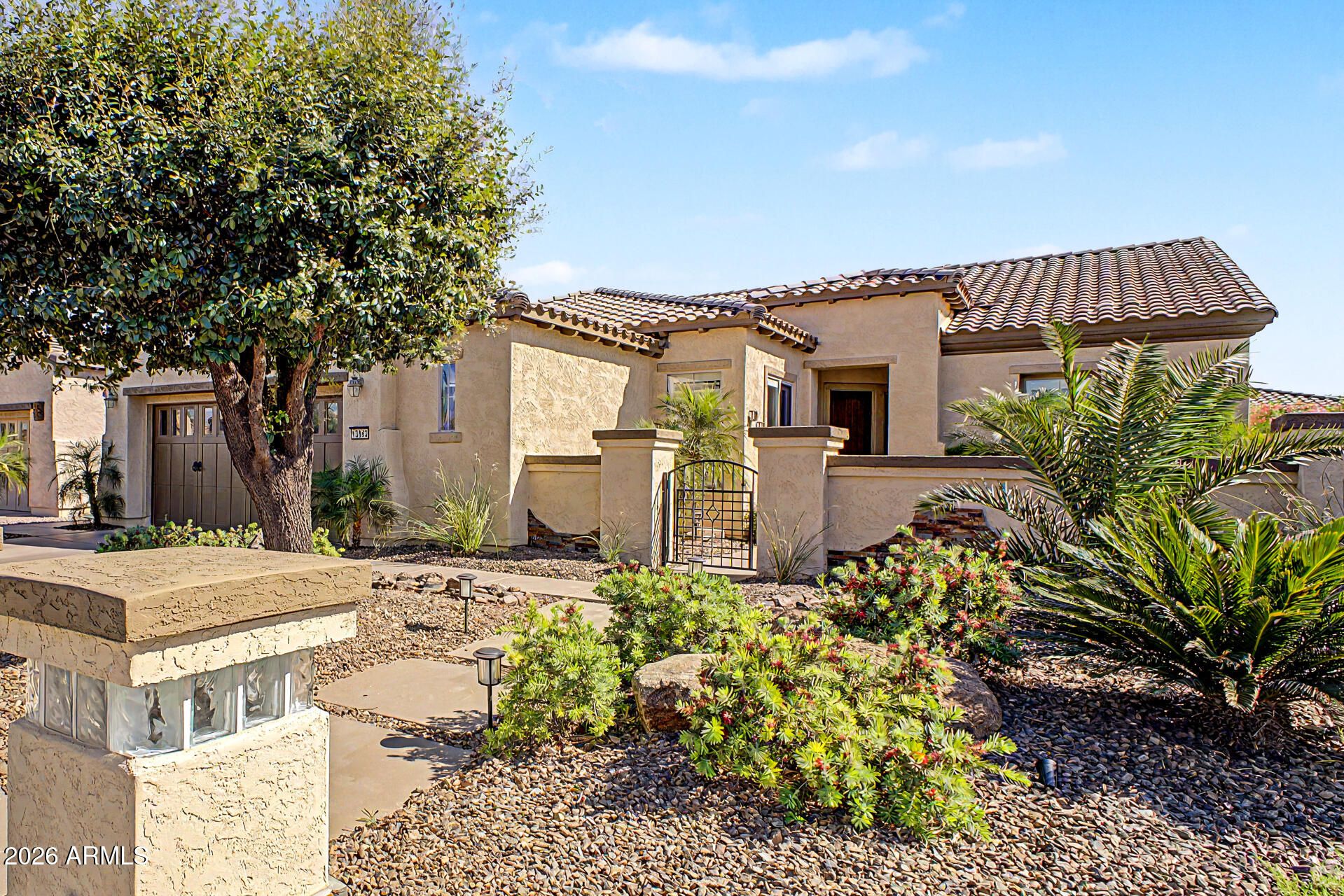 This stunning and highly upgraded Serenitas model is being offered fully furnished -- everything you see is included -- making it truly move-in ready and effortless for its next owner. Ideally situated on a private lot in the gorgeous 55+ community of Trilogy at Vistancia, this home delivers the ultimate in comfort, style, and convenience From the moment you arrive, you'll be captivated by the charming front gated courtyard, beautiful desert landscaping, and inviting curb appeal. Step through the rotunda entry and experience a light-filled, open-concept layout showcasing soaring ceilings, elegant crown molding, tall baseboards, rich stone tile flooring, modern plantation shutters, and designer lighting throughout. The chef's kitchen is truly the heart of the home, featuring gorgeous . . . granite countertops, custom wood cabinetry, a striking backsplash, upgraded lighting above and below the cabinets, stainless steel appliances including a Wolf gas cooktop and Electrolux ventilation hood, a newer refrigerator, a reverse osmosis system, and an oversized peninsula island--perfect for gathering and entertaining. The spacious great room flows seamlessly to the expansive covered patio, creating the ideal indoor-outdoor living experience. Enjoy serene mountain views and lush, mature landscaping in your private backyard retreat, complete with pavers, a gas BBQ hookup, additional lighting, and plenty of space for dining, relaxing, and entertaining. The luxurious primary suite offers a peaceful escape with a beautiful bay window, plush carpeting, dual closets, and a fully updated ensuite bath featuring granite countertops, dual sinks, and an oversized walk-in tile shower with a three-way spray system, including a rain shower head. On the opposite side of the home, guests will enjoy a private bedroom with newer carpet and an updated bath with matching finishes. A versatile den with sliding glass doors to the courtyard provides the perfect space for a home office or optional third bedroom. The extended 2.5-car garage is a standout feature, offering epoxy floors, added lighting, a utility sink, a new hot water heater, and ample space for vehicles, storage, or even a golf cart. Additional upgrades include owned solar for energy efficiency, newer HVAC (approx. 2 years old), a new water softener (2025), and many thoughtful exterior enhancements. Enjoy resort-style living in guard-gated Trilogy at Vistancia, offering world-class amenities including golf, indoor and outdoor pools, fitness centers, spa and salon services, tennis, pickleball, endless clubs and activities, and miles of scenic walking and biking trails.