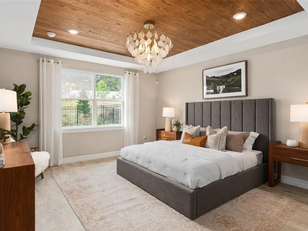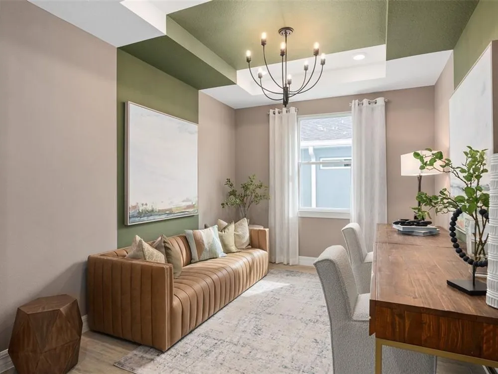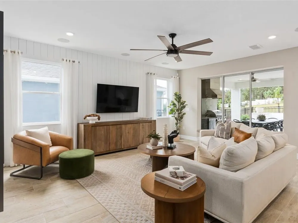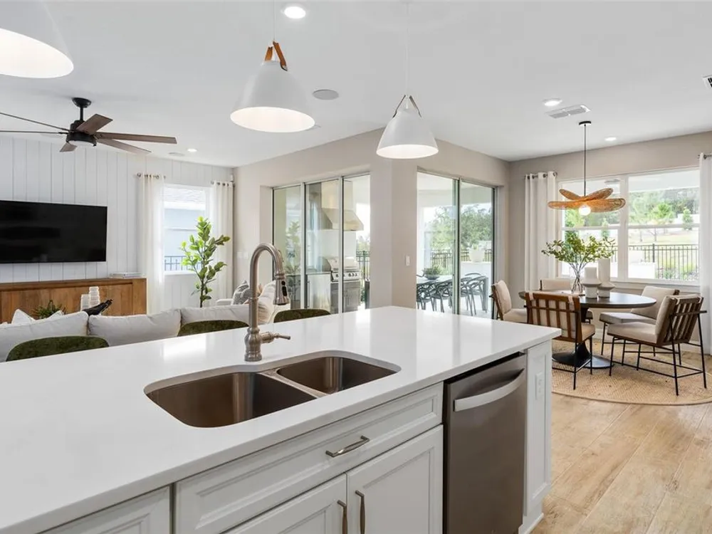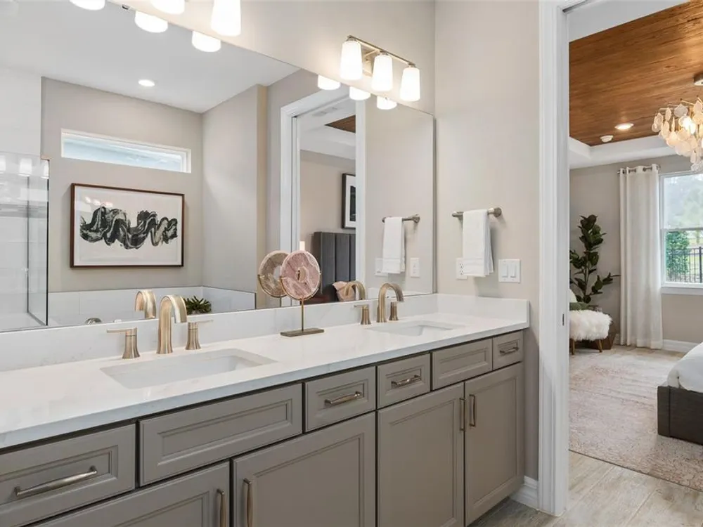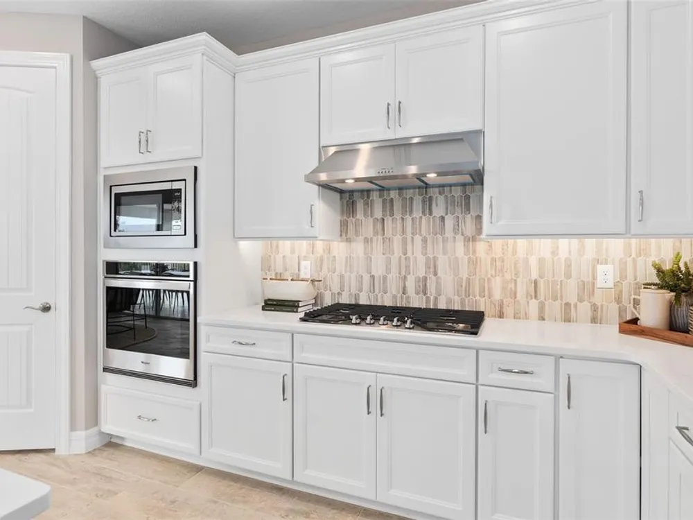 Under Construction. All photos and videos shown are of model homes. All homes are sold unfurnished. Del Webb Oasis offers the famous 55+ lifestyle and a location just minutes away from world-famous Orlando attractions! This world-class, resort-style luxurious boutique community features natural gas single-family and villa homes nestled in wooded conservation. Del Webb Oasis offers an abundance of resort-style amenities with social events and activities centered in the clubhouse and planned by a full-time Lifestyle Director. The amenities include a resort-style zero-entry pool with lap lanes and sun shelf, private poolside cabanas, a spa and outdoor fire pits with fireworks views, a community fitness center, tennis and pickleball courts, a walking trail with exercise stations, and more! Get spoiled at Del Webb Oasis - after all, this is your time. Del Webb Oasis’s exclusive resort amenities and prime location make this the ideal neighborhood and a perfect location to call home. Your dream home awaits at Del Webb Oasis – visit us today! Step into the luxurious Mystique home, a masterpiece of modern living designed with elegance and practicality in mind. This newly constructed, single-story home offers 2 spacious bedrooms, 2 beautifully appointed bathrooms, and an enclosed flex room—perfect for a home office or quiet retreat. The open-concept layout seamlessly connects the gourmet kitchen, café, and gathering room, creating an expansive, airy atmosphere. The many windows bathe the entire space in natural light, while the tray ceiling in the gathering room adds an extra touch of sophistication, elevating the overall feeling of openness. The heart of the home is the chef-inspired kitchen, where 42" White Winstead cabinetry with bronze gold hardware meets luxurious Marengo Siltestone Quartz countertops. Thoughtfully designed features like soft-close drawers, easy-reach corner cabinets, double roll-out trays, and a waste basket drawer make the kitchen as functional as it is beautiful. A decorative dolomite iceberg fish scale backsplash and upgraded sink and faucet enhance the space, while the built-in Whirlpool stainless steel appliances—including a refrigerator—ensure you have everything you need for both everyday meals and special occasions. Retreat to the luxurious owner’s suite, a serene sanctuary with a spacious walk-in closet and a spa-like en suite bathroom. Dual vanity sinks, a walk-in shower, an enclosed toilet, and a linen closet complete the tranquil space. The additional spare bedroom and bathroom, along with the enclosed flex room, provide ample space for family and guests. The laundry room includes a washer/dryer making daily tasks a breeze. Every detail of this home has been carefully curated, from the Lumber Honey wood-look tile floors throughout. Enjoy the convenience of modern living with a smart thermostat and doorbell, additional LED downlighting, additional media and data ports, and Digital IP Camera Pre-Wire. The 2-car garage offers extra tandem storage space, ensuring that every part of your home is both beautiful and practical. With its stunning design and thoughtful touches, the Mystique home provides the perfect blend of luxury and functionality for today’s lifestyle.