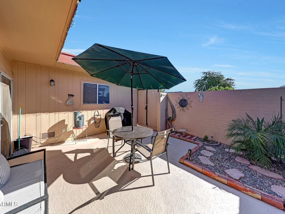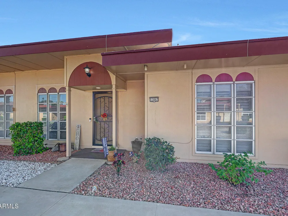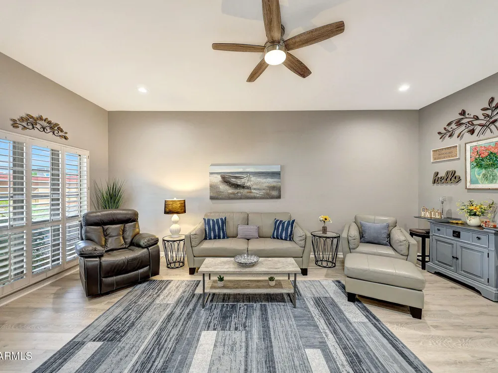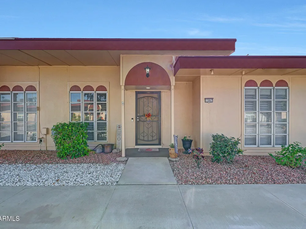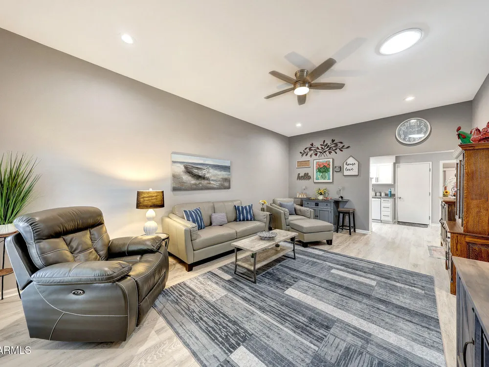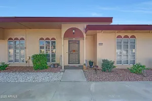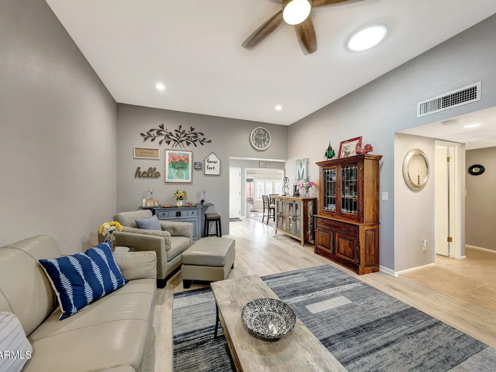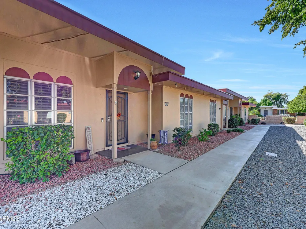 Welcome to the GA202 Model Home in the Heart of Sun City! Step into this charming and meticulously updated home that offers both comfort and peace of mind. One of the standout bonuses in this property is the wiring upgrade to copper, a significant improvement that enhances safety, reliability, and future resale desirability. From the moment you enter, you'll notice thoughtful updates and stylish improvements throughout the home. The once-dated popcorn ceilings have been completely removed, creating a fresh, modern feel with clean lines and an open, airy ambiance. Every room is equipped with ceiling fans, helping to maintain a cool, comfortable environment year-round—perfect for Arizona living. The HVAC system was updated in 2023, ensuring efficient climate control and lower energy bills, while the roof was re-coated that same year, providing an extra layer of protection and extending the life of the roof for years to come. Inside, the home features a blend of durable laminate and tile flooring, offering both style and easy maintenance ideal for everyday living or entertaining guests. The kitchen is truly the heart of the home, thoughtfully redesigned to blend functionality with modern aesthetics. It features beautiful quartz countertops, updated cabinetry with ample storage, a deep and stylish farm-style sink, and a bright skylight that floods the space with natural light, creating an inviting atmosphere to cook, dine, and gather. Both bedrooms are generously sized and include walk-in closets, providing abundant storage and organization space. Whether you're downsizing or just starting out, these rooms offer both comfort and practicality. The bathroom has also been tastefully updated, featuring a modern vanity, a newer toilet, and yet another skylight that adds brightness to your daily routine. With all these thoughtful upgrades and improvements already in place, this home is truly move-in ready just bring your personal touches and start enjoying the relaxing, active lifestyle that Sun City is known for.