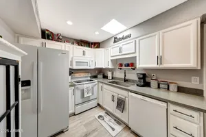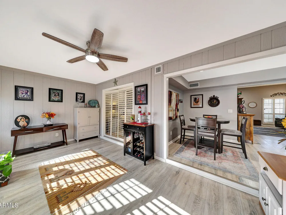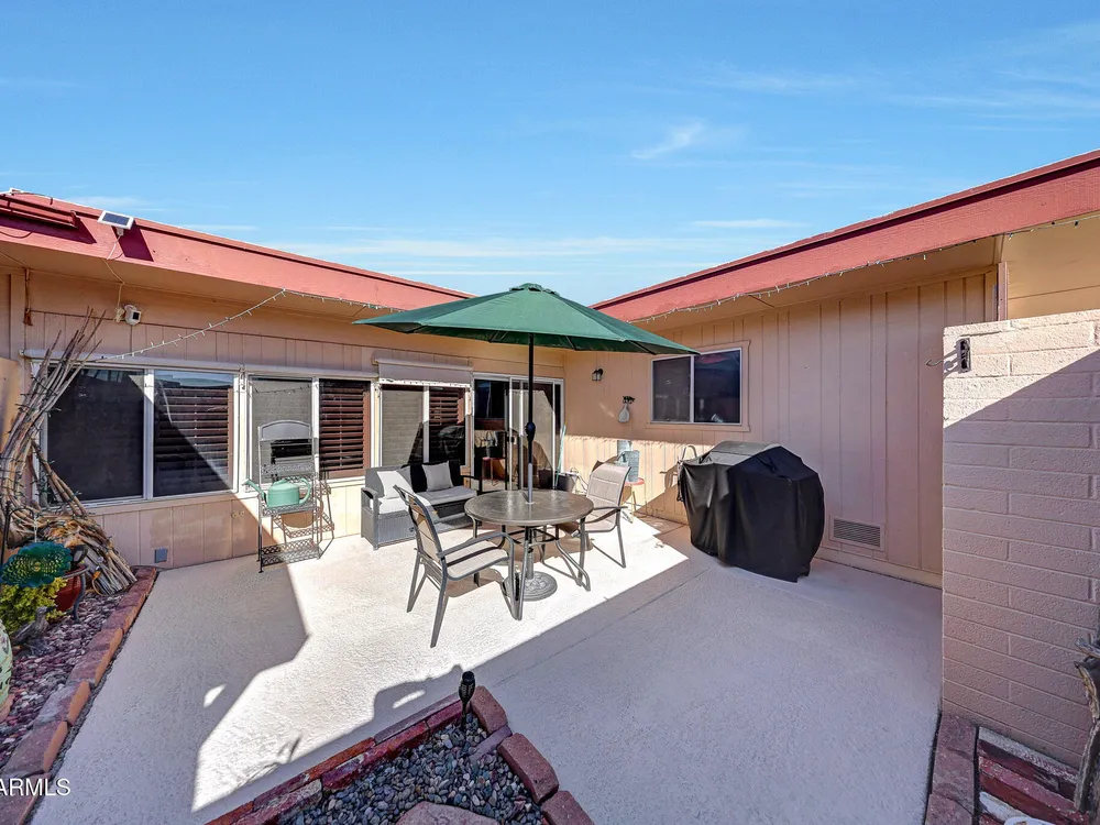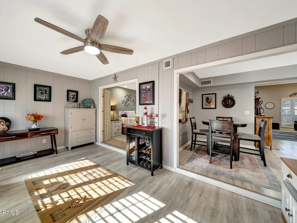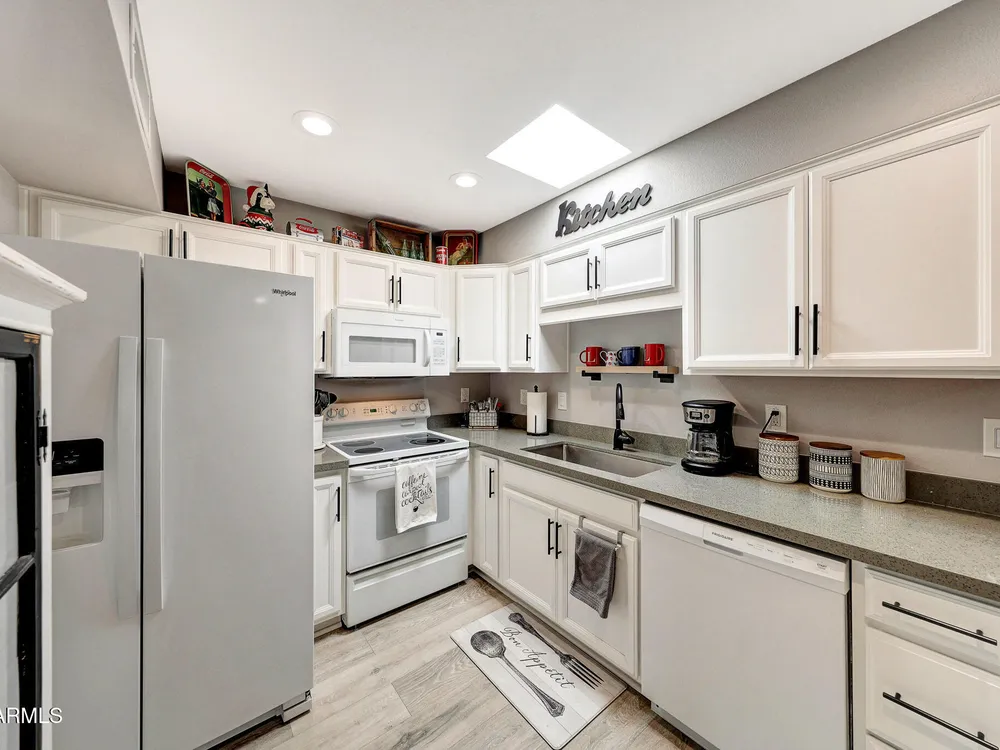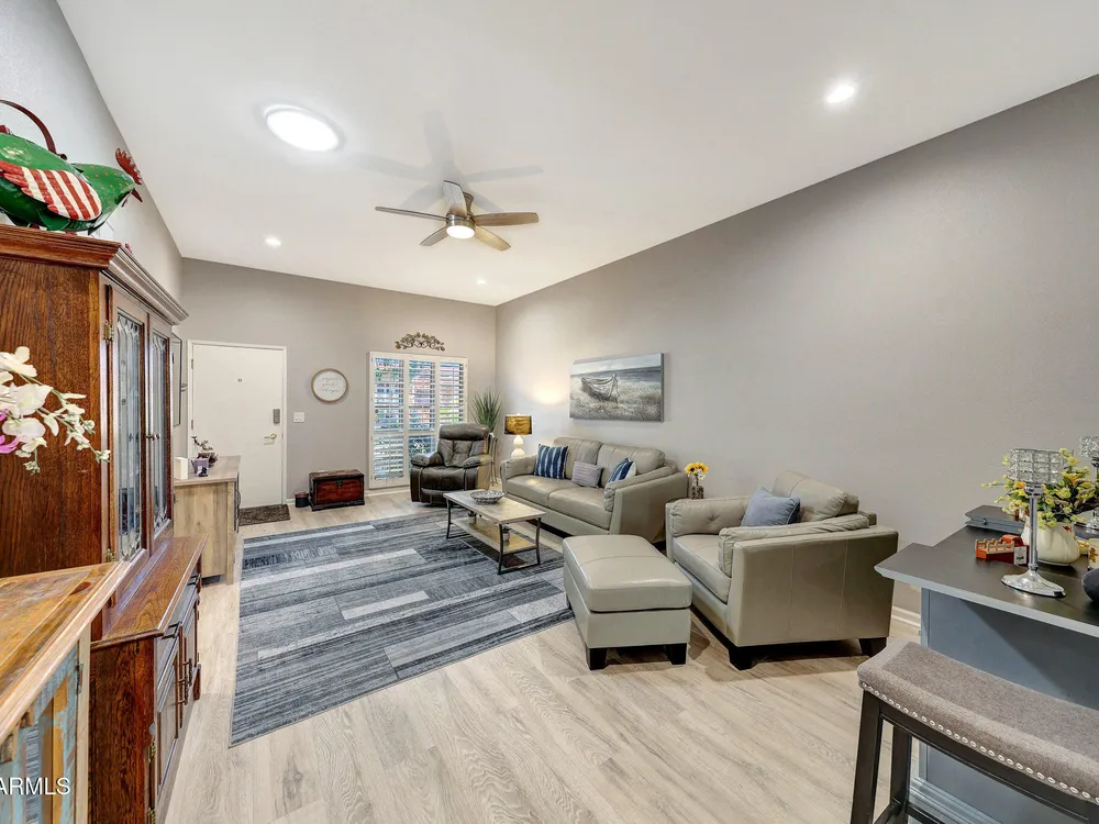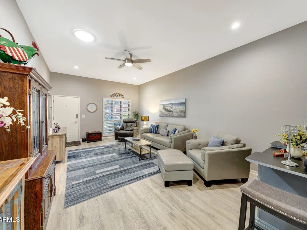 Welcome to the GA202 Model Home in the Heart of Sun City! Step into this charming and meticulously updated home that offers both comfort and peace of mind. One of the standout bonuses in this property is the wiring upgrade to copper, a significant improvement that enhances safety, reliability, and future resale desirability. From the moment you enter, you'll notice thoughtful updates and stylish improvements throughout the home. The once-dated popcorn ceilings have been completely removed, creating a fresh, modern feel with clean lines and an open, airy ambiance. Every room is equipped with ceiling fans, helping to maintain a cool, comfortable environment year-round—perfect for Arizona living. The HVAC system was updated in 2023, ensuring efficient climate control and lower energy bills, while the roof was re-coated that same year, providing an extra layer of protection and extending the life of the roof for years to come. Inside, the home features a blend of durable laminate and tile flooring, offering both style and easy maintenance ideal for everyday living or entertaining guests. The kitchen is truly the heart of the home, thoughtfully redesigned to blend functionality with modern aesthetics. It features beautiful quartz countertops, updated cabinetry with ample storage, a deep and stylish farm-style sink, and a bright skylight that floods the space with natural light, creating an inviting atmosphere to cook, dine, and gather. Both bedrooms are generously sized and include walk-in closets, providing abundant storage and organization space. Whether you're downsizing or just starting out, these rooms offer both comfort and practicality. The bathroom has also been tastefully updated, featuring a modern vanity, a newer toilet, and yet another skylight that adds brightness to your daily routine. With all these thoughtful upgrades and improvements already in place, this home is truly move-in ready just bring your personal touches and start enjoying the relaxing, active lifestyle that Sun City is known for.