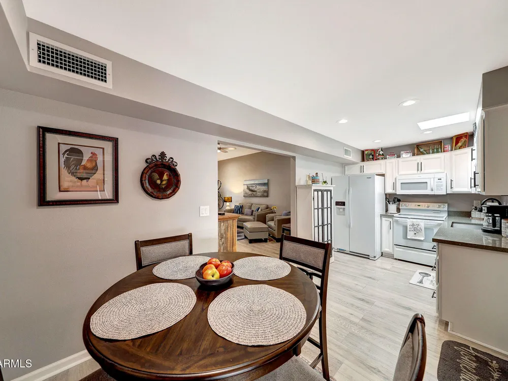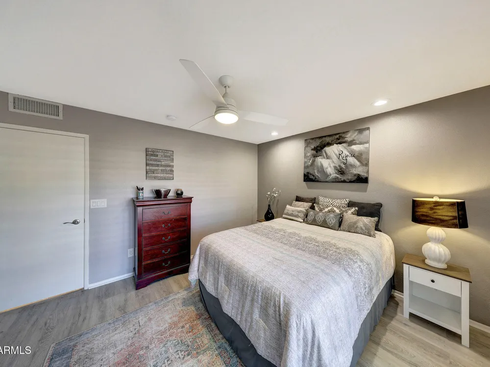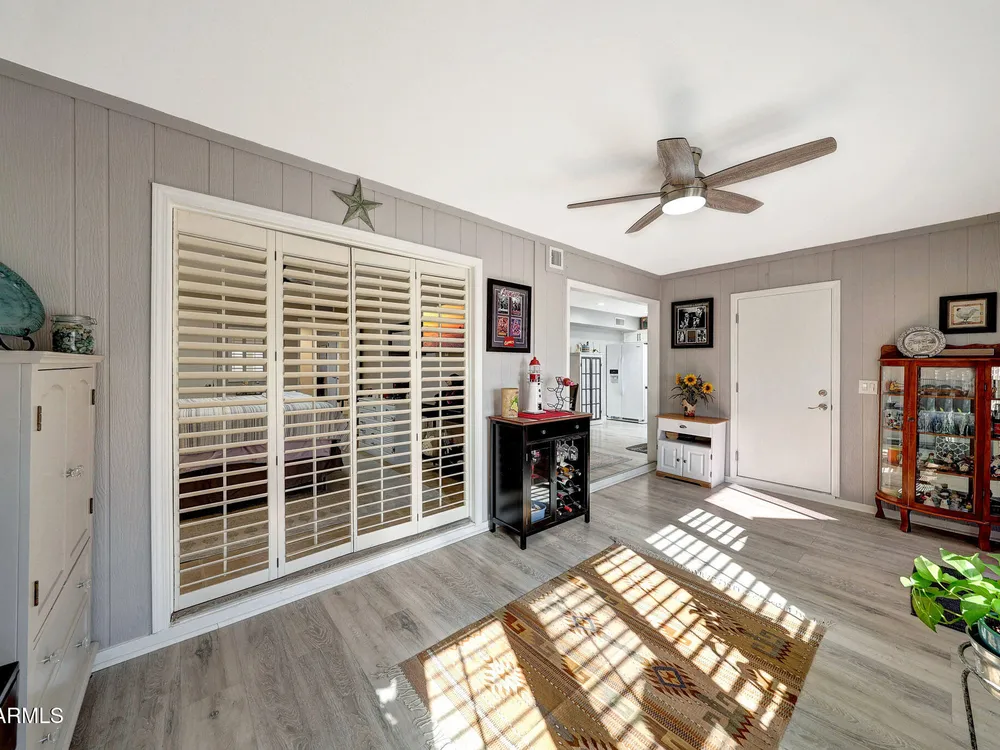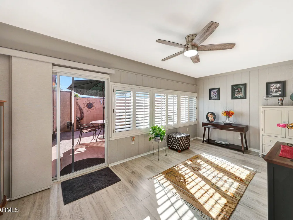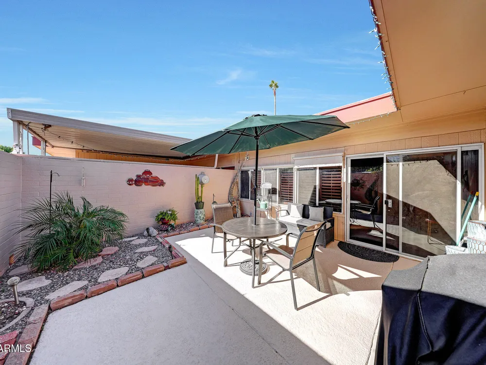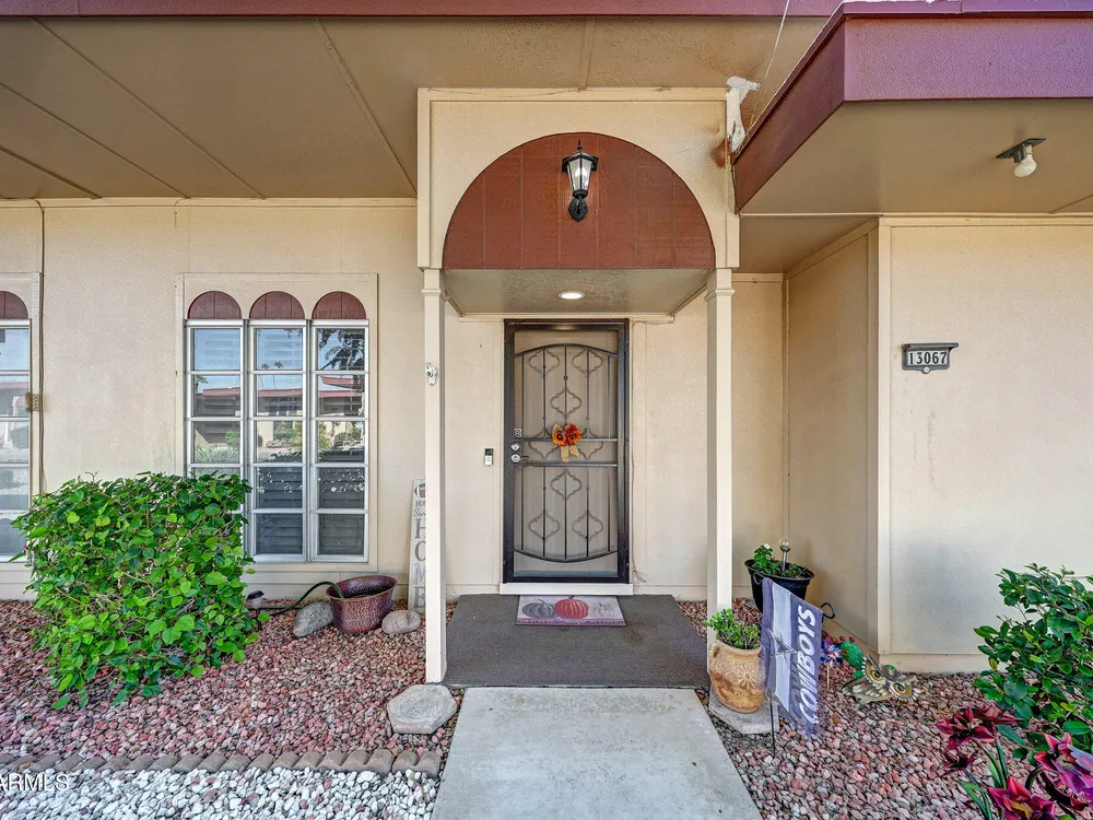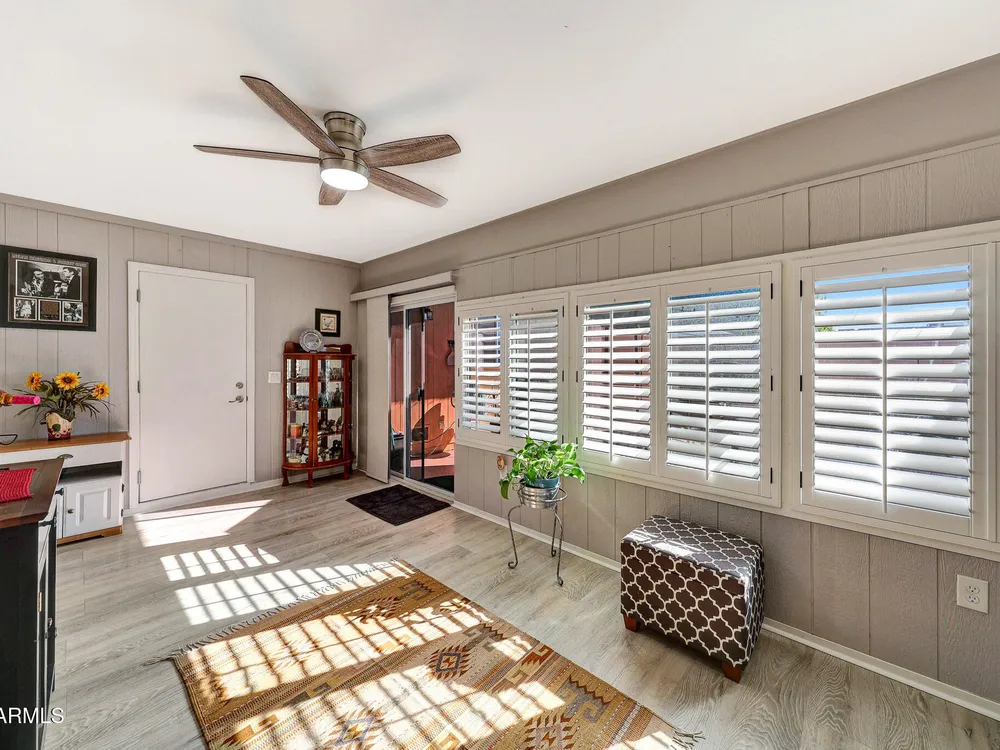 Welcome to the GA202 Model Home in the Heart of Sun City! Step into this charming and meticulously updated home that offers both comfort and peace of mind. One of the standout bonuses in this property is the wiring upgrade to copper, a significant improvement that enhances safety, reliability, and future resale desirability. From the moment you enter, you'll notice thoughtful updates and stylish improvements throughout the home. The once-dated popcorn ceilings have been completely removed, creating a fresh, modern feel with clean lines and an open, airy ambiance. Every room is equipped with ceiling fans, helping to maintain a cool, comfortable environment year-round—perfect for Arizona living. The HVAC system was updated in 2023, ensuring efficient climate control and lower energy bills, while the roof was re-coated that same year, providing an extra layer of protection and extending the life of the roof for years to come. Inside, the home features a blend of durable laminate and tile flooring, offering both style and easy maintenance ideal for everyday living or entertaining guests. The kitchen is truly the heart of the home, thoughtfully redesigned to blend functionality with modern aesthetics. It features beautiful quartz countertops, updated cabinetry with ample storage, a deep and stylish farm-style sink, and a bright skylight that floods the space with natural light, creating an inviting atmosphere to cook, dine, and gather. Both bedrooms are generously sized and include walk-in closets, providing abundant storage and organization space. Whether you're downsizing or just starting out, these rooms offer both comfort and practicality. The bathroom has also been tastefully updated, featuring a modern vanity, a newer toilet, and yet another skylight that adds brightness to your daily routine. With all these thoughtful upgrades and improvements already in place, this home is truly move-in ready just bring your personal touches and start enjoying the relaxing, active lifestyle that Sun City is known for.