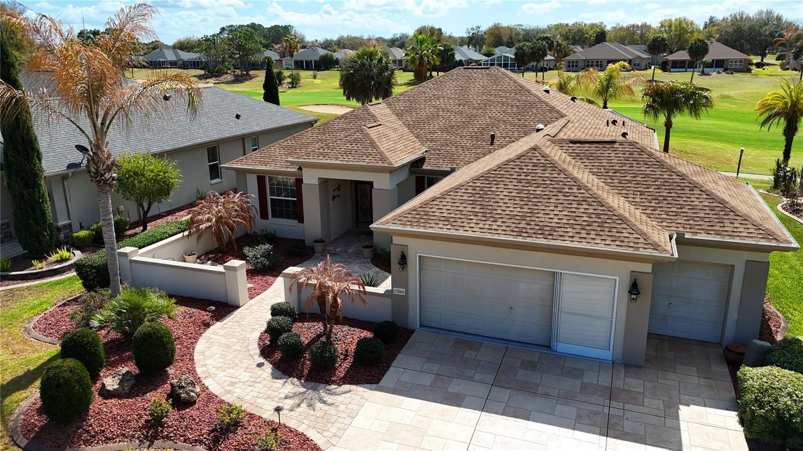 Location, location, location. Golf course frontage plus Peninsula Park (heated pool, pickleball and tennis) across the street from this beautiful home. Courtyard entry leads to the designer glass leaded double entry into the foyer with panoramic views of the golf course. When details matter, this home is for you. Crown molding and higher baseboard, central vac and porcelain tile on the diagonal throughout. This home features a library/office/bedroom (no closet) to the right of the foyer with French doors for entry and privacy. To the left of the foyer is the formal dining area. The main living area is open to the kitchen, dining nook (built-in storage) and the living room still with the same great views with sliders to climate controlled lanai with the birdcage extension. Kitchen features double pantries, counter height breakfast bar, granite counters, back splash and ungraded stainless steel appliances. Primary suite also has golf views plus en-suite bath with double door entry, raised vanities, garden tub and separate shower and a walk-in clothes closet. Granite counter tops and shower. The guest bedroom also features an en-suite bath with same . Inside laundry with storage galore! The enclosed lanai also has the porcelain tile on the diagonal with a mini split for year round climate control. The acrylic sliders can open up to the birdcage extension with awning if needed. Planting areas have been strategically placed to add even more tropical beauty to the area. Oversized 2-car garage (20 x 26) plus the golf cart garage of( 8 x 20) is complete with central vac, storage cabinetry galore plus hanging rack, utility sink, pull-down stairs for attic storage, key-less entry, designer floor, garage screens and workbench. Designer driveway with paver walkway to the home. HOME INFO: Shingles replaced (2023), water heater (2025), water softener (2020), HVAC 2010, attic re-piped, private irrigation well. Most furnishings are available for sale under a separate package. (Sellers taking a few select items).