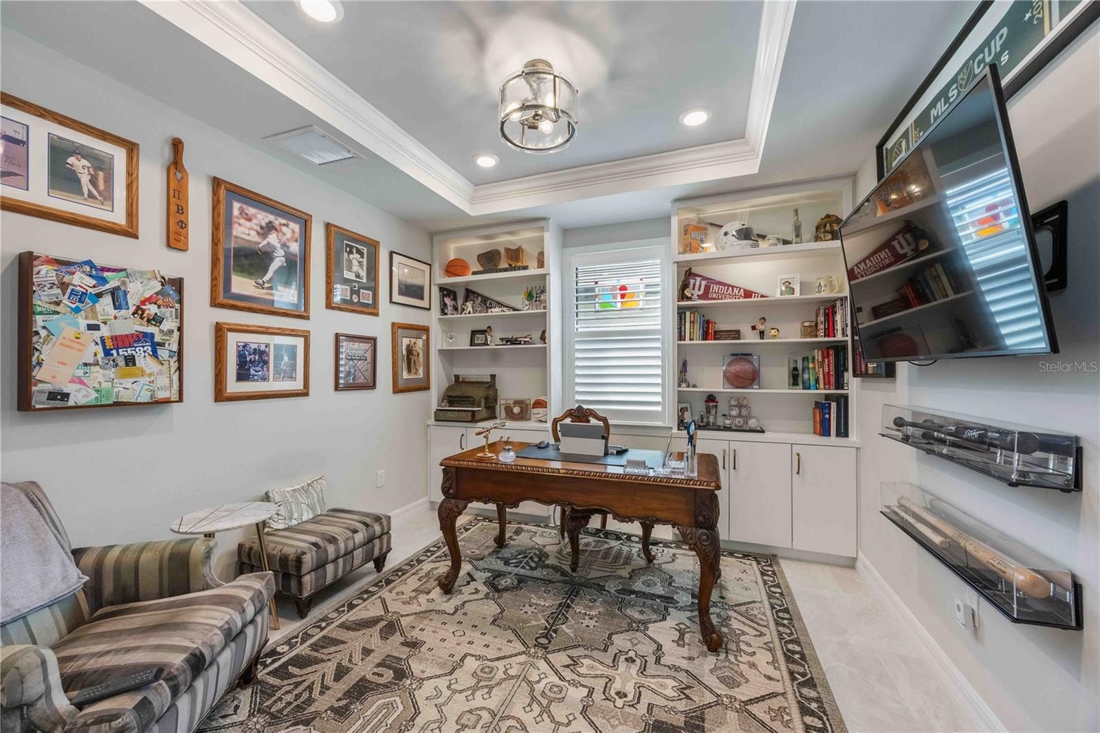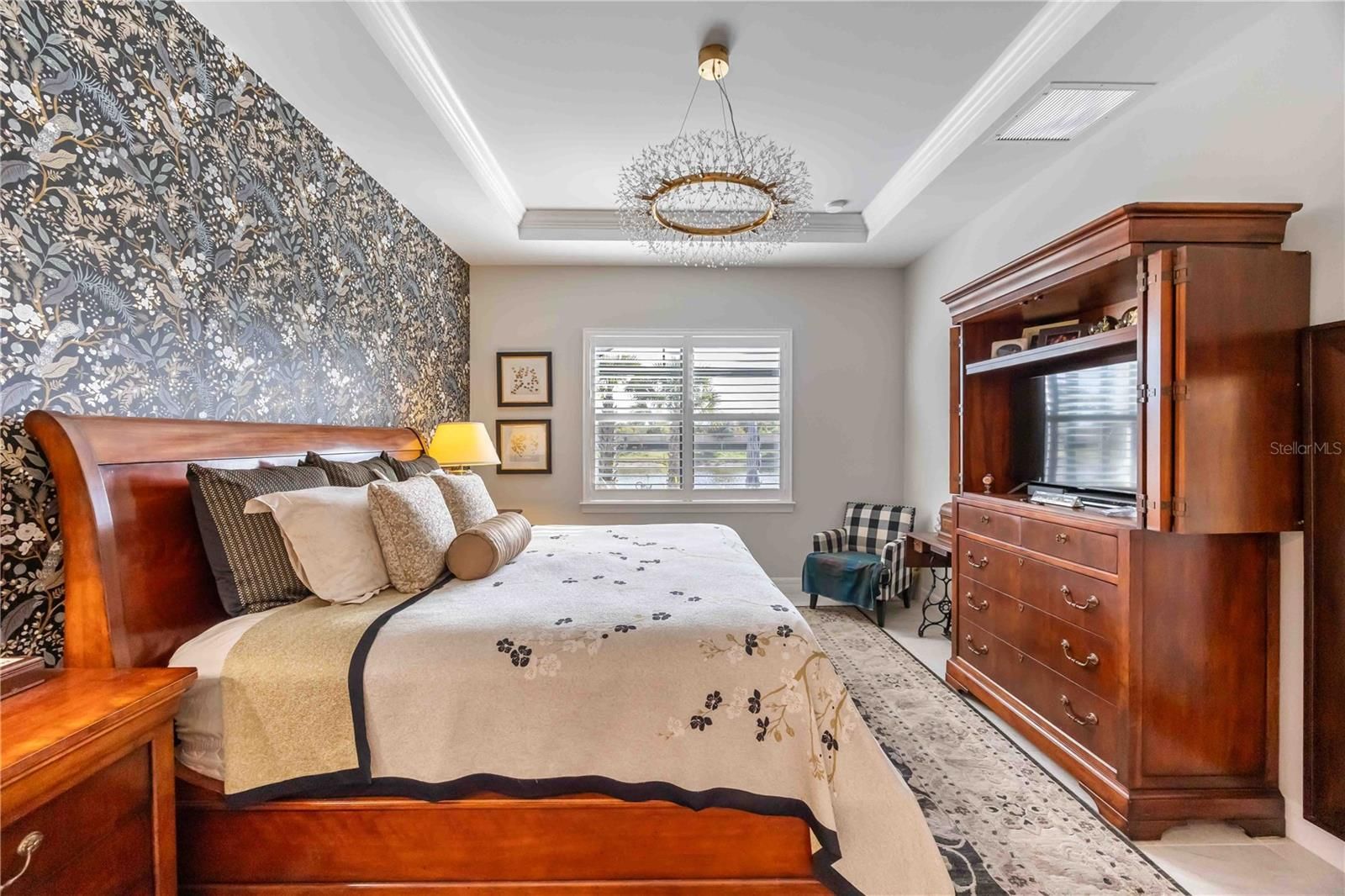 - Built-in Features, Ceiling Fan(s), Crown Molding, High Ceilings, Living/Dining Room, Open Floorplan, Main Level Primary, Walk-In Closet(s), Window Treatments