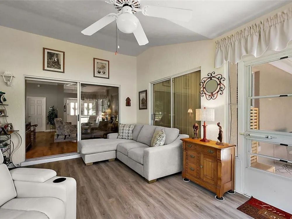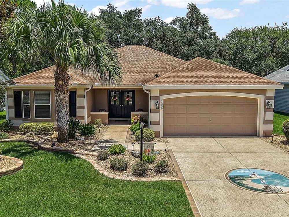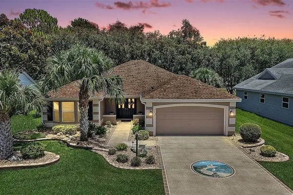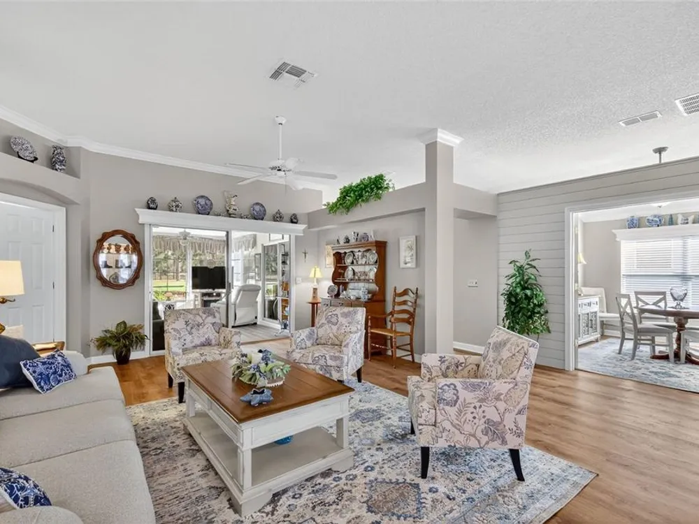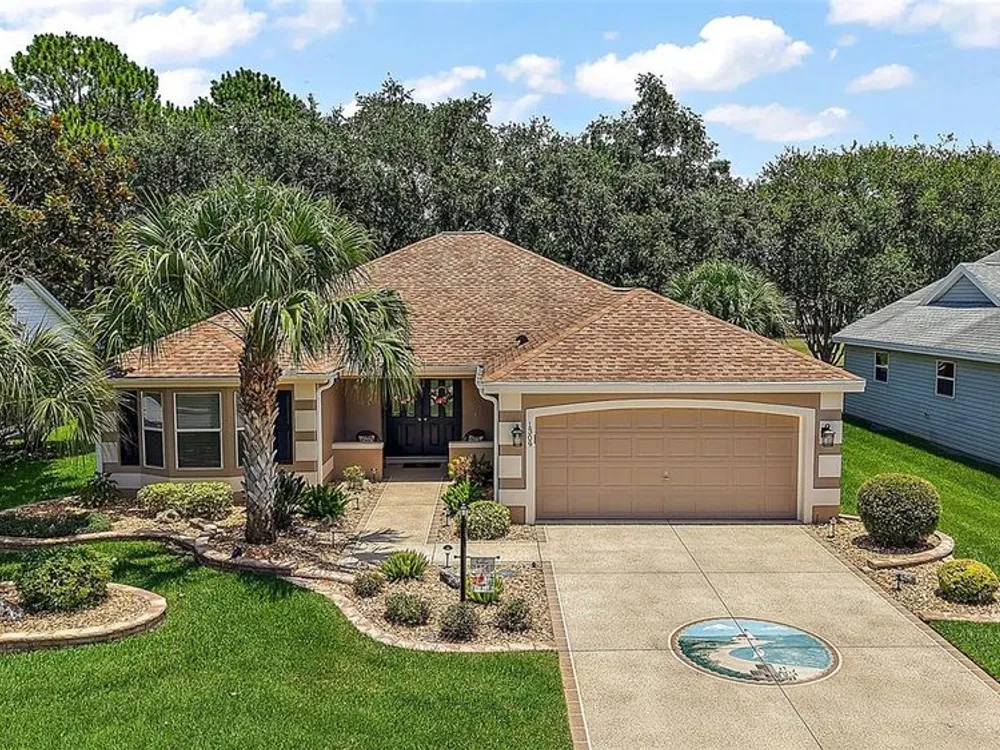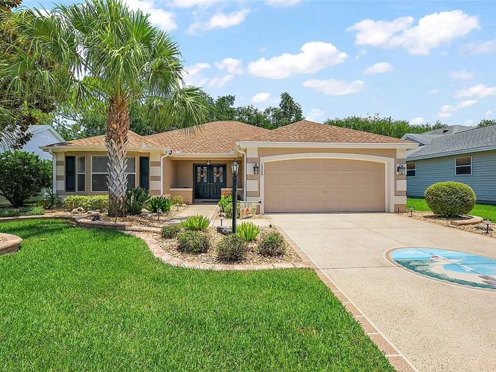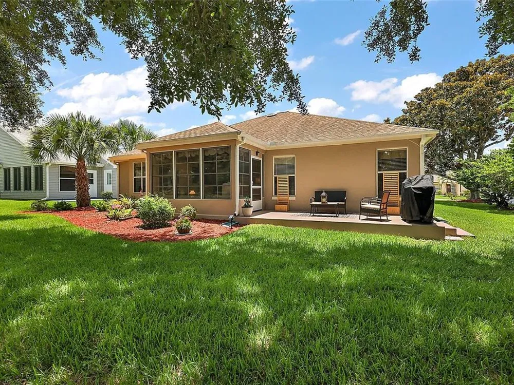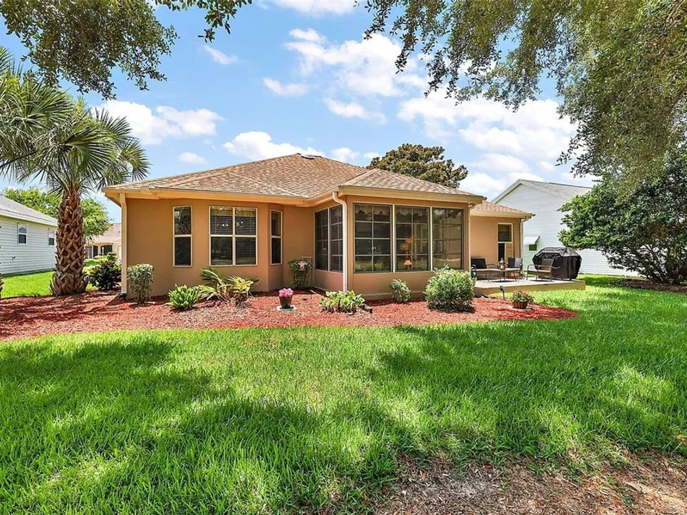OVERLOOK FABULOUS, GOLF FRONT VIEWS of Hacienda Hills Championship Golf Course in this 3/2 BLOCK and STUCCO Designer Grand Ficus with ENCLOSED LANAI and REAR PATIO in the highly sought after Village of Hacienda East - JUST ONE BLOCK to Spanish Springs Town Square! BOND PAID! As you approach this BEAUTIFUL home, you will be greeted by LUSH MATURE landscaping with TIERED curbed edging, DECORATIVELY painted drive and walkways, and a QUAINT FRONT PORCH - the perfect spot to relax and enjoy Florida’s sunshine! Step inside through the ELEGANT DOUBLE door entry into the BRIGHT foyer boasting HIGH CEILINGS, TILED floors, and convenient ENTRY CLOSET. The EXPANSIVE OPEN CONCEPT living area showcases GORGEOUS, WIDE PLANKED LUXURY VINYL flooring and HIGH CEILINGS accented by CUSTOM CROWN MOLDING. From the living room, sliding glass doors, adorned with a beautiful CORNICE, invite you in to the ENCLOSED LANAI boasting LUXURY VINYL PLANK flooring and a plethora of windows for an ABUNDANCE of natural light and PANORAMIC VIEWS of the golf course. The adjacent REAR PATIO is ideal for grilling, or enjoying the peaceful park-like golf course setting. Back inside, the AMAZING UPDATED kitchen showcases WHITE cabinetry; MODERN VEINED QUARTZ countertops; TILED backsplash, STAINLESS STEEL appliances; CROWN MOLDING; built-in DOUBLE PANTRY with PULL-OUT shelving; and a LARGE ISLAND with COUNTER HEIGHT seating. Adjacent dinette with BAY WINDOW offers a sunny dining space. The primary bedroom boasts a DOUBLE door entry, VAULTED ceiling, WALK-IN closet, and sliding doors to the ENCLOSED LANAI. Its en-suite bathroom offers WHITE cabinetry, DOUBLE sinks, TILE flooring, LINEN closet, and TILED WALK-IN shower with GLASS doors. An additional bedroom and a second bathroom are CONVENIENTLY LOCATED near the front of the home, ensuring plenty of PRIVACY for guests or a quiet home office. The bedroom features a BAY window and BUILT-IN closet. The second bathroom is well-appointed with TILE floors, WHITE cabinetry, TILED tub and shower combination, and a hallway LINEN closet.This home also offers a THIRD BEDROOM/DEN (no closet), ideal for guests, hobbies, or a private office. A GENEROUS INTERIOR laundry room features TILE floors, a built-in laundry sink, and NEW upper CABINETS for extra storage needs. Rounding off this EXCEPTIONAL home is the two-car garage boasting EPOXIED floors, built-in cabinets, and pull down stairs for attic access. DON’T MISS THE OPPORTUNITY TO MAKE THIS INCREDIBLE GOLF FRONT HOME in a FANTASTIC LOCATION YOUR OWN! This EXCEPTIONAL home is located JUST MINUTES from Spanish Springs Town Square with daily live music and dancing, Saturday morning farmer markets, a plethora of quaint shops, and fabulous restaurants! (A shortcut at the end of the adjacent Barcelona Drive provides easy access to the square.) Close to Cordoba Recreation Center featuring family pools, pickleball, corn toss, pavilion and postal station; The Sharon L. Morse Performing Arts Center; Genesis Fitness Center; Spanish Spring Bowling Lanes; Villages UF Hospital; Lake Sumter Landing Market Square; multiple pools, pickle ball courts, etc; and US-441/27 and CR-466 with ABUNDANT shopping, restaurants, banking, medical and more! PLEASE WATCH OUR VIDEO and CALL TODAY to schedule your private showing or virtual tour!