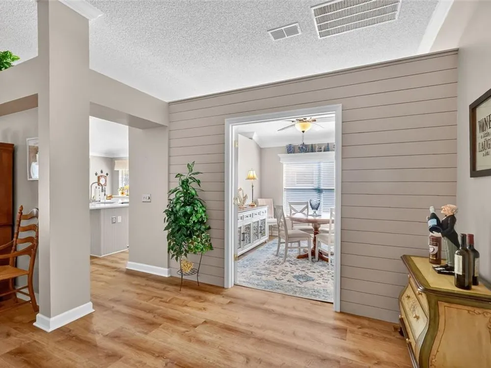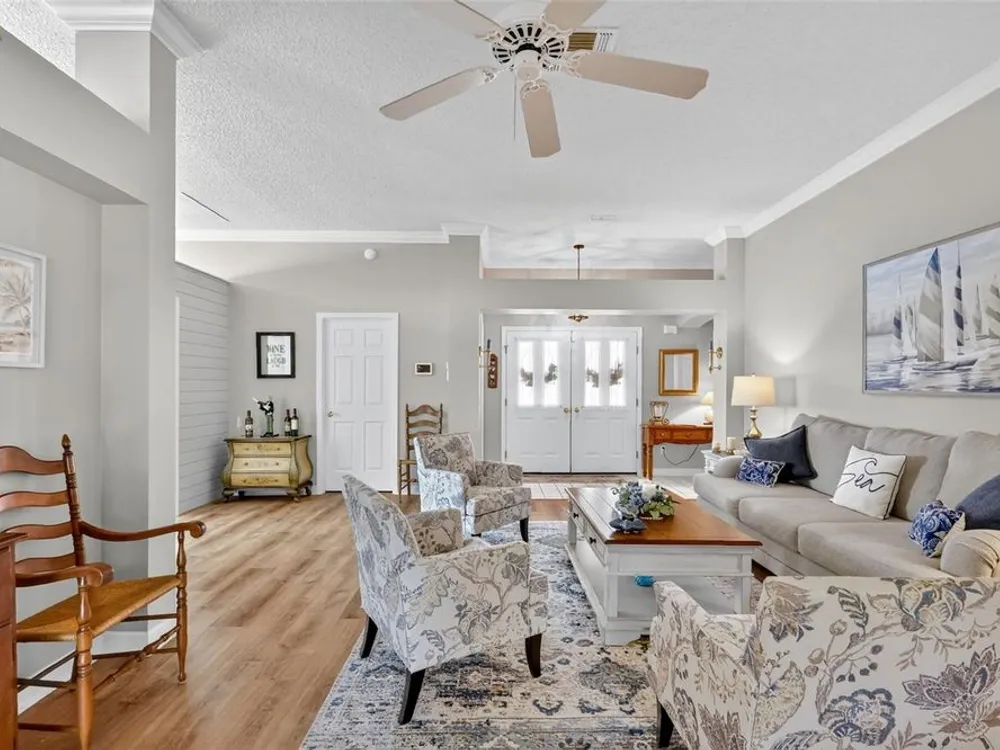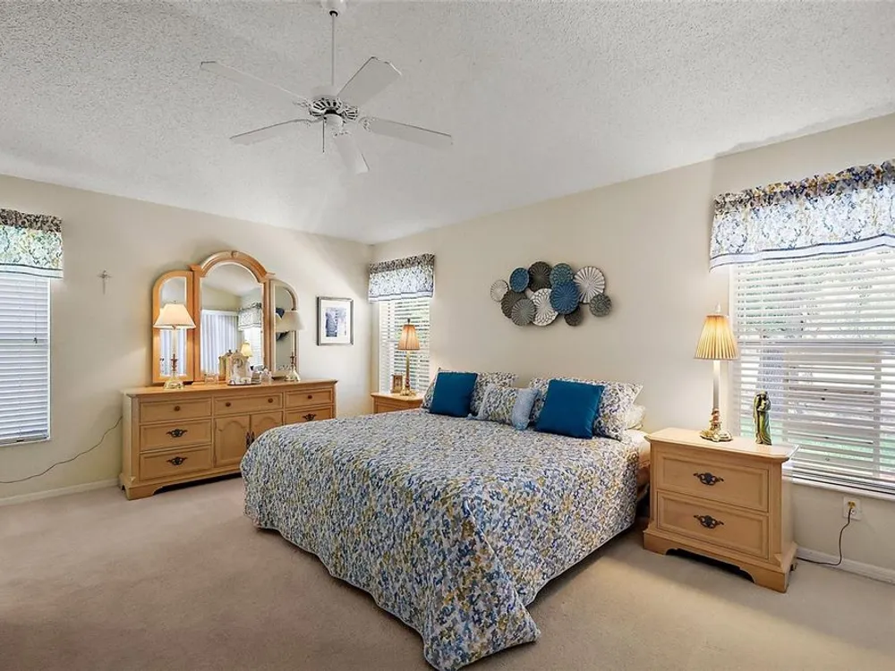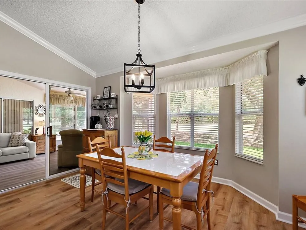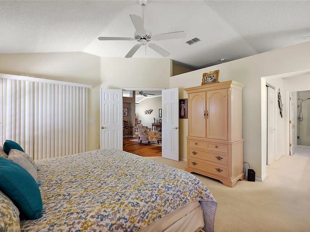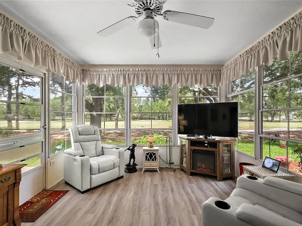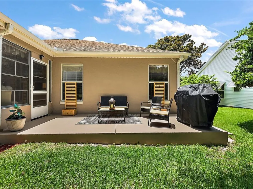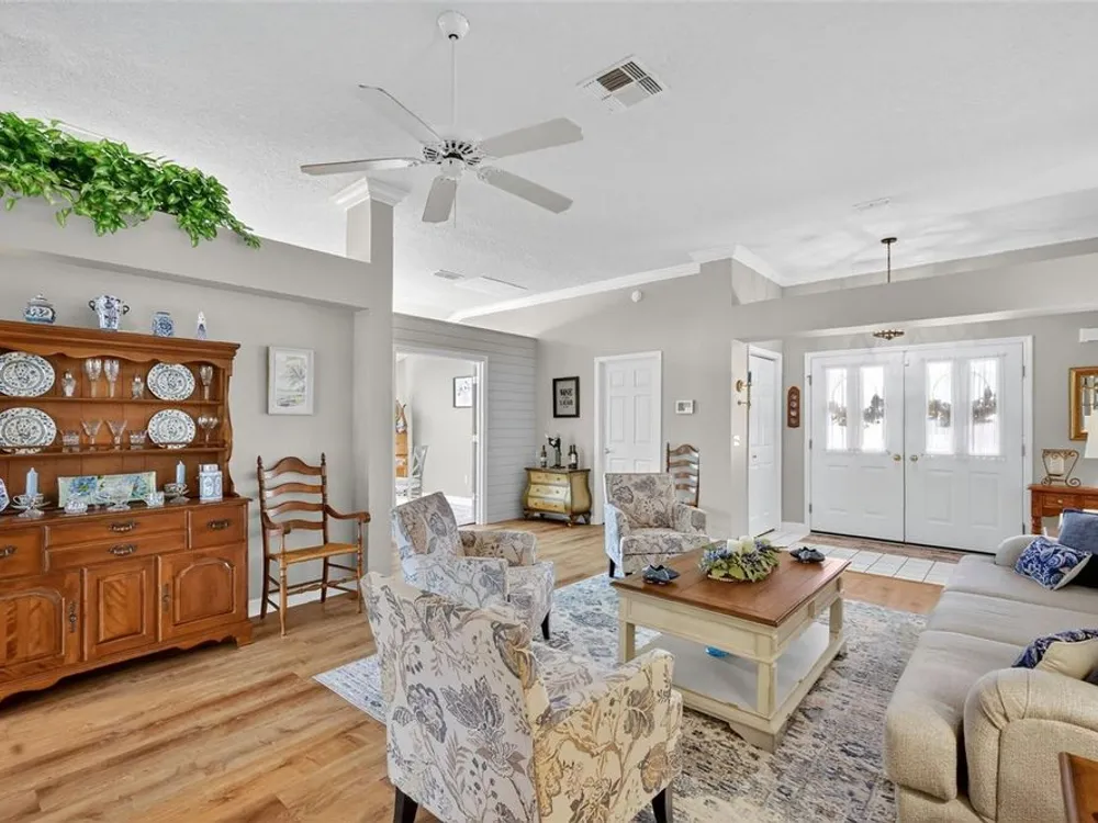 OVERLOOK FABULOUS, GOLF FRONT VIEWS of Hacienda Hills Championship Golf Course in this 3/2 BLOCK and STUCCO Designer Grand Ficus with ENCLOSED LANAI and REAR PATIO in the highly sought after Village of Hacienda East - JUST ONE BLOCK to Spanish Springs Town Square! BOND PAID! As you approach this BEAUTIFUL home, you will be greeted by LUSH MATURE landscaping with TIERED curbed edging, DECORATIVELY painted drive and walkways, and a QUAINT FRONT PORCH - the perfect spot to relax and enjoy Florida’s sunshine! Step inside through the ELEGANT DOUBLE door entry into the BRIGHT foyer boasting HIGH CEILINGS, TILED floors, and convenient ENTRY CLOSET. The EXPANSIVE OPEN CONCEPT living area showcases GORGEOUS, WIDE PLANKED LUXURY VINYL flooring and HIGH CEILINGS accented by CUSTOM CROWN MOLDING. From the living room, sliding glass doors, adorned with a beautiful CORNICE, invite you in to the ENCLOSED LANAI boasting LUXURY VINYL PLANK flooring and a plethora of windows for an ABUNDANCE of natural light and PANORAMIC VIEWS of the golf course. The adjacent REAR PATIO is ideal for grilling, or enjoying the peaceful park-like golf course setting. Back inside, the AMAZING UPDATED kitchen showcases WHITE cabinetry; MODERN VEINED QUARTZ countertops; TILED backsplash, STAINLESS STEEL appliances; CROWN MOLDING; built-in DOUBLE PANTRY with PULL-OUT shelving; and a LARGE ISLAND with COUNTER HEIGHT seating. Adjacent dinette with BAY WINDOW offers a sunny dining space. The primary bedroom boasts a DOUBLE door entry, VAULTED ceiling, WALK-IN closet, and sliding doors to the ENCLOSED LANAI. Its en-suite bathroom offers WHITE cabinetry, DOUBLE sinks, TILE flooring, LINEN closet, and TILED WALK-IN shower with GLASS doors. An additional bedroom and a second bathroom are CONVENIENTLY LOCATED near the front of the home, ensuring plenty of PRIVACY for guests or a quiet home office. The bedroom features a BAY window and BUILT-IN closet. The second bathroom is well-appointed with TILE floors, WHITE cabinetry, TILED tub and shower combination, and a hallway LINEN closet.This home also offers a THIRD BEDROOM/DEN (no closet), ideal for guests, hobbies, or a private office. A GENEROUS INTERIOR laundry room features TILE floors, a built-in laundry sink, and NEW upper CABINETS for extra storage needs. Rounding off this EXCEPTIONAL home is the two-car garage boasting EPOXIED floors, built-in cabinets, and pull down stairs for attic access. DON’T MISS THE OPPORTUNITY TO MAKE THIS INCREDIBLE GOLF FRONT HOME in a FANTASTIC LOCATION YOUR OWN! This EXCEPTIONAL home is located JUST MINUTES from Spanish Springs Town Square with daily live music and dancing, Saturday morning farmer markets, a plethora of quaint shops, and fabulous restaurants! (A shortcut at the end of the adjacent Barcelona Drive provides easy access to the square.) Close to Cordoba Recreation Center featuring family pools, pickleball, corn toss, pavilion and postal station; The Sharon L. Morse Performing Arts Center; Genesis Fitness Center; Spanish Spring Bowling Lanes; Villages UF Hospital; Lake Sumter Landing Market Square; multiple pools, pickle ball courts, etc; and US-441/27 and CR-466 with ABUNDANT shopping, restaurants, banking, medical and more! PLEASE WATCH OUR VIDEO and CALL TODAY to schedule your private showing or virtual tour!