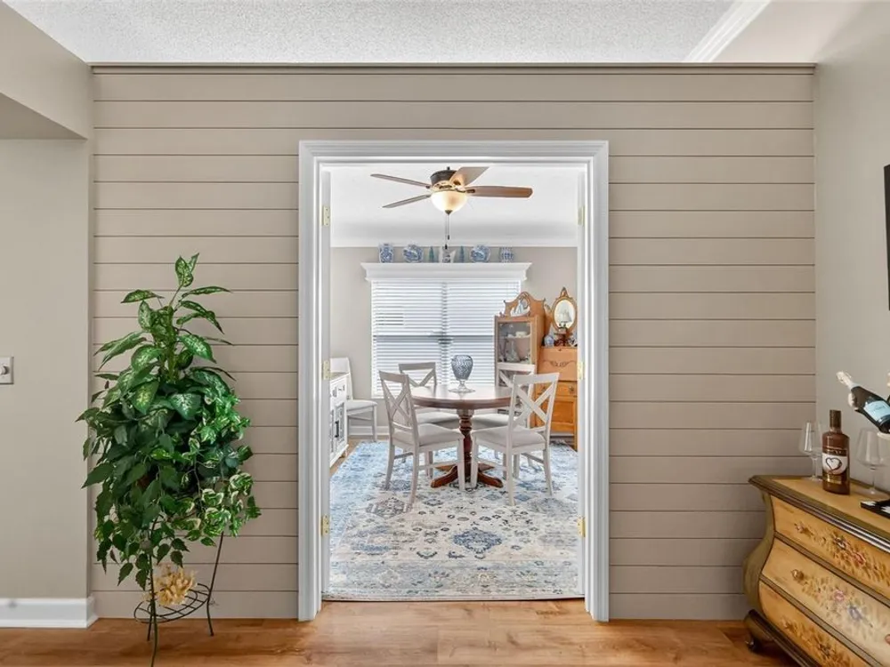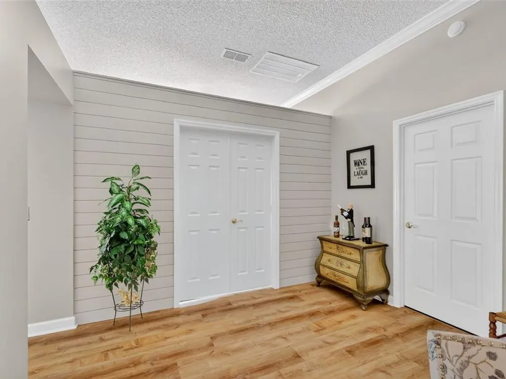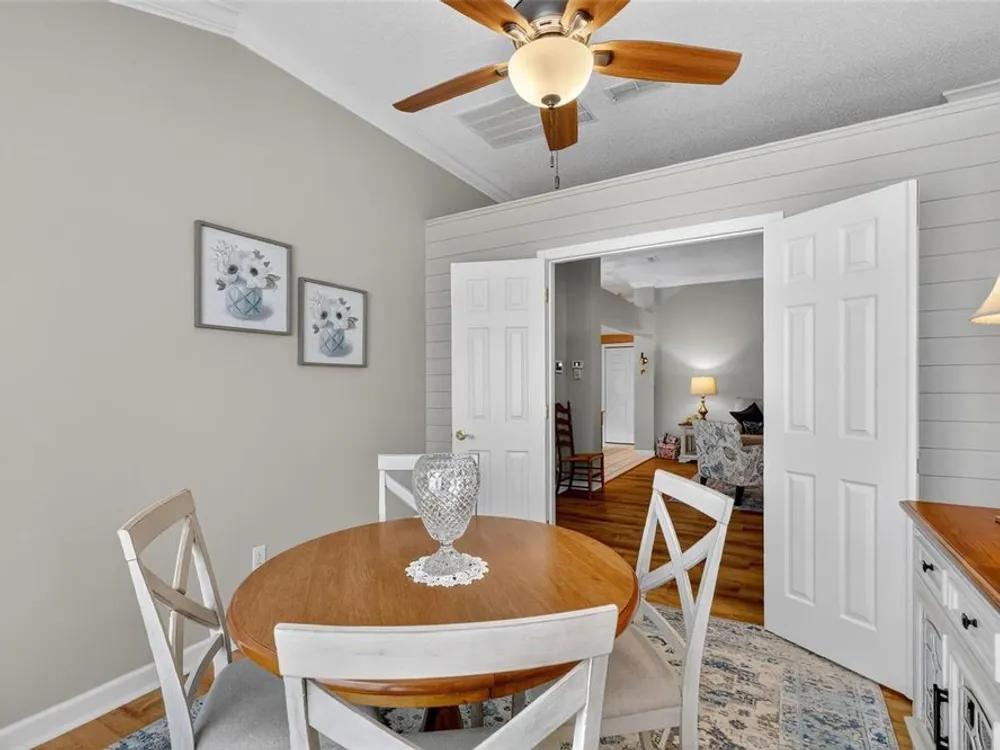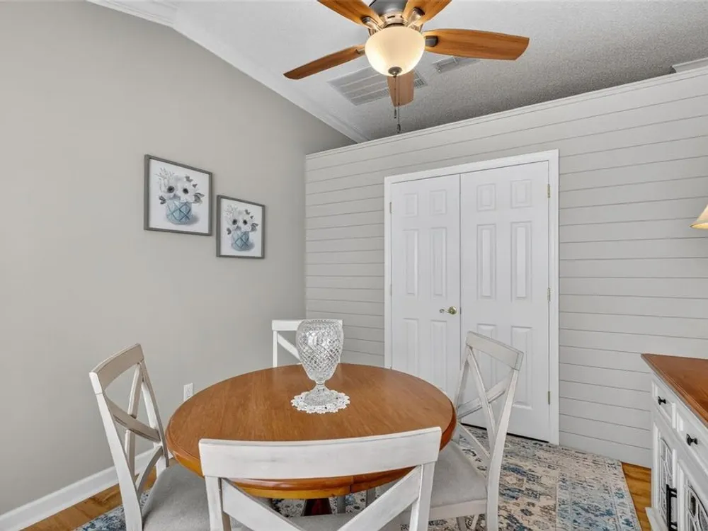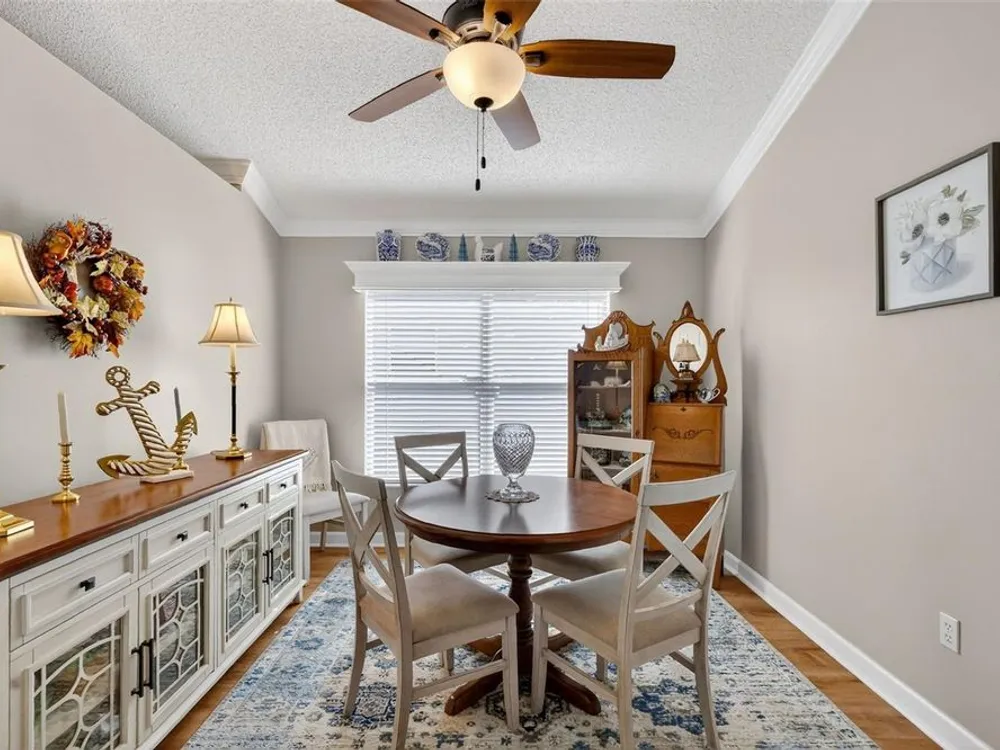 - Ceiling Fan(s), Crown Molding, Eat-in Kitchen, High Ceilings, Living/Dining Room, Main Level Primary, Solid Surface Counters, Split Bedrooms, Vaulted Ceiling(s), Walk-In Closet(s)