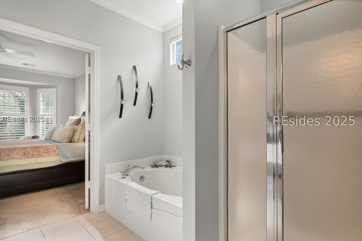 - Attic Access, Built-in Features, Ceiling Fan(s), Fire Extinguisher, Jetted Tub, Main Level Primary, Multiple Primary Bathrooms, New Paint, Pull Down Attic Stairs, See Remarks, Separate Shower, Cable TV