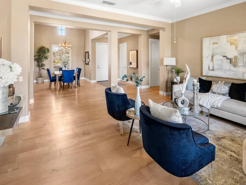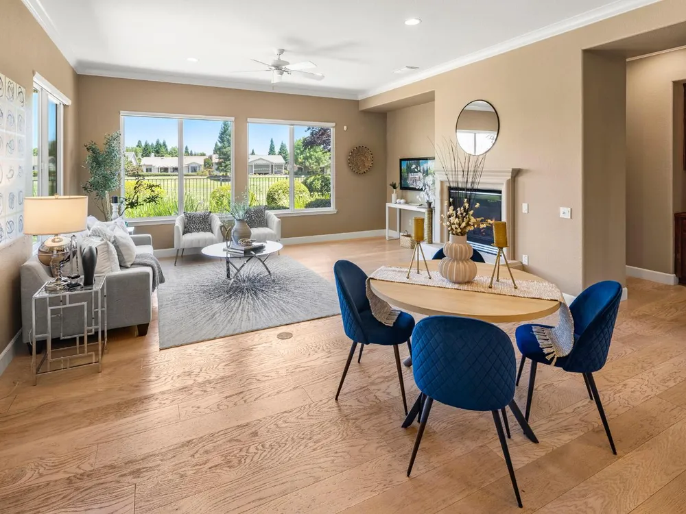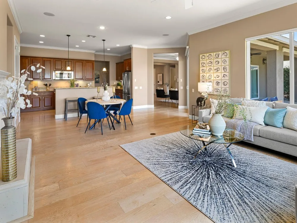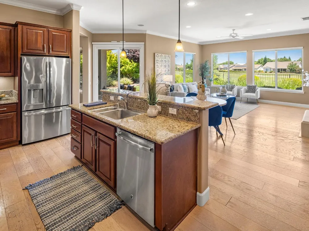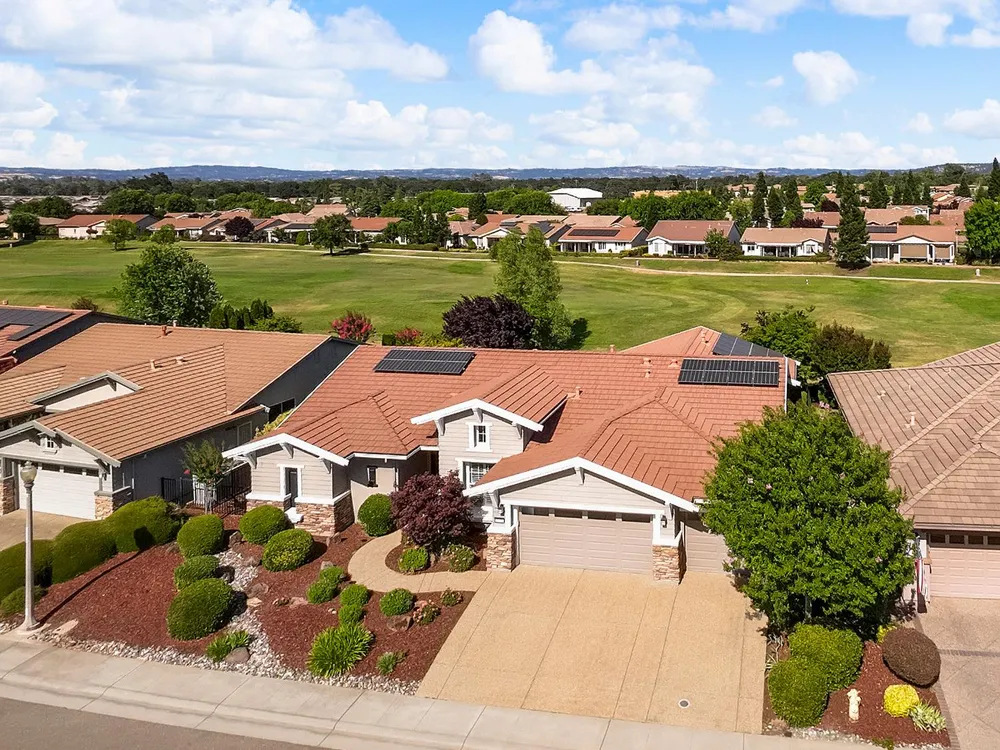 Light and Bright Marin Floorplan with 2500 square feet and a full 3 car garage! All day enjoyment of your property with this Easterly exposure over the Lincoln Hills Golf course! Fully fenced with wrought iron fencing! Large patio cover and yard for entertaining and almost every window in the house has a beautiful view of the manicured Golf Course. Solar is older NEM and almost nothing to run! Statements available. Ev Charger and golf cart charging included; Large Kitchen island with stainless sink, Merillat Cabinetry and Granite slab countertops. Higher ceilings, crown molding and 6 inch baseboards throughout, with guest and main bedrooms on separate wings of the home. Entire home except bedrooms laid out with Luxury Wood Plank flooring so easy to care for! Golf Cart path is on the opposite side of the green! And live the dream with the Kilaga Springs Lodge just a few blocks away! A shower in both bathrooms with an additional 1/2 bath, and the main bathroom has an oversized soaking tub, large closet and upgraded countertops! There is a slider in the Main bedroom as well! And a Bidet in the main bath! Beautiful LG washer with a mini-load drawer at the bottom and a matching dryer with storage below. Sink in laundry with built-in cabinet package.