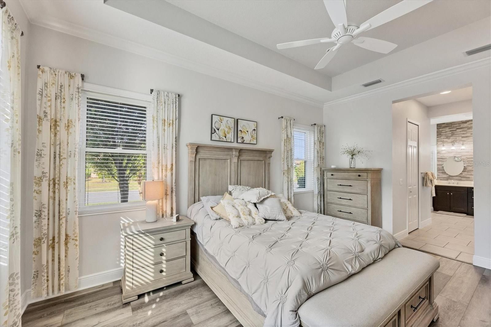 - Ceiling Fan(s), Crown Molding, Eat-in Kitchen, High Ceilings, Open Floorplan, Smart Home, Stone Counters, Thermostat, Tray Ceiling(s), Walk-In Closet(s), Window Treatments