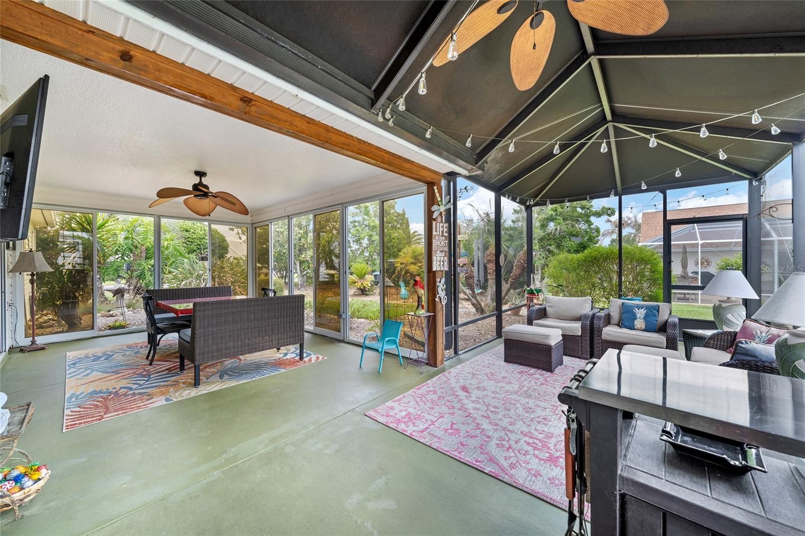 BOND IS PAID!! Welcome to this STRETCHED JUNIPER (LANTANA) MODEL located in the sought-after VILLAGE OF SANTIAGO on a CORNER LOT! This beautifully maintained 3-BEDROOM, 2-BATH home offers an OPEN, FLOOR PLAN with VAULTED CEILINGS and LVP FLOORING THROUGHOUT for a clean, modern feel. Enjoy peace of mind with a NEW ROOF 2020 HVAC 2017 and an OVERSIZED 2-CAR GARAGE featuring PULL-DOWN STAIRS and a WORK BENCH. The spacious living and dining areas provide PLENTY OF ROOM FOR ENTERTAINING, while the kitchen is equipped with STAINLESS STEEL APPLIANCES and a GAS RANGE, BACKSPLASH, and PANTRY CLOSET—perfect for everyday living and hosting. The PRIMARY SUITE is a true retreat featuring a LARGE WALK-IN CLOSET, WALK-IN SHOWER, SOAKER TUB, and a PRIVATE WATER CLOSET. The guest bedroom is thoughtfully designed with a BAY WINDOW for added space and includes a BUILT-IN MURPHY BED, making it ideal for guests or a flexible office setup. The GUEST BATHROOM features a WALK-IN SHOWER for convenience and comfort. Step outside to enjoy year-round Florida living with an ENCLOSED LANAI featuring ACRYLIC WINDOWS and A/C VENTS CONVERTED INTO MORE OF AN OUTDOOR SPACE WITH AN EXTENDED COVERED BIRDCAGE—perfect for relaxing or entertaining in a PRIVATE, LUSHLY LANDSCAPED setting. LOCATION + LIFESTYLE! This home is ideally located near SANTIAGO RECREATION CENTER, offering a pool, pickleball, tennis, and a full calendar of activities. You’re also just minutes from both GLENVIEW and NANCY LOPEZ CHAMPIONSHIP GOLF COURSES, plus multiple executive courses nearby—making it easy to enjoy everything The Villages golf lifestyle has to offer. Convenient access to SPANISH SPRINGS TOWN SQUARE & LAKE SUMTER LANDING, shopping, dining, and nightly entertainment completes the picture! FURNITURE AVAILABLE SEPARATELY.