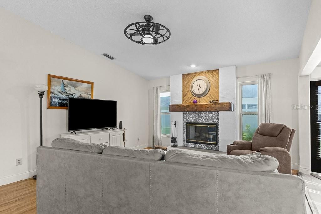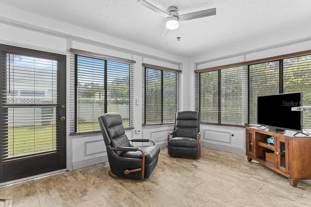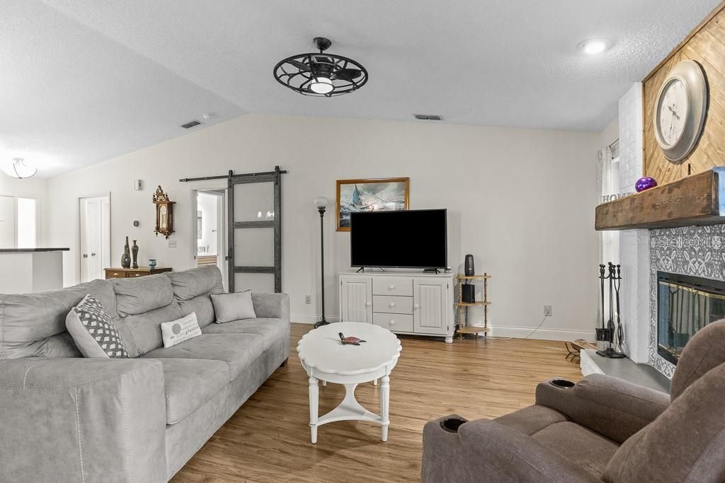 Tucked at the end of a quiet street in the sought-after 55+ community of Villas on the Green, this 2-bedroom bungalow includes a 4-season lanai and SO MANY upgrades. The property enjoys a premium corner lot position, with foliage-covered fences that give you lots of privacy. And check out the curb appeal, which includes landscaped garden beds, pretty palm trees and a stylish, extra-wide driveway. But don't worry - the HOA covers all exterior maintenance! Inside the front door, you’ll find gleaming marble & LVP flooring, lots of natural light and a gorgeous fireplace that was given a facelift just last year. The updated kitchen features granite countertops, stainless steel appliances & soft-close cabinetry. From the kitchen, you can pass drinks and snacks directly to guests relaxing in the 4-season sunroom. Just steps away, the fenced-in, manicured backyard provides ample space for your garden. Back inside, the primary bedroom boasts a renovated ensuite with a slate floor, a custom-tiled shower and a vanity with lots of storage. The hallway bathroom has also been updated with a new vanity & fixtures. Other upgrades completed by the homeowners include a new roof, fresh exterior paint, new HVAC, complete PVC replumbing, a new hot water heater, new Levolor blinds and a new barn door. Don’t forget about all the storage in the attached 2-car garage. The gated community of Villas on the Green offers residents so many amenities! Within a few minutes of your front door, you can be at the heated community pool, clubhouse or fitness center. Tennis/basketball/shuffleboard courts+community park, too! The HOA fees here include trash, internet & basic cable. This neighborhood puts you close to numerous restaurants and shops, with easy access to Rt 301 & I-75. You can be sitting on the beach in 15 minutes, and you'll be less than 35 min from downtown & the airport.