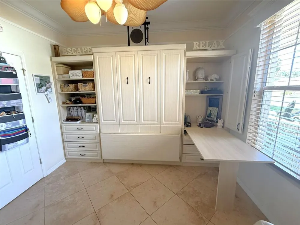 - Attic Ventilator, Ceiling Fan(s), Crown Molding, High Ceilings, In-Wall Pest Control, Kitchen/Family Room Combo, Main Level Primary, Solid-Wood Cabinets, Split Bedrooms, Thermostat, Walk-In Closet(s), Window Treatments