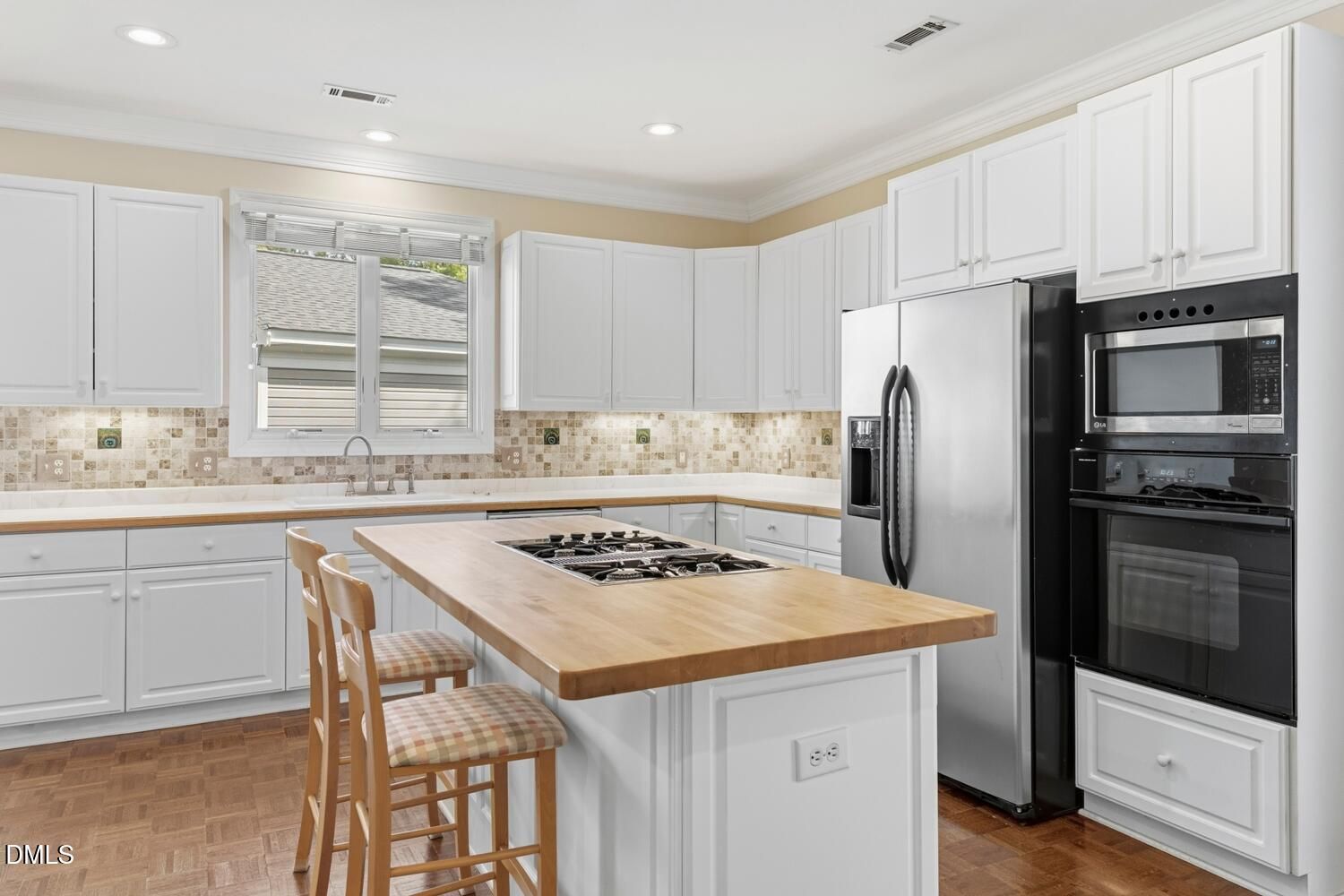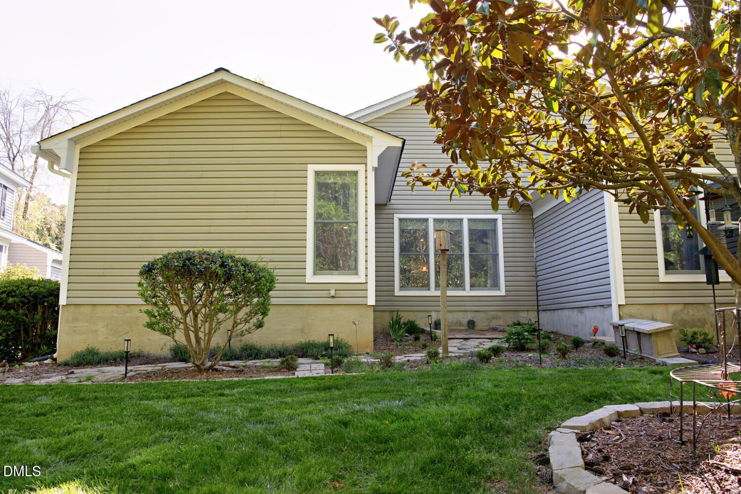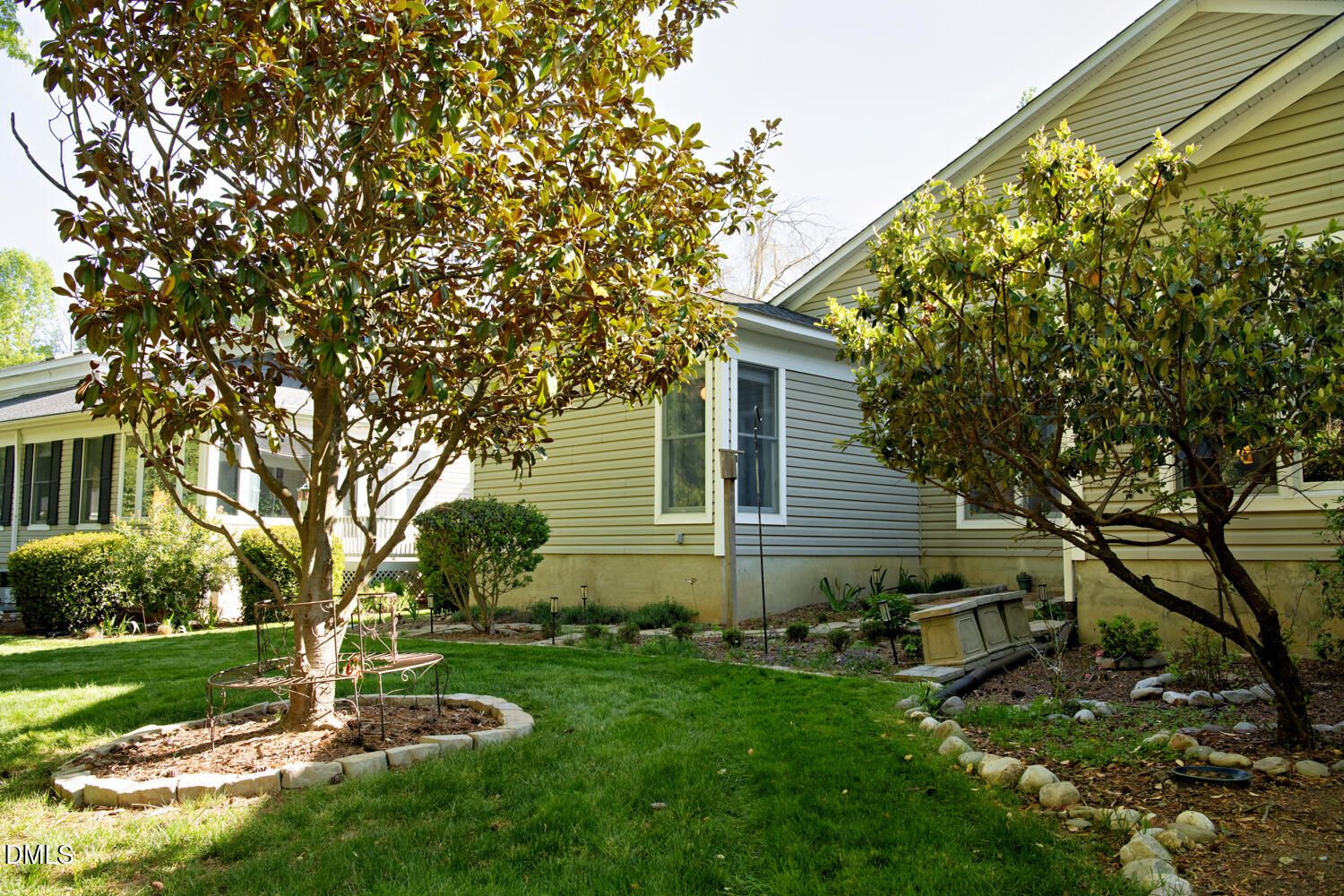 Welcome to this beautifully appointed 3-bedroom, 2-bath ranch-style townhome with a large 2 car garage nestled in the highly sought-after community of Fearrington Village. Located in the Bush Creek Townhome area of Fearrington Village, this hard to find, one level townhome was thoughtfully designed with both comfort and style in mind, this home offers a perfect blend of modern updates and timeless charm. Step inside to discover brand new Mohawk Luxury Vinyl Plank flooring flowing seamlessly throughout the home, complemented by original parquet flooring that extends from the foyer, to the large laundry room, through the kitchen and family room--adding a warm, elegant touch you won't find just anywhere. The spacious kitchen is a true centerpiece, featuring a large butcher block top island with a gas range, built-in oven and microwave, abundant cabinetry with some that offer pull out drawers for easy access, generous counter space, updated light fixtures, and a unique tile backsplash that adds character and flair. It is the perfect space to entertain and make memories. The open and airy layout is enhanced by high ceilings and crown molding throughout, creating a bright and sophisticated atmosphere. Entertain with ease in the formal dining room, complete with a beautiful chandelier, large windows and detailed molding, or relax in the welcoming living room centered around a cozy gas fireplace. The primary suite is a private retreat, offering large double walk-in closets with stylish barn doors and custom storage systems. The en-suite bathroom features a double vanity and a soaking tub--perfect for unwinding at the end of the day. The two additional bedrooms are generously sized with tall ceilings, crown molding, large closets and include ceiling fans for year-round comfort. Charming details continue throughout the home, including decorative windows in the second bathroom and garage that pay homage to the history and character of Fearrington Village while providing added privacy. The garage also includes built-in shelving for excellent storage solutions. Step outside to your own enclosed courtyard patio--an ideal space for relaxing, entertaining, or enjoying peaceful moments in a private setting. The fully bricked exterior ensures low-maintenance living, while the beautifully and lovingly thought-out landscaped yard enhances curb appeal. Living in Fearrington Village means embracing a vibrant lifestyle with access to scenic walking trails, a community pool, boutique shopping, dining, and year-round events and entertainment. This exceptional home offers the perfect combination of elegance, comfort, and community--don't miss your opportunity to make it yours! Schedule your showing today!