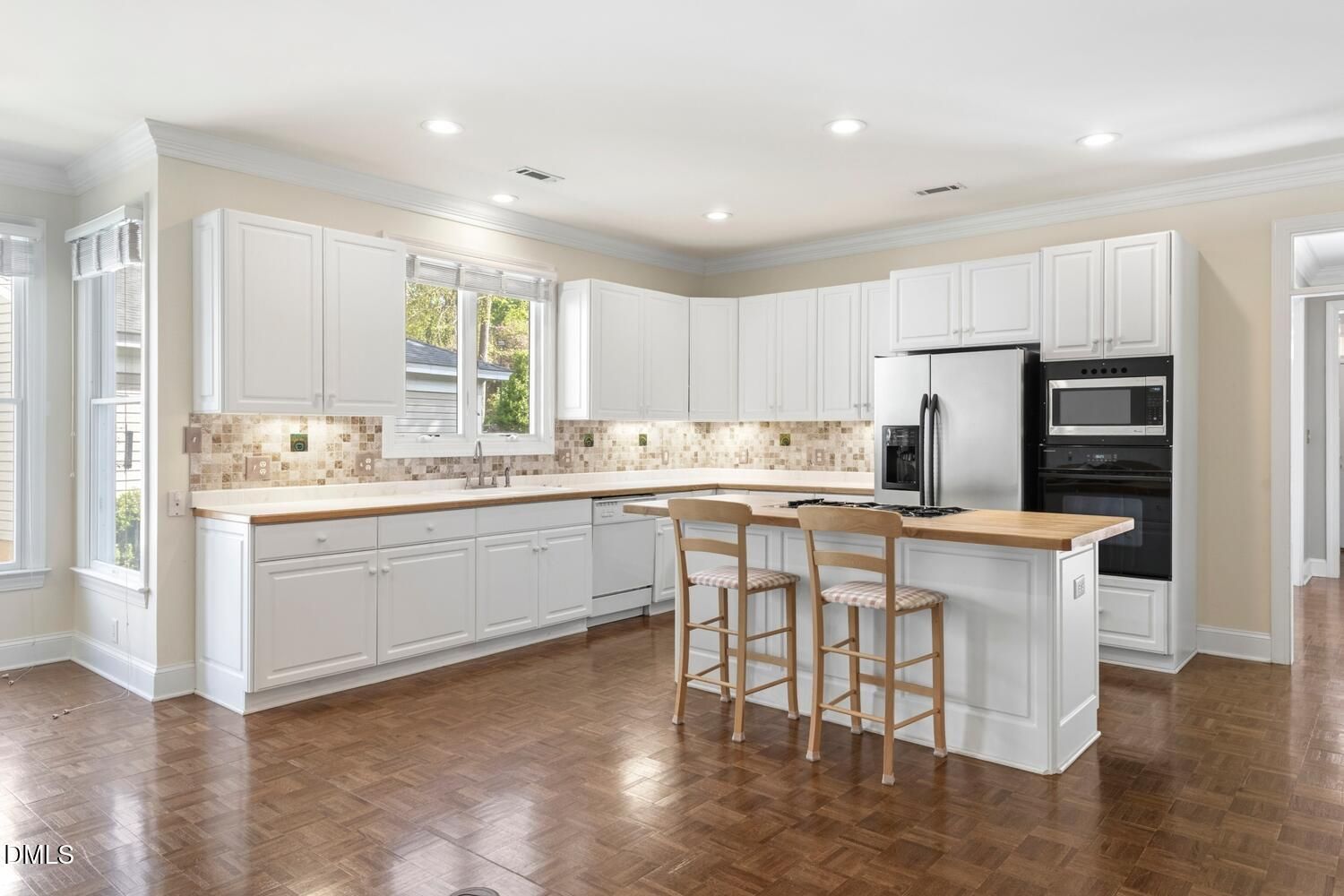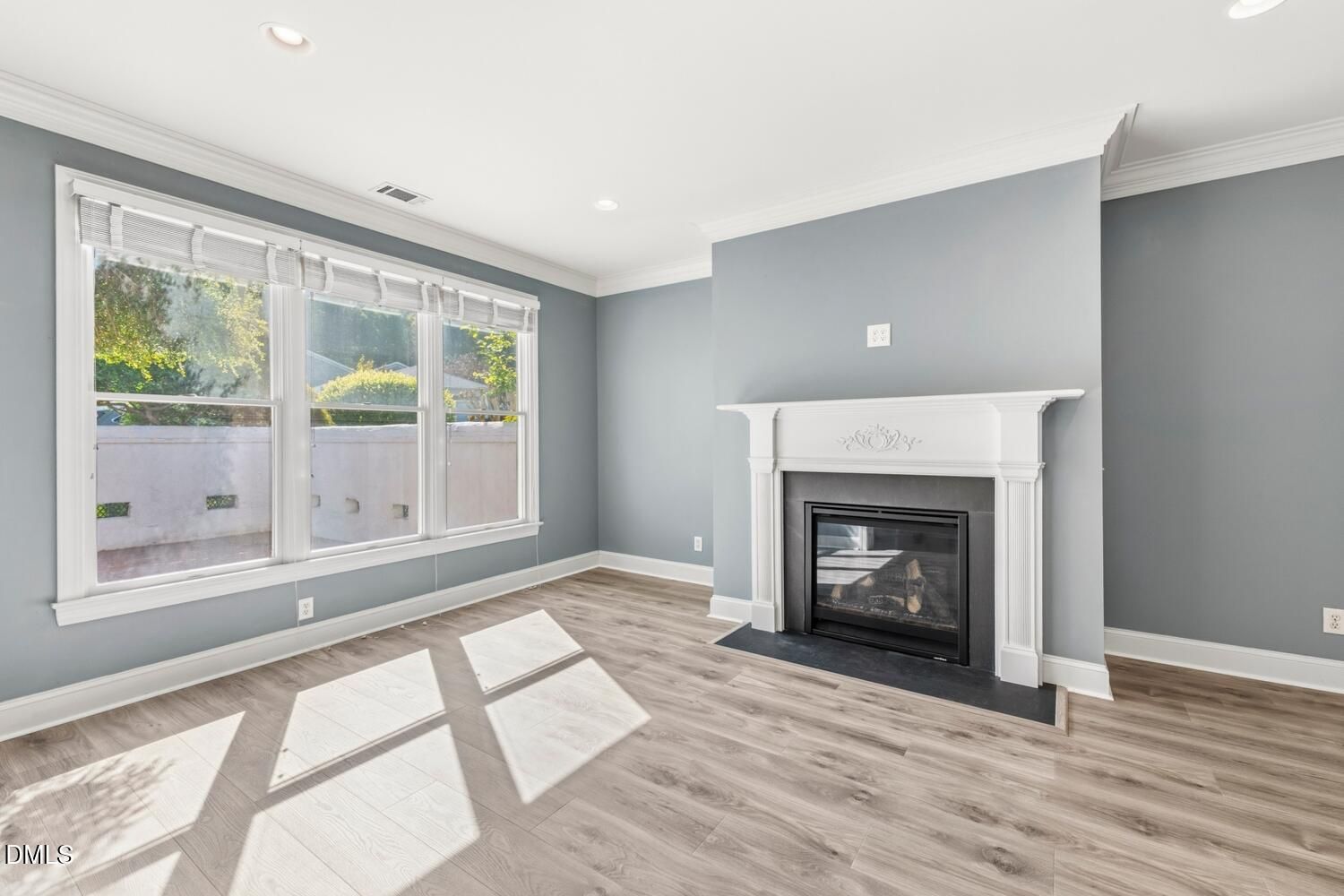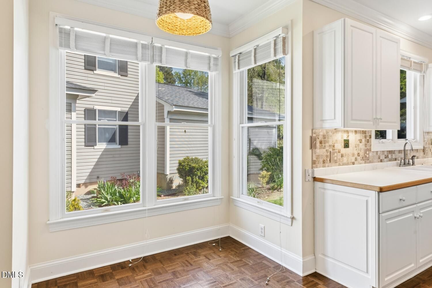 Welcome to this beautifully appointed 3-bedroom, 2-bath ranch-style townhome with a large 2 car garage nestled in the highly sought-after community of Fearrington Village. Located in the Bush Creek Townhome area of Fearrington Village, this hard to find, one level townhome was thoughtfully designed with both comfort and style in mind, this home offers a perfect blend of modern updates and timeless charm. Step inside to discover brand new Mohawk Luxury Vinyl Plank flooring flowing seamlessly throughout the home, complemented by original parquet flooring that extends from the foyer, to the large laundry room, through the kitchen and family room--adding a warm, elegant touch you won't find just anywhere. The spacious kitchen is a true centerpiece, featuring a large butcher block top island with a gas range, built-in oven and microwave, abundant cabinetry with some that offer pull out drawers for easy access, generous counter space, updated light fixtures, and a unique tile backsplash that adds character and flair. It is the perfect space to entertain and make memories. The open and airy layout is enhanced by high ceilings and crown molding throughout, creating a bright and sophisticated atmosphere. Entertain with ease in the formal dining room, complete with a beautiful chandelier, large windows and detailed molding, or relax in the welcoming living room centered around a cozy gas fireplace. The primary suite is a private retreat, offering large double walk-in closets with stylish barn doors and custom storage systems. The en-suite bathroom features a double vanity and a soaking tub--perfect for unwinding at the end of the day. The two additional bedrooms are generously sized with tall ceilings, crown molding, large closets and include ceiling fans for year-round comfort. Charming details continue throughout the home, including decorative windows in the second bathroom and garage that pay homage to the history and character of Fearrington Village while providing added privacy. The garage also includes built-in shelving for excellent storage solutions. Step outside to your own enclosed courtyard patio--an ideal space for relaxing, entertaining, or enjoying peaceful moments in a private setting. The fully bricked exterior ensures low-maintenance living, while the beautifully and lovingly thought-out landscaped yard enhances curb appeal. Living in Fearrington Village means embracing a vibrant lifestyle with access to scenic walking trails, a community pool, boutique shopping, dining, and year-round events and entertainment. This exceptional home offers the perfect combination of elegance, comfort, and community--don't miss your opportunity to make it yours! Schedule your showing today!