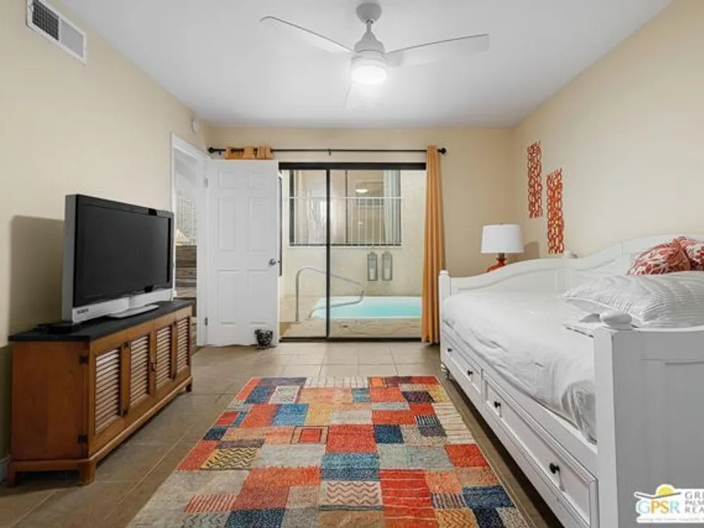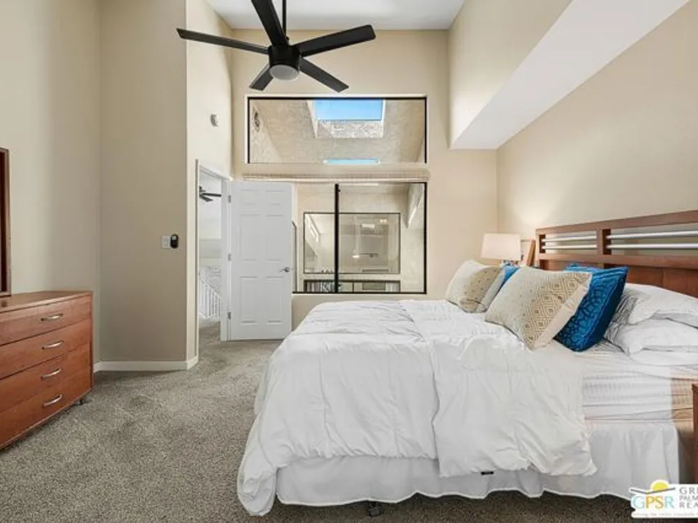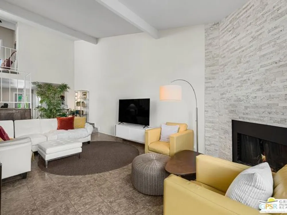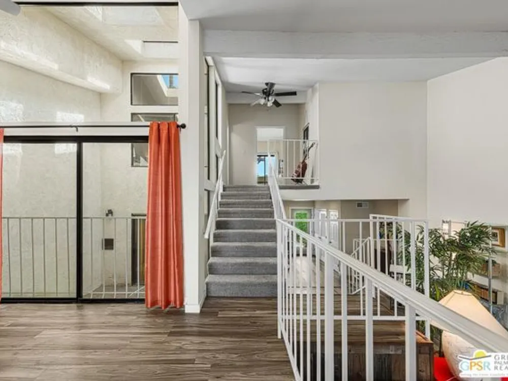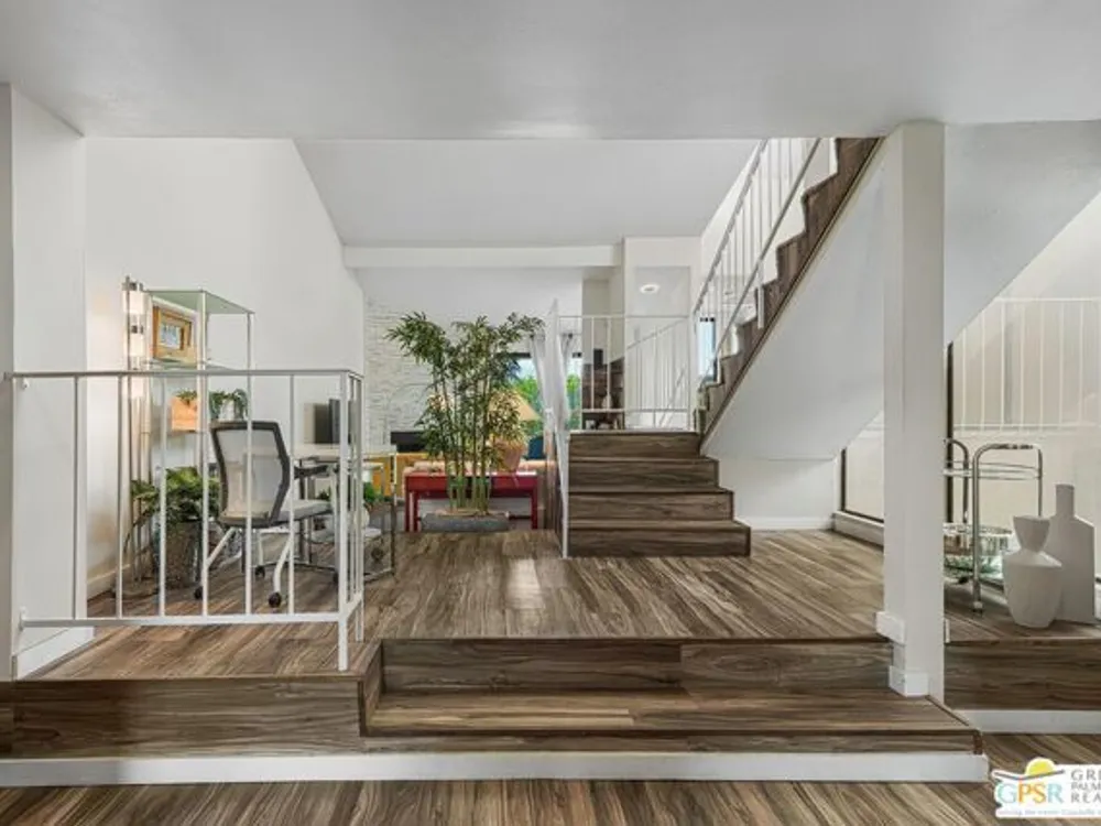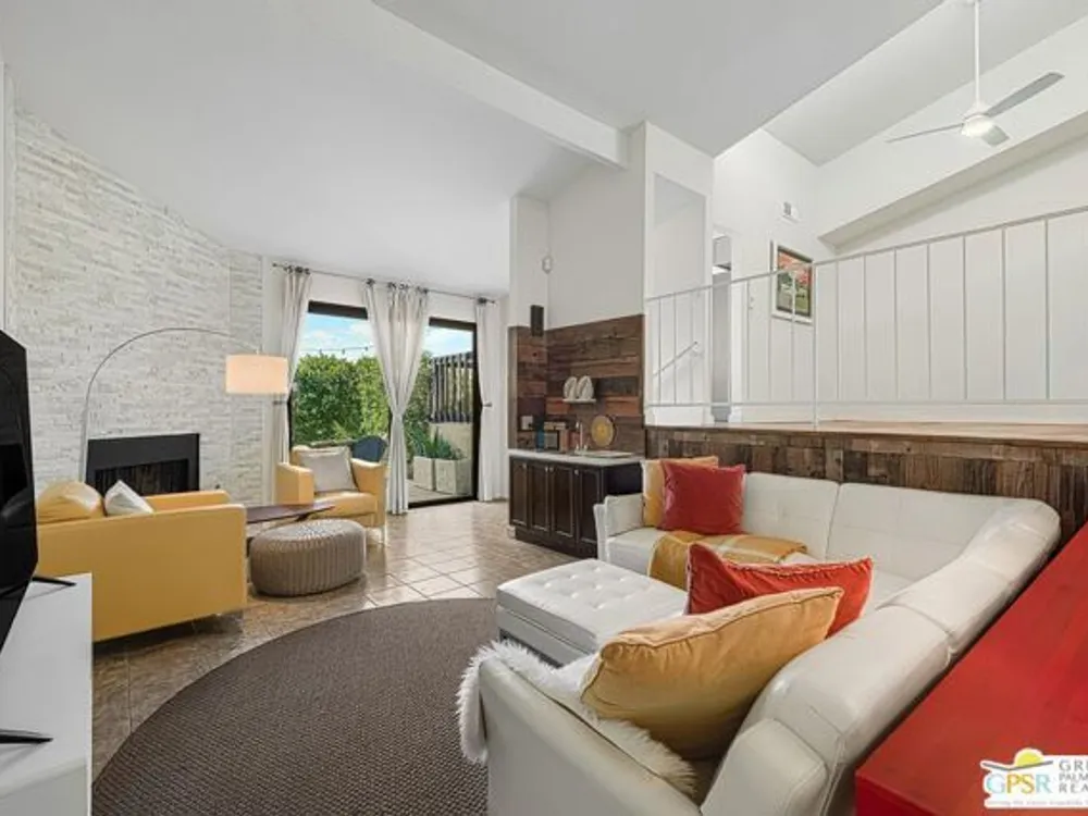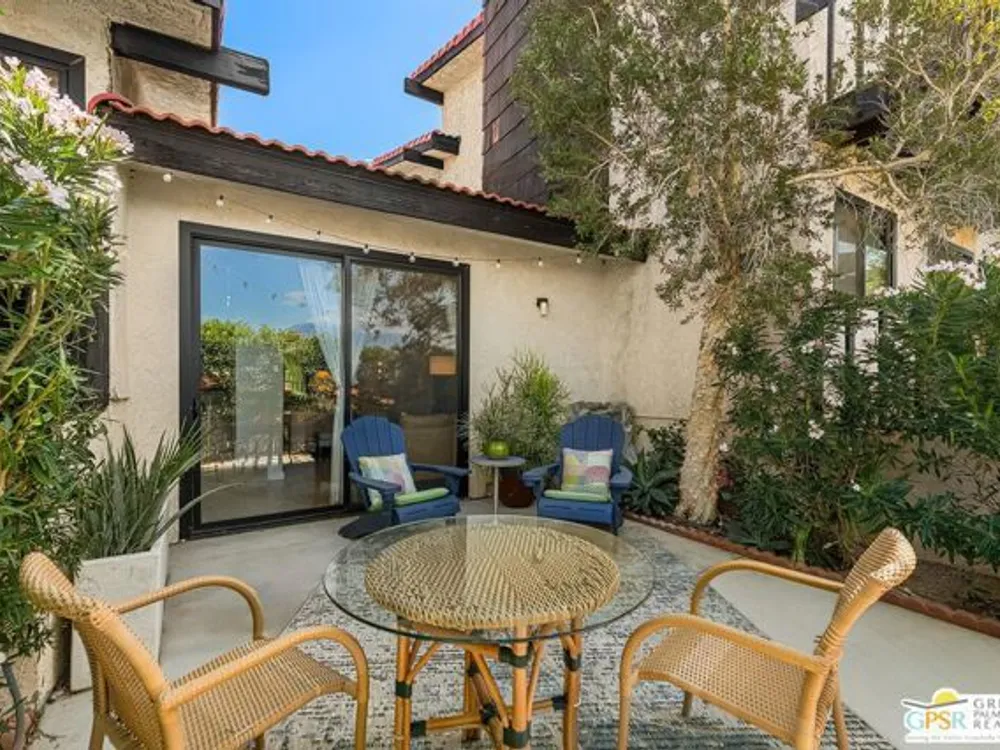 Find your Zen with your own private natural mineral spa and breathtaking mountain views. This unique Desert Hot Springs townhome combines comfort, space, and rare amenities. With over 2,100 sq. ft., the home offers 3 bedrooms, 3 bathrooms, a 2-car attached garage, and private laundry. The living room features a stacked-stone gas fireplace and wet bar, while the updated kitchen includes newer cabinetry and stainless steel appliances. A private back patio extends your living space outdoors. Two large ensuite bedrooms upstairs open to an adjoining front balcony. The highlight of the home is the indoor atrium with its own hot natural mineral water spa, providing a private retreat within your walls. Set in a quiet 26-residence community, the property is surrounded by impeccably maintained grounds and offers access to a mineral water pool, hot tub, and tennis court, all just steps away. A rare opportunity to enjoy the healing qualities of mineral water and breathtaking views in a low-density, well-kept community. 55+ plus community.