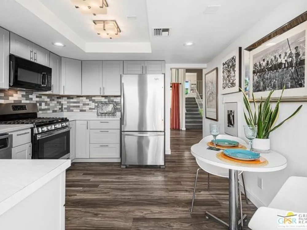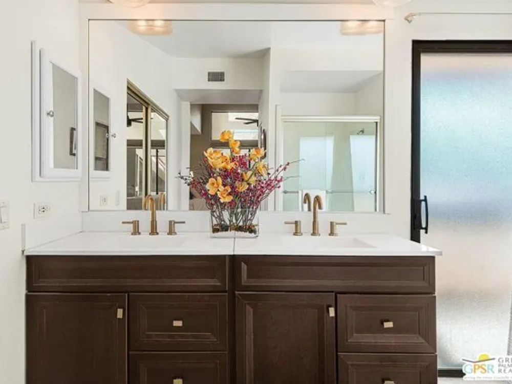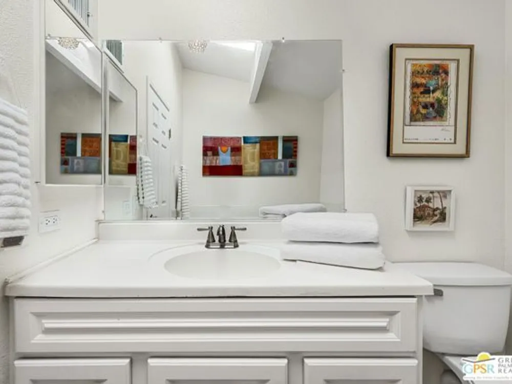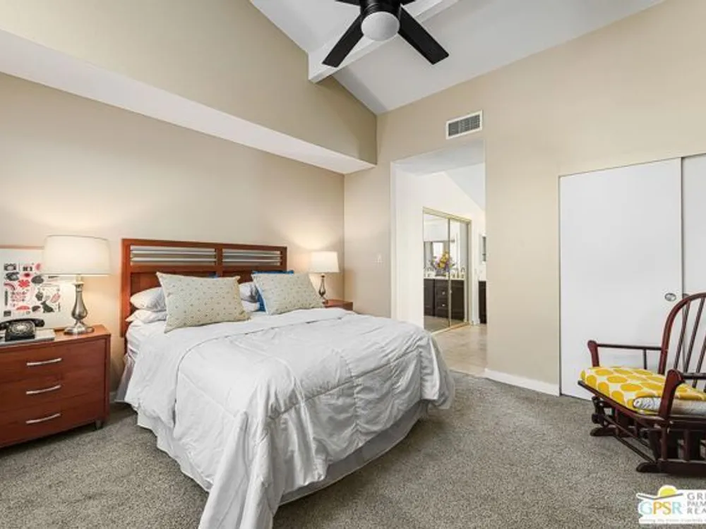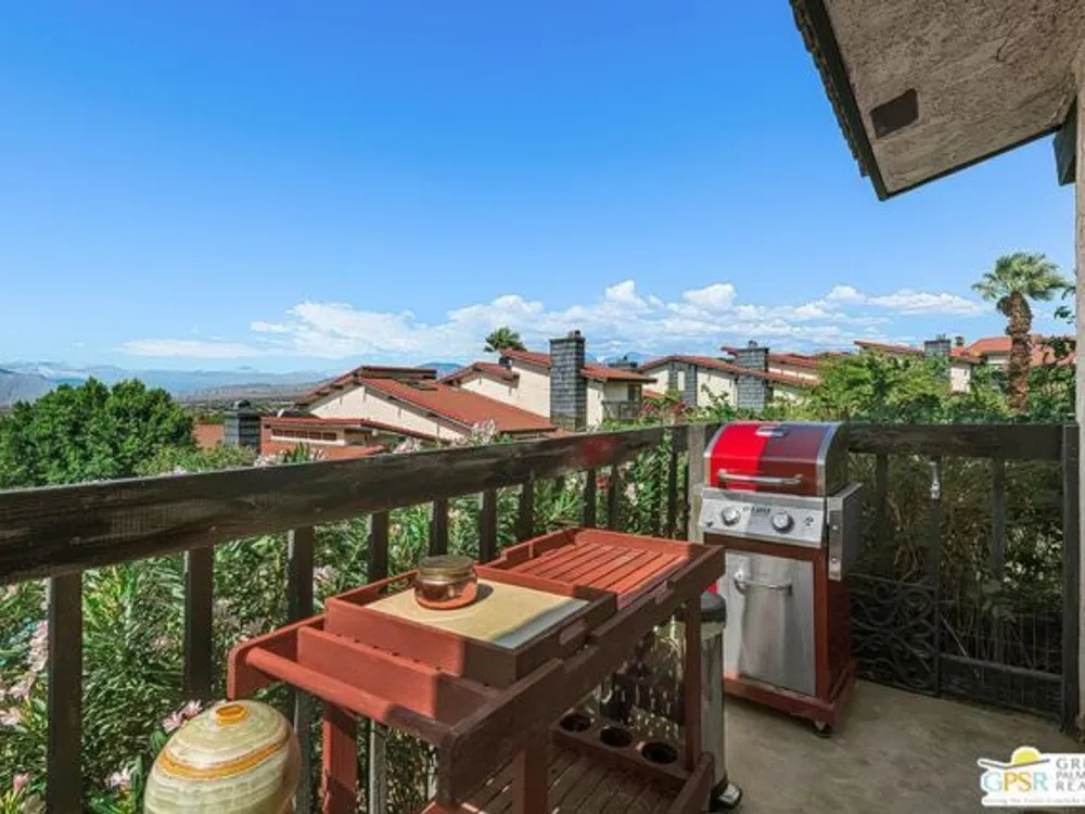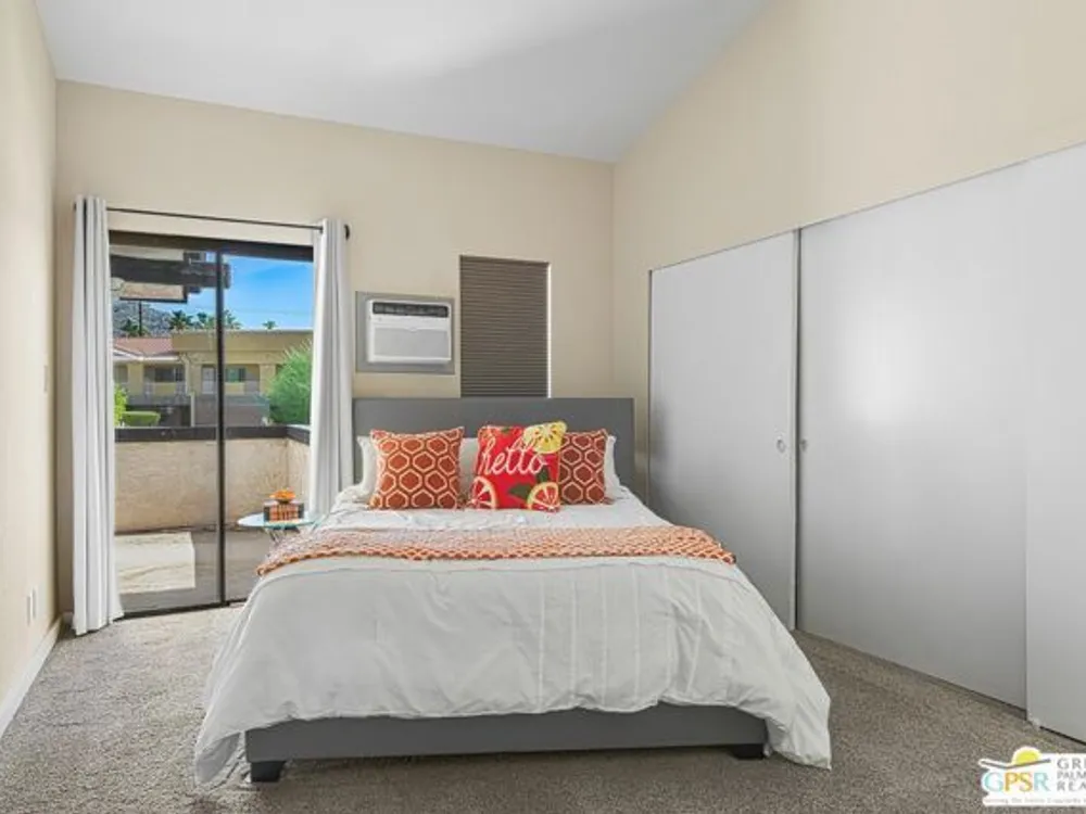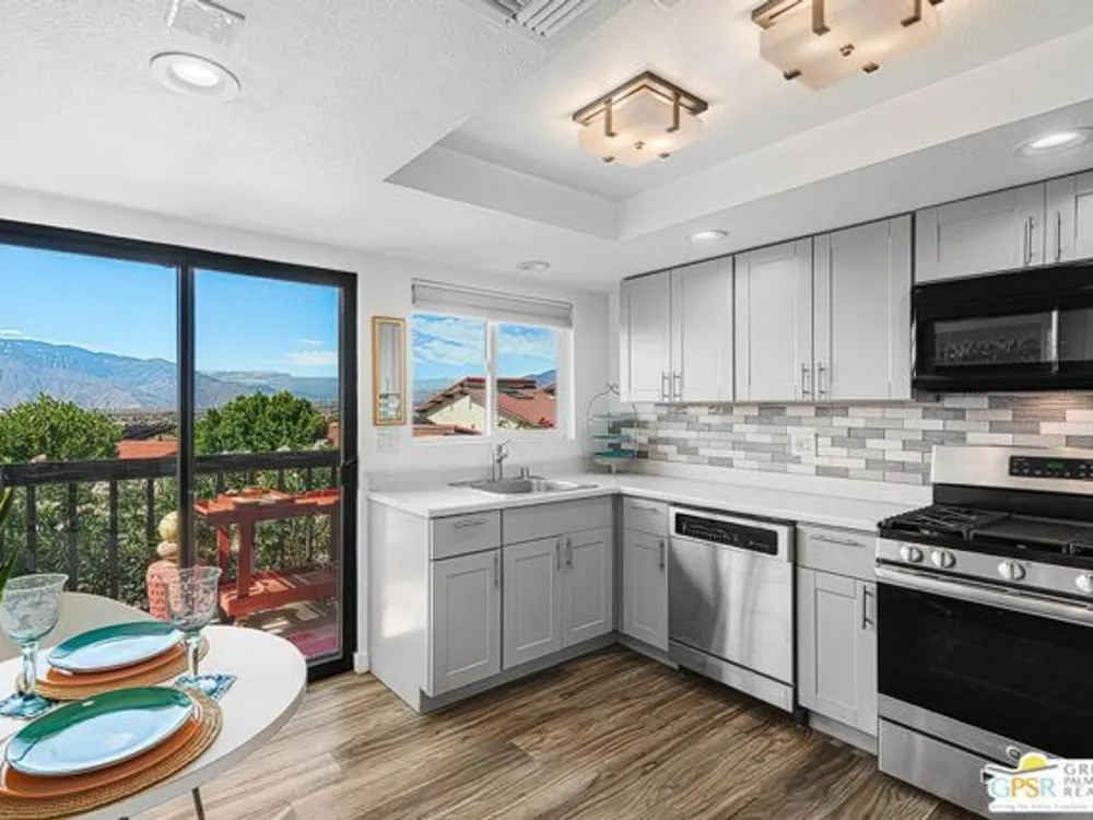 Find your Zen with your own private natural mineral spa and breathtaking mountain views. This unique Desert Hot Springs townhome combines comfort, space, and rare amenities. With over 2,100 sq. ft., the home offers 3 bedrooms, 3 bathrooms, a 2-car attached garage, and private laundry. The living room features a stacked-stone gas fireplace and wet bar, while the updated kitchen includes newer cabinetry and stainless steel appliances. A private back patio extends your living space outdoors. Two large ensuite bedrooms upstairs open to an adjoining front balcony. The highlight of the home is the indoor atrium with its own hot natural mineral water spa, providing a private retreat within your walls. Set in a quiet 26-residence community, the property is surrounded by impeccably maintained grounds and offers access to a mineral water pool, hot tub, and tennis court, all just steps away. A rare opportunity to enjoy the healing qualities of mineral water and breathtaking views in a low-density, well-kept community. 55+ plus community.