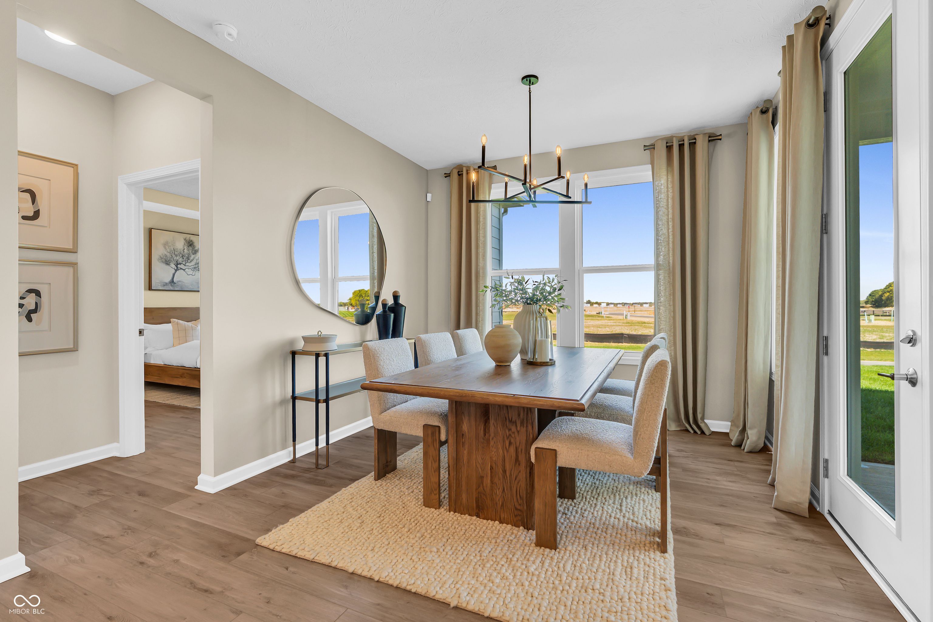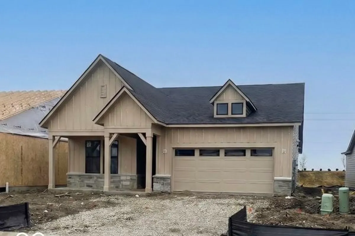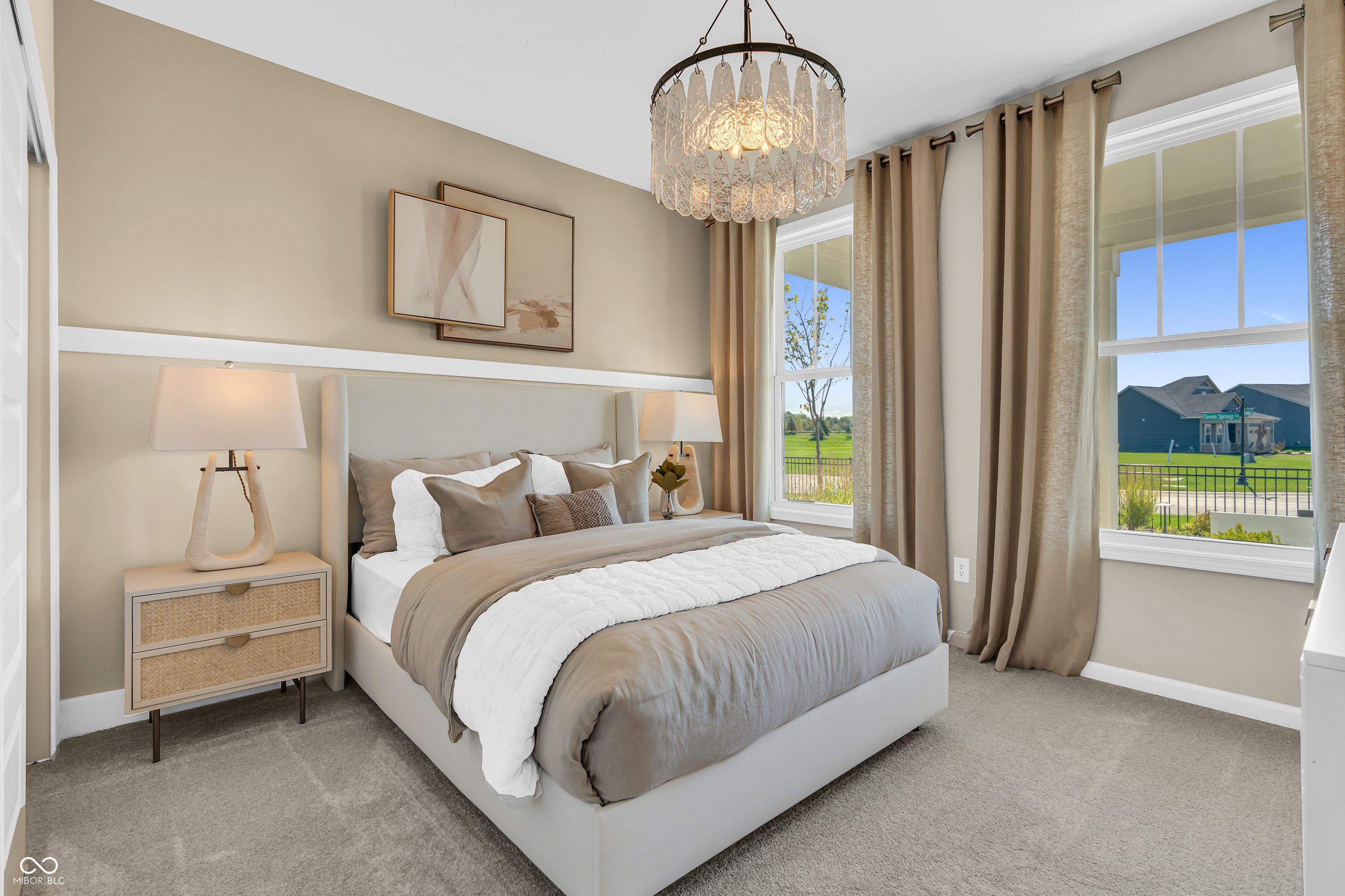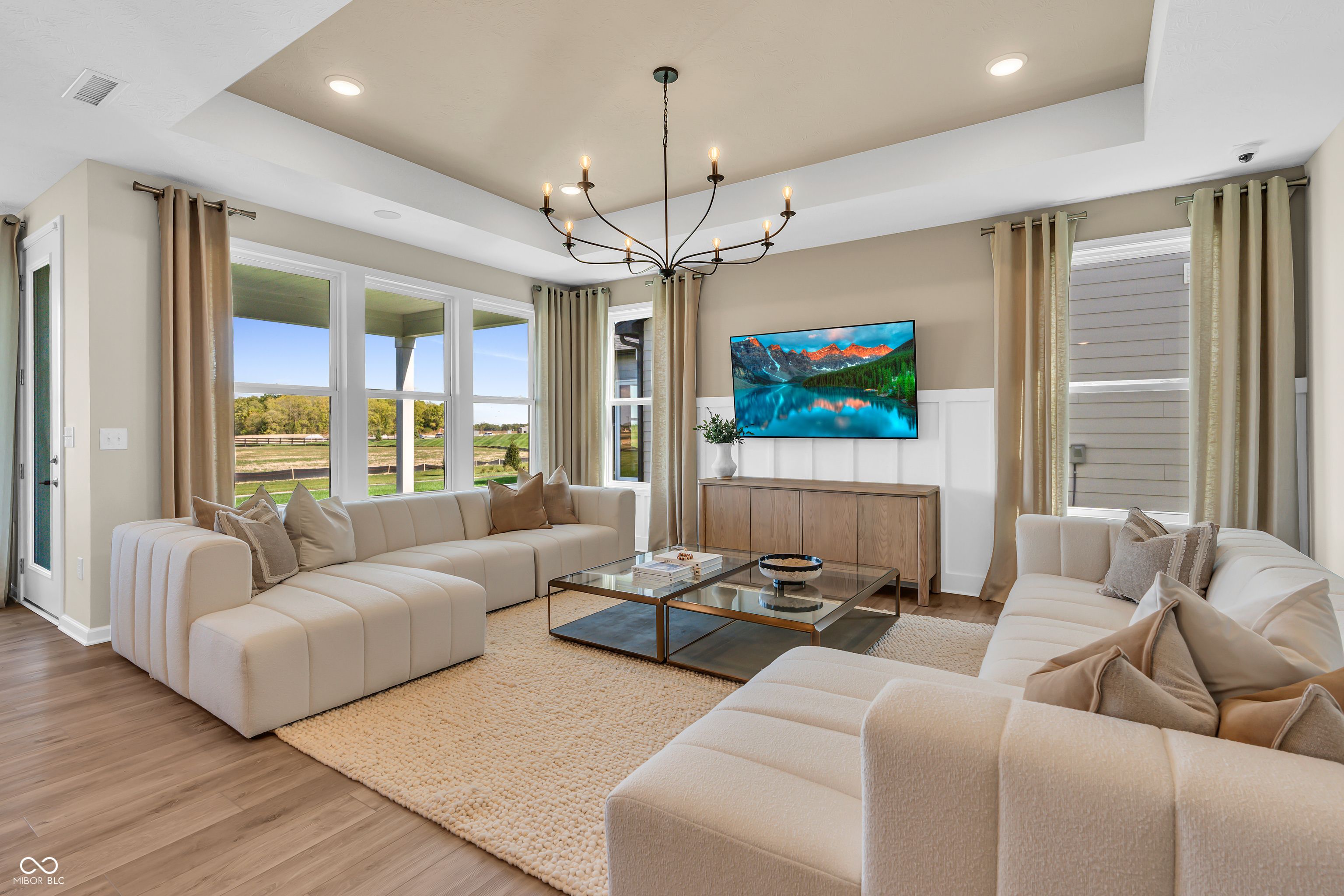 Discover refined, low-maintenance living in the beautifully crafted Mystique floorplan at Finch Creek by Del Webb, an exceptional 55+ community designed for the way you live today. At the heart of the home, the designer kitchen impresses with 42" creamy white cabinetry, striking 3cm Calacatta Elysio quartz countertops, a built-in stainless steel oven and microwave, gas cooktop, and an oversized island. The open-concept layout flows effortlessly into the spacious gathering room with fireplace, highlighted by an elegant tray ceiling and an inviting cafe-style dining area. Step outside to the extended covered patio, ideal for morning coffee, evening relaxation, or entertaining guests year-round. The private owner's suite serves as a tranquil retreat, featuring a spa-inspired tiled shower, double-sink quartz vanity, and a generous walk-in closet. A secondary bedroom is thoughtfully positioned near a full bath. Just off the foyer, a versatile flex room enclosed with French doors provides the perfect space for a home office, study, or hobby room. Completing the home is an expansive 586-square-foot garage, offering ample room for vehicles, storage, or your favorite projects. This home blends style, comfort, and functionality-creating the perfect setting to enjoy the next chapter. The Finch Creek by Del Webb community is where lifestyle takes center stage. Residents enjoy TV streaming and internet included, plus convenient seasonal opening and closing of irrigation systems. The resort-style amenities include indoor and outdoor pools, a state-of-the-art fitness center, pickleball and bocce ball courts, and a clubhouse featuring social programming led by a full-time Lifestyle Director. A high-tech simulation room offers virtual golf and other sports, while 8.5 miles of walking trails, pocket parks, and a dog park encourage an active, outdoor lifestyle. Ideally located just minutes from I-69, Hamilton Town Center, top-rated hospitals, golf courses, and downtown Noblesville.