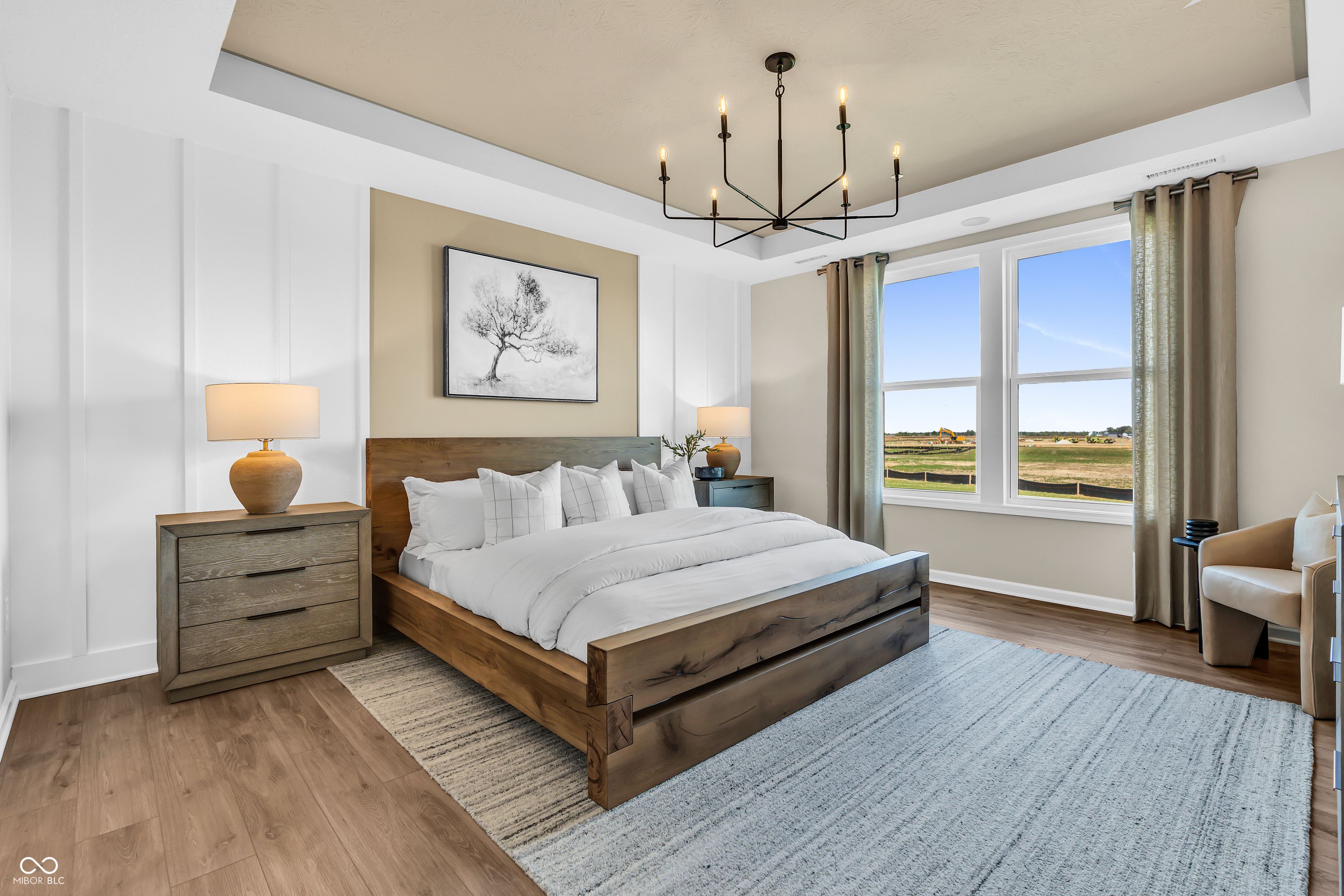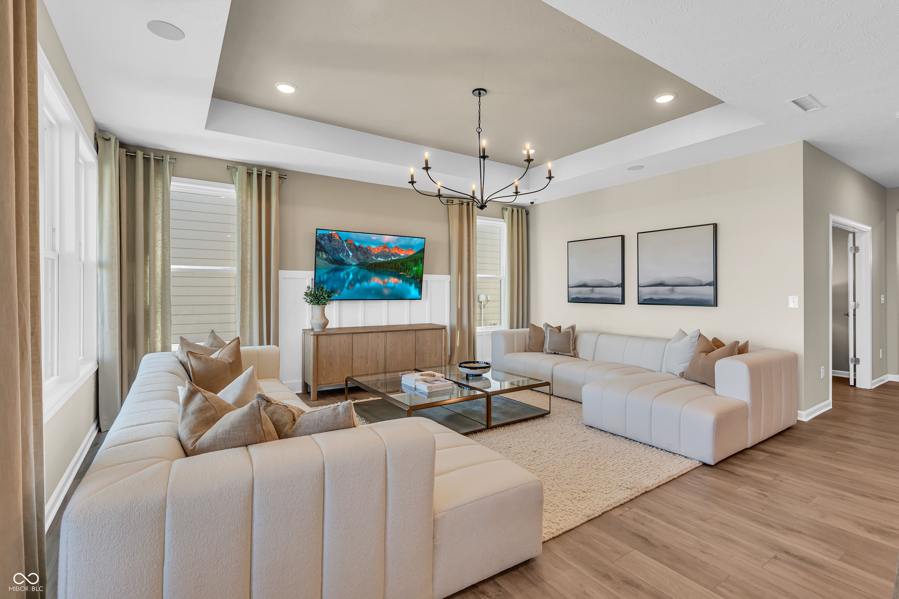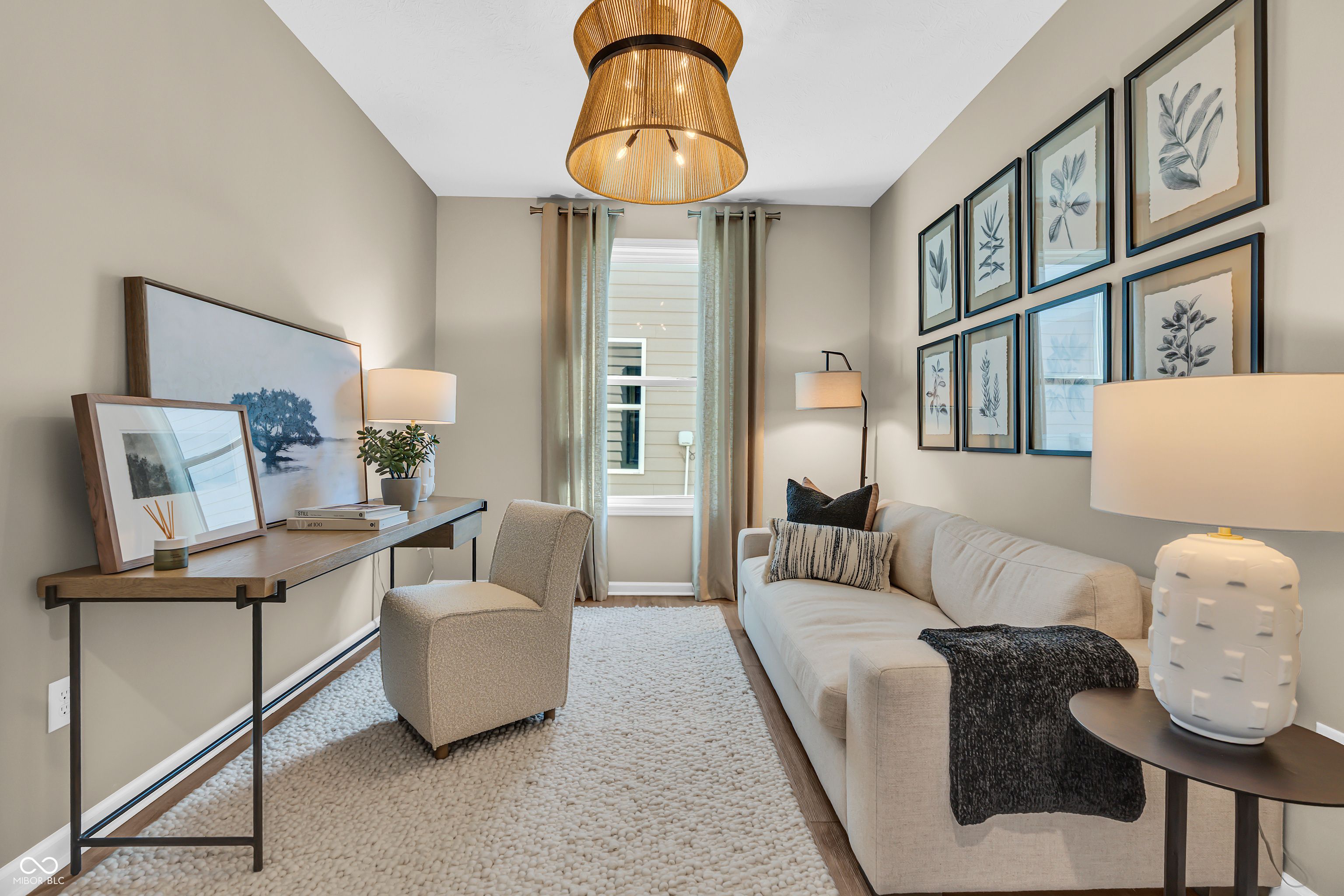 Discover refined, low-maintenance living in the beautifully crafted Mystique floorplan at Finch Creek by Del Webb, an exceptional 55+ community designed for the way you live today. At the heart of the home, the designer kitchen impresses with 42" creamy white cabinetry, striking 3cm Calacatta Elysio quartz countertops, a built-in stainless steel oven and microwave, gas cooktop, and an oversized island. The open-concept layout flows effortlessly into the spacious gathering room with fireplace, highlighted by an elegant tray ceiling and an inviting cafe-style dining area. Step outside to the extended covered patio, ideal for morning coffee, evening relaxation, or entertaining guests year-round. The private owner's suite serves as a tranquil retreat, featuring a spa-inspired tiled shower, double-sink quartz vanity, and a generous walk-in closet. A secondary bedroom is thoughtfully positioned near a full bath. Just off the foyer, a versatile flex room enclosed with French doors provides the perfect space for a home office, study, or hobby room. Completing the home is an expansive 586-square-foot garage, offering ample room for vehicles, storage, or your favorite projects. This home blends style, comfort, and functionality-creating the perfect setting to enjoy the next chapter. The Finch Creek by Del Webb community is where lifestyle takes center stage. Residents enjoy TV streaming and internet included, plus convenient seasonal opening and closing of irrigation systems. The resort-style amenities include indoor and outdoor pools, a state-of-the-art fitness center, pickleball and bocce ball courts, and a clubhouse featuring social programming led by a full-time Lifestyle Director. A high-tech simulation room offers virtual golf and other sports, while 8.5 miles of walking trails, pocket parks, and a dog park encourage an active, outdoor lifestyle. Ideally located just minutes from I-69, Hamilton Town Center, top-rated hospitals, golf courses, and downtown Noblesville.