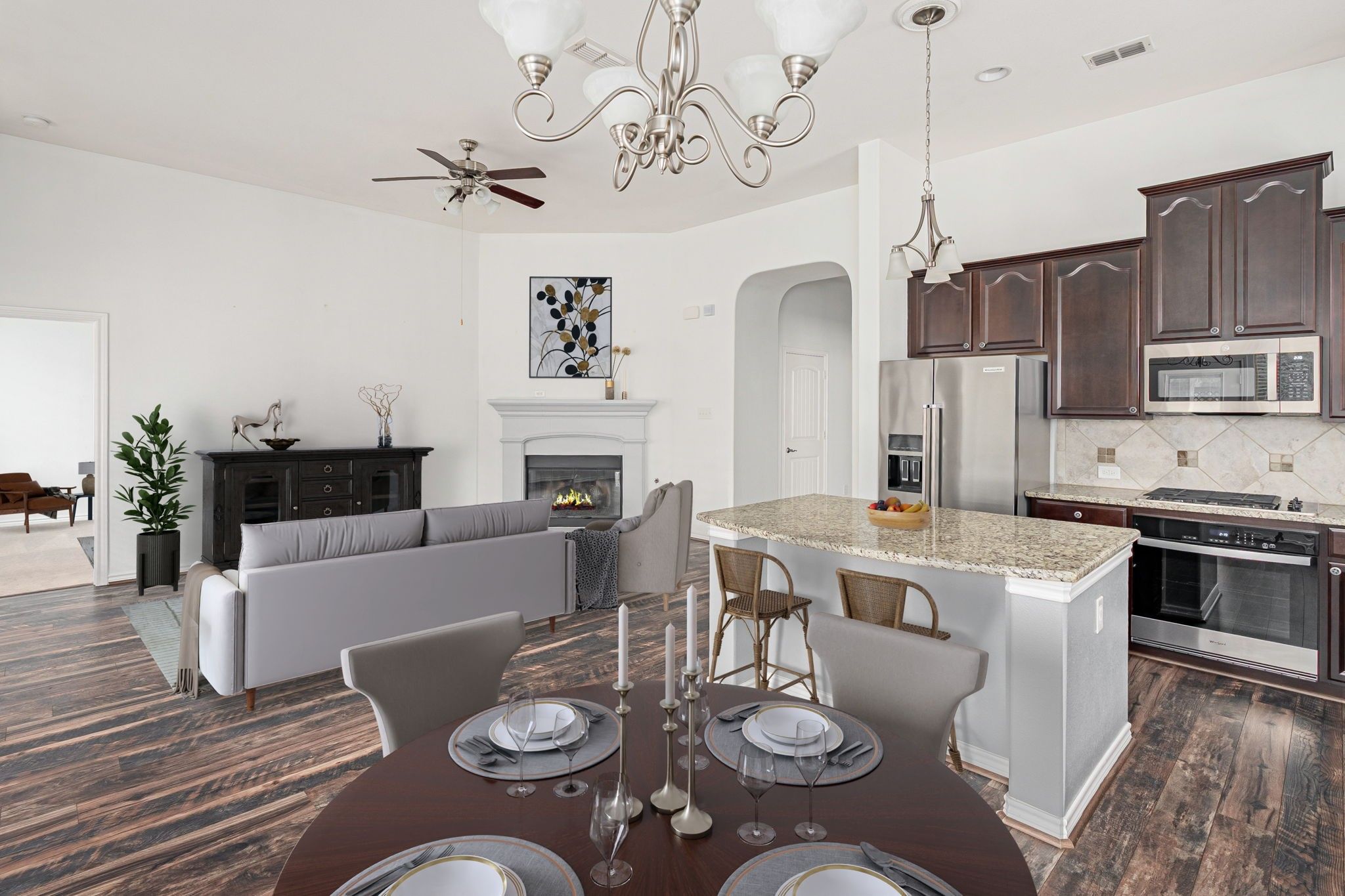 Charming One-Story Home in the Premier 55+ Community of Isabella Village located within the award-winning master-planned neighborhood of Savannah, this beautifully maintained home offers effortless living with front yard service included. The inviting curb appeal features lush landscaping and a welcoming front porch! Step inside to an open-concept layout filled with natural light. Engineered wood flooring flows through the main living areas, while the bedrooms feature carpet. The chef-inspired kitchen boasts beautiful cabinetry, granite countertops, a large island perfect for meal prep or casual dining, stainless steel appliances, a gas cooktop, microwave, dishwasher, and KitchenAid convection oven. The spacious living room impresses with soaring ceiling creating an ideal space for entertaining or unwinding. The private primary suite offers a serene retreat with bay windows, a tray ceiling, and a luxurious en-suite bath complete with dual sinks, an oversized shower with bench seating, and a generous walk-in closet. A dedicated study and a guest bedroom are thoughtfully placed at the front of the home, along with a full hall bath—perfect for visiting friends or family. Enjoy outdoor living on the extended covered patio, perfect for quiet mornings or evening gatherings. Residents of Isabella Village enjoy their own exclusive amenities including a private pool, clubhouse, and fitness center, while also having full access to Savannah’s resort-style offerings—multiple pools, tennis courts, parks, lakes, trails, and more. This is the perfect blend of low-maintenance living and vibrant community lifestyle.