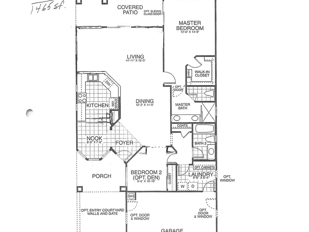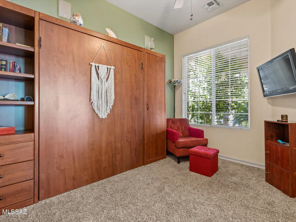 Views of the 6th fairway & mountains from this 1465 sf extended living room Keystone model and is a well-kept one owner home. Kitchen nook has bay window. Kitchen is complete with white appliances (Whirlpool dishwasher, GE smooth glass top electric range, GE Space-maker microwave, Frigidaire refrigerator), extensive cabinets and pantry closet. Great room has lots of windows and sliding glass patio door. Primary bedroom has sliding glass patio door and coffered ceiling, 2nd bedroom/den has a built-in wall bed with wardrobe closet. Ceiling fans throughout. Iron security door at entry. Laundry room comes with washer/dryer and cabinets above plus additional space for more cabinets or desk etc. Garage is complete with built in cabinets & garage refrigerator.