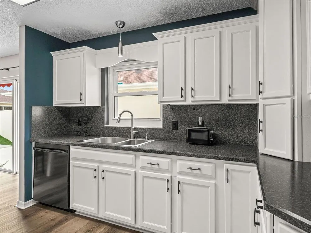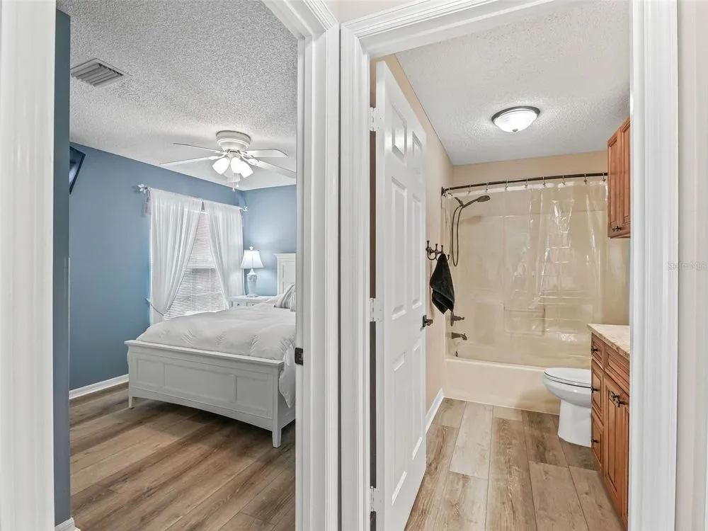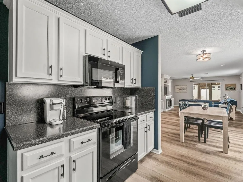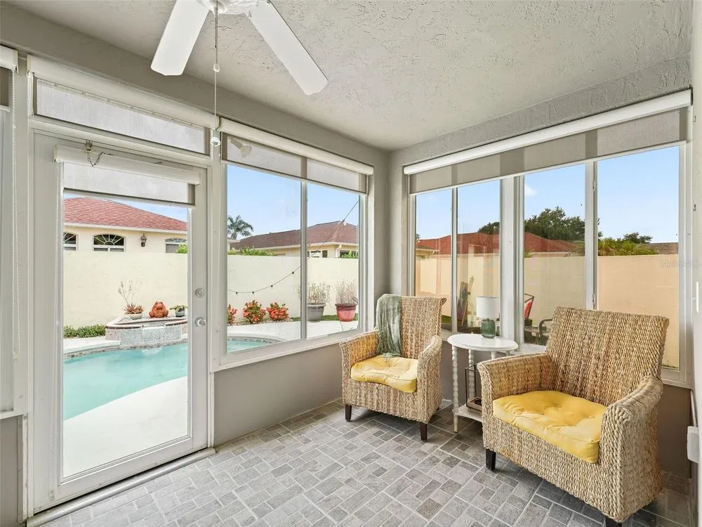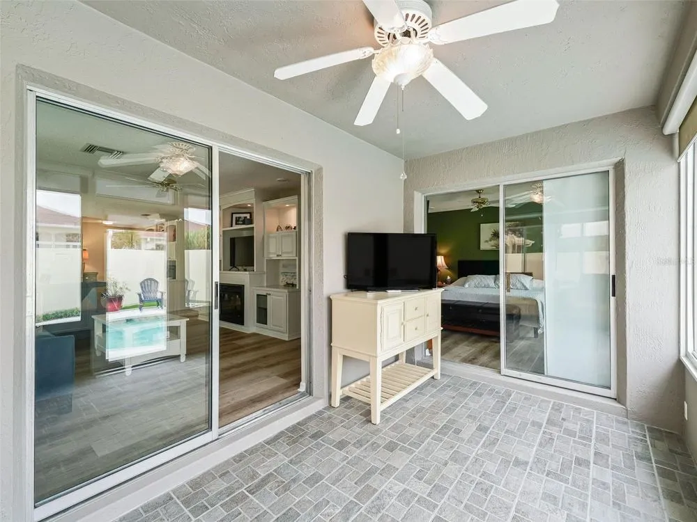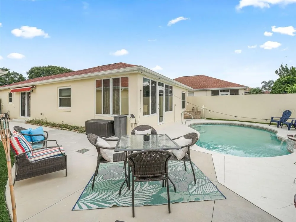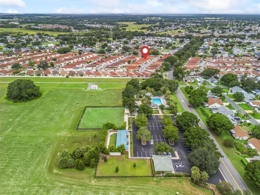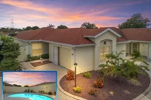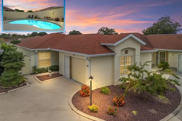 NO BOND! MOVE RIGHT INTO THIS COURTYARD VILLA POOL HOME in the Villas of Rio Grande! Located in very close proximity to Spanish Springs Square, and also close to Lake Sumter Landing! Convenient to everything you could want - a wide variety of shopping, restaurants, medical, etc. plus live entertainment are just a short drive away by car or golf car! NOTHING LEFT TO DO BUT ENJOY LIVING in this METICULOUS Baja model with an open floor plan and a sparkling freeform gunite in-ground pool with a waterfall. BEING OFFERED TURN KEY - save yourself the hassle, just bring your suitcase and toothbrush and start experiencing the fabulous Villages lifestyle right away! Modern luxe living awaits you in the freshly renovated home! NEW BIG TICKET ITEMS such as the ROOF, HVAC, water heater, high definition waterproof plank flooring throughout (have the look and feel of real wood floors but also pool friendly), fresh paint inside and out, a remodeled kitchen with a flat top range, a refrigerator with water, ice and two freezer drawers, and a dual sink. In the living and dining rooms there are custom built-ins with shelving & storage, and a decorative electric built-in fireplace. There are also sliders to the lanai. The lanai is well appointed with large windows and stone tile floors, along with having access to the private courtyard garden with a pool, spacious patios and plantings that are automatically watered as part of the programmable sprinkler system - MINIMAL MAINTENANCE FOR MAXIMUM ENJOYMENT! Both bathrooms have been updated with stylish cabinetry and granite countertops. The primary bedroom suite features sliders to the lanai with the pool just beyond, a private full bath and a walk-in closet decked out with built-in shelving, pendant lighting and a mirror on the wall. The desirable split bedroom floor plan separates the secondary bedroom well, and there is also a conveniently located full bath and linen closet adjacent. The garage is oversized with plenty of cabinets throughout, room for a golf cart in addition to a car or SUV, and also features a new WIFI garage door opener. The front entrance light is WIFI capable as well, offering different color options as well as a programmable schedule. Another great feature is the built-in speakers in the main living areas and the primary bedroom. The laundry area features shelving, a new stylish vanity sink, an HE washing machine and a dryer with dryness sensing technology. As if all of this wasn’t enough, not only is this small enclave of homes a fantastic neighborhood, it also has some special benefits that most do not have - just ask. Right next door to this enclave is the Rio Grande family pool, lawn bowling, air target range and the mailboxes. Right down the street is the Chula Vista Rec Center loaded with amenities such as the newly renovated adult pool which is open later than the rest, golf, pickleball, billiards, tennis, sand courts and more! The TURN KEY PACKAGE includes all furniture - inside and out, kitchenware, appliances and tools, most artwork and decor and flat screen smart TVs in every room. There is also a potential for a larger driveway to park another golf cart if you remove the landscaping next to the gate at the front entrance. ATTENTION TO DETAIL HAS NOT BEEN MISSED HERE! Don’t miss this rare opportunity to have a well-appointed block home with a pool and minimal maintenance at this price! Come and see for yourself, and make this wonderful house your new home!