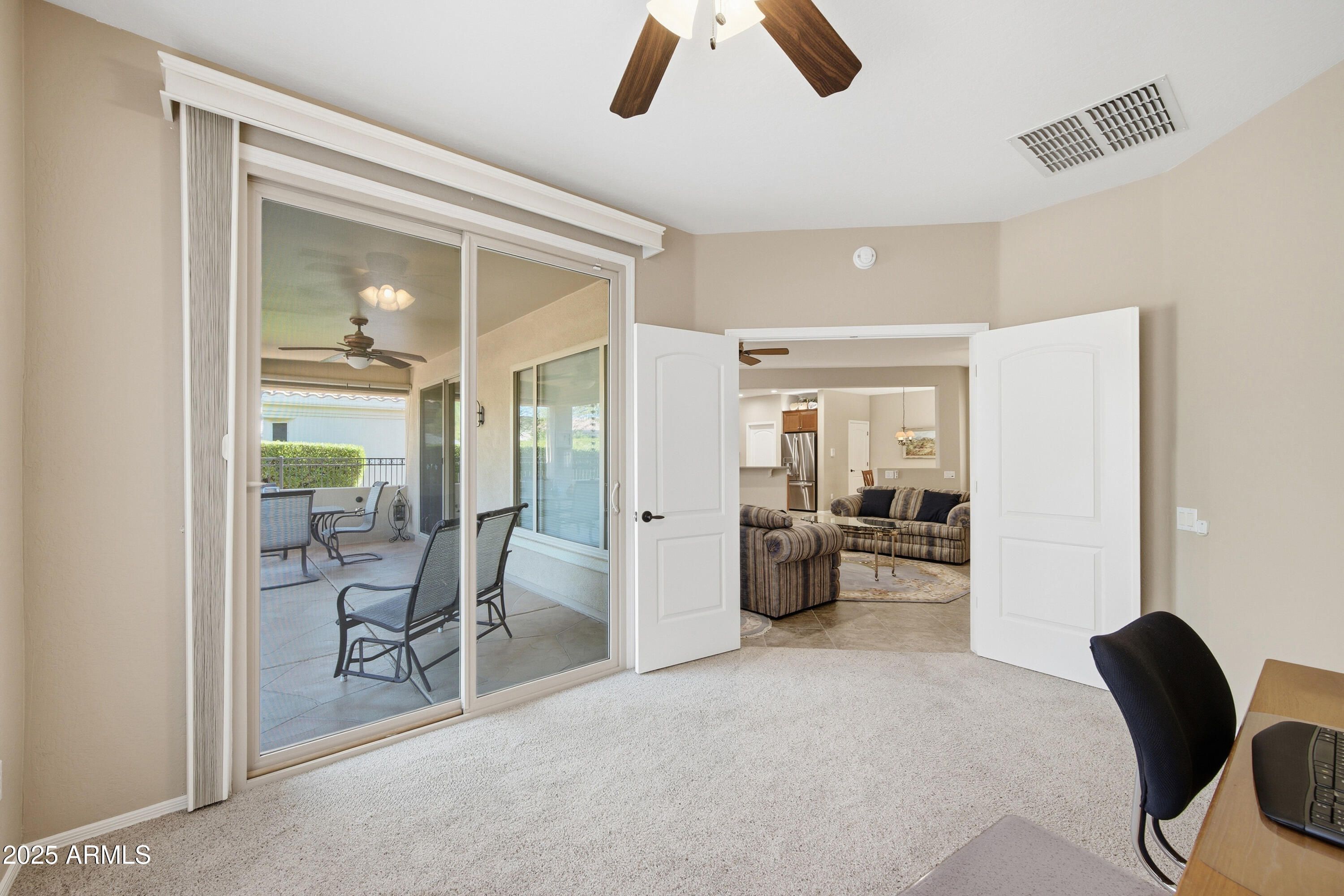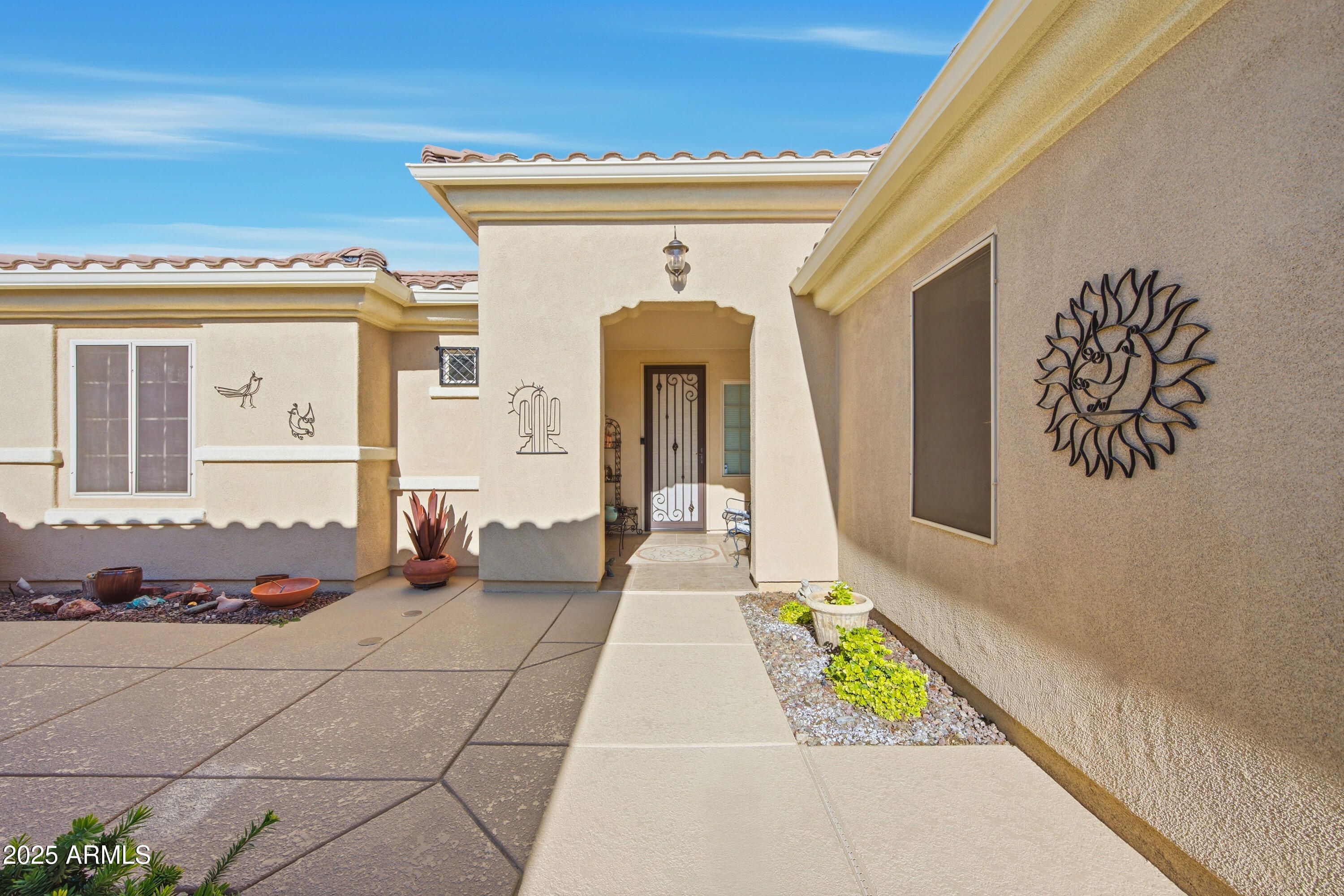 Welcome to this exquisite estate located in the prestigious gated community of Corte Bella. This San Ysidro model offers an exceptional blend of luxury, comfort, and versatility, featuring 2 bedrooms, a private office/den, and a detached studio casita (3rd bedroom and bathroom), all centered around a beautifully designed private courtyard. From the moment you arrive, you'll be captivated by the custom iron courtyard gate, upgraded front door, and lush landscaping, setting the tone for refined desert living. Inside, the home opens to a bright and spacious open-concept living area, where expansive windows flood the space with natural light. The elegant family room is highlighted by a custom media wall with fireplace, seamlessly connecting to the kitchen. Make this your next home! ideal for entertaining or relaxing evenings at home. The thoughtfully designed floor plan provides generous secondary bedrooms, a flexible office/den, and convenient access to full bathrooms. The studio casita offers endless possibilities perfect for guests, a private retreat, or creative space while maintaining privacy from the main residence. More than just a home, this property delivers a resort-style lifestyle, combining serene waterfront views, architectural elegance, and the unmatched amenities of Corte Bella. A rare opportunity to own one of Sun City's most desirable offerings this home truly has it all.