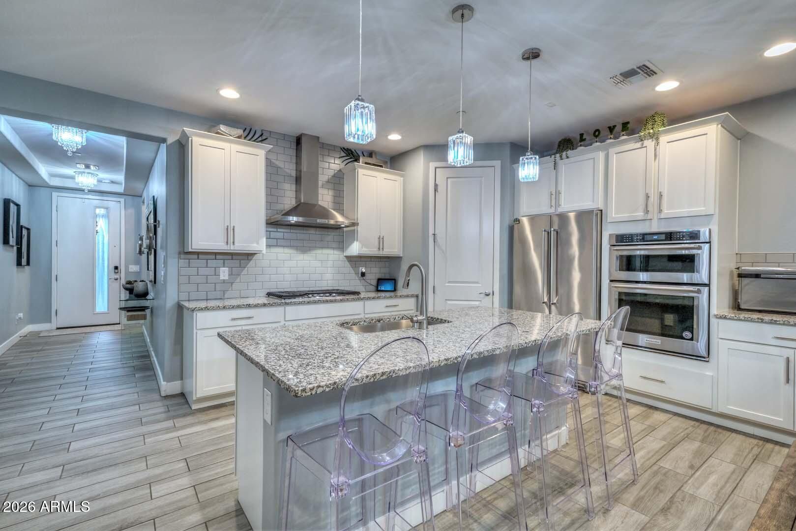 Exceptional curb appeal welcomes you with a striking stone façade, low-maintenance synthetic grass, and RV gate. The resort-style backyard features a private pool and spa, extended paver pool deck, synthetic turf area, and a shaded ramada—perfect for entertaining or relaxing. Inside, the gourmet kitchen shines with white shaker cabinetry, granite countertops, and a white subway tile backsplash extending to the ceiling, plus stainless appliances including wall oven, gas cooktop, and hood. A private guest suite offers a living area, bedroom, and en suite bath, ideal for multi-generational living or visitors. Custom lighting throughout the home and custom designer bathrooms as well! If you're looking for a newer home with private pool and guest quarters, this is the one! opening seamlessly to the dining and great room. Expansive four-panel sliding doors lead to a resort-style backyard with a gas-heated pool and spa, tranquil water features, covered patio, gazebo, and an additional turf side yard ideal for pets or extended outdoor living. The primary suite serves as a peaceful retreat with dual vanities and a striking dual-head shower finished in Turkish marble. Additional upgrades include whole-home water filtration, energy-efficient sun screens, pergola, surround-sound pre-wiring, fire sprinklers, and an RV gate with added parking. A rare opportunity to enjoy a refined, turnkey home without the wait of new construction.