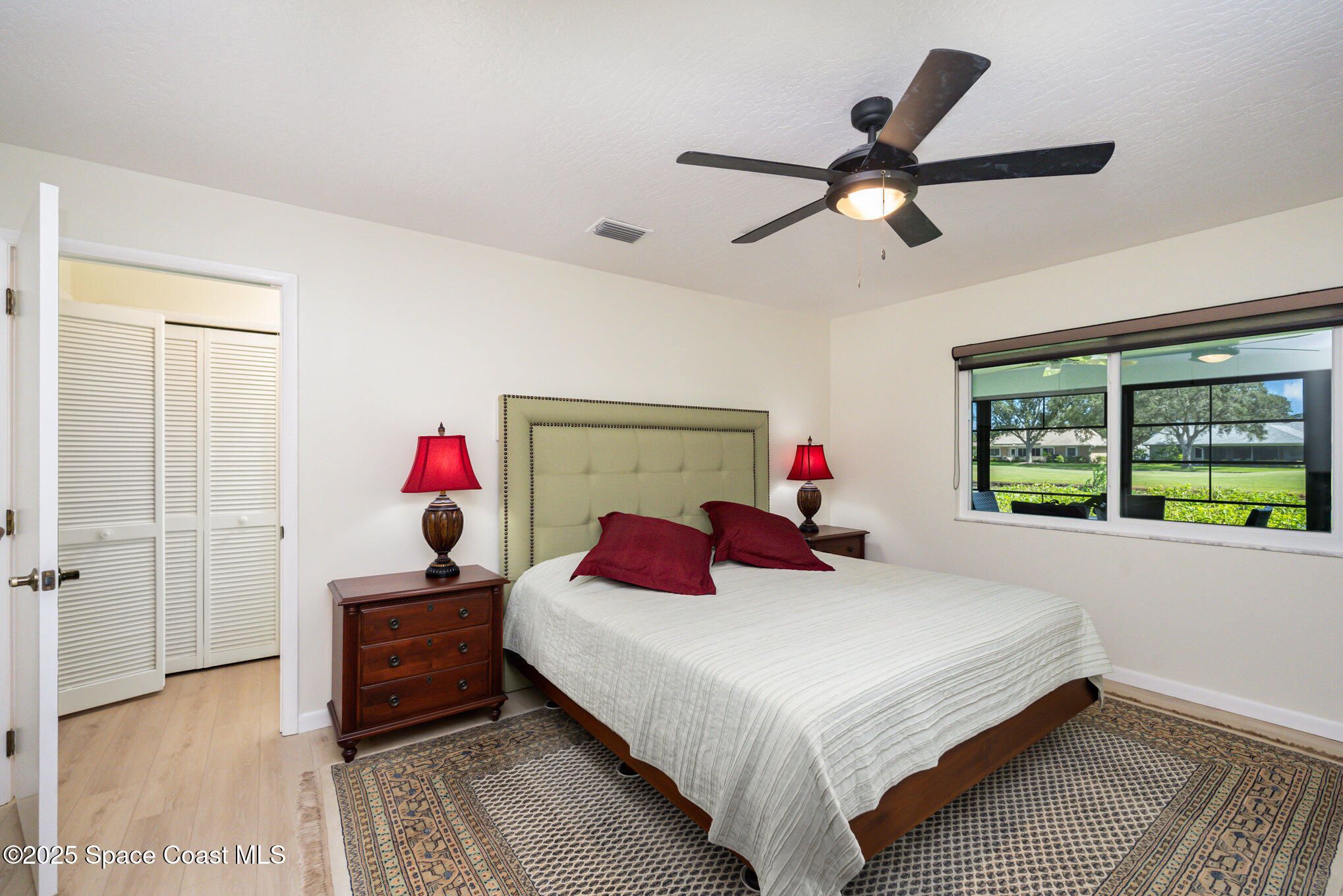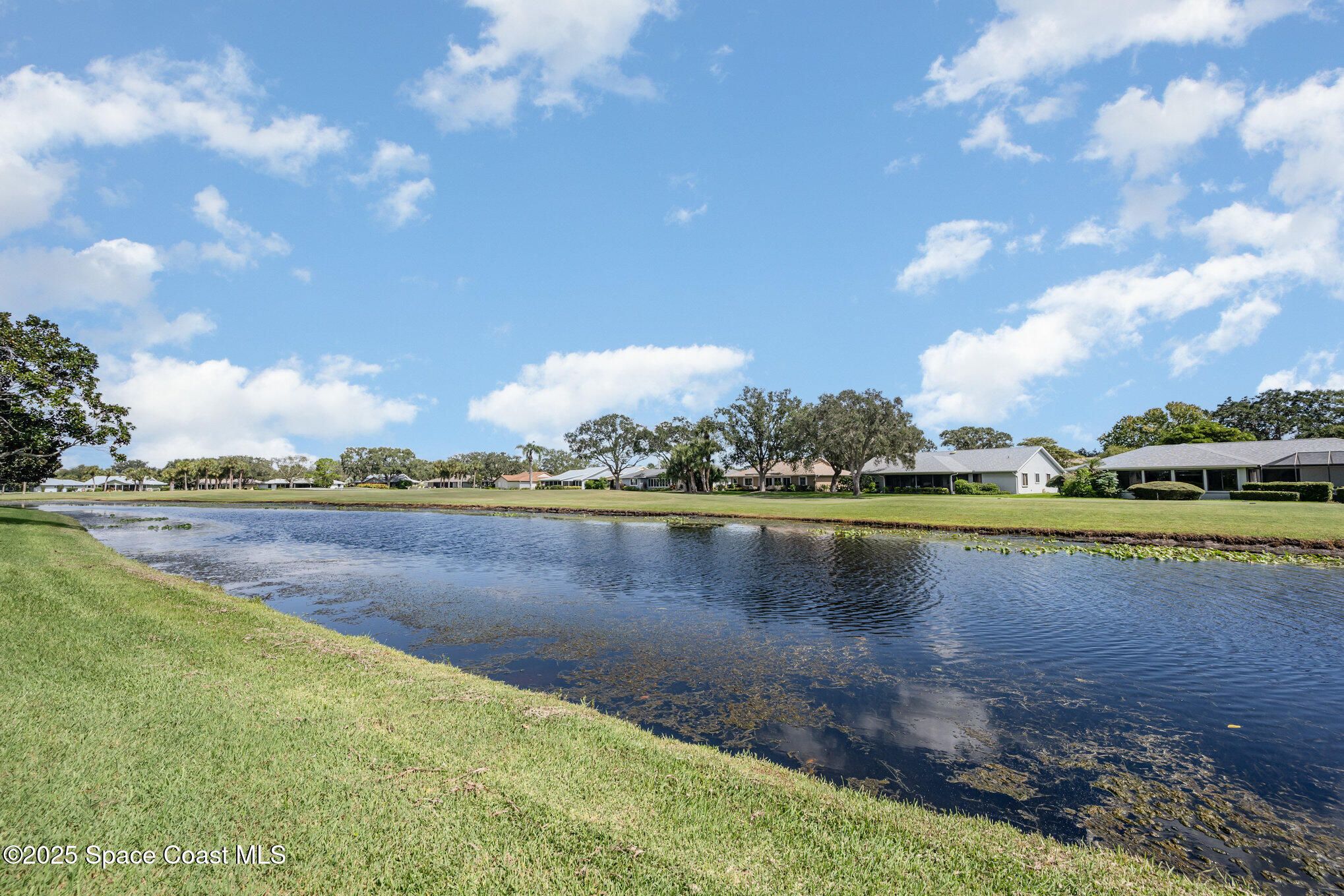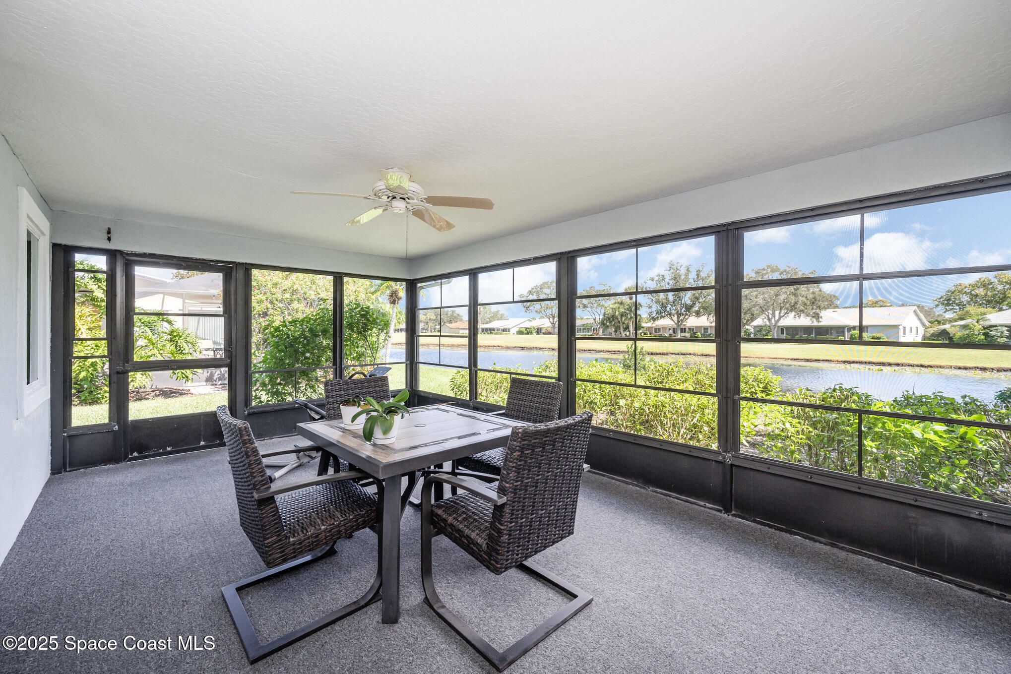 Popular Bangor model featuring stunning water and golf course views, located in a resort-style country club community offering top-notch amenities! This beautifully maintained 2-bedroom, 2-bath home with a 2-car garage offers an expanded Florida room and a large covered lanai—perfect for enjoying the expansive views and Florida lifestyle. Interior highlights include cathedral ceilings, fresh paint, and an indoor laundry room. Recent updates make this home truly move-in ready: 2023 impact-rated windows, remodeled primary bathroom with quartz countertop, roll-in shower with frameless glass door, porcelain tile, LVP flooring, new toilet, and fixtures. The primary bedroom features new glass-pane French doors and LVP flooring (2023), while the guest bedroom was also updated in 2023 with matching French doors and LVP flooring. Additional improvements include a 2025 impact-rated garage door, 2023 custom zebra shades on all windows, a 2025 front screen enclosure, and a refreshed guest bathroom (2025). HVAC ducts were professionally cleaned in 2025. This home combines comfort, style, and peace of mind with modern updates and gorgeous views ready for its next owner to enjoy! Home to over 600 military veterans, Indian River Colony Club is a private 55+ country club community offering a unique blend of camaraderie, comfort, and care. Residents enjoy an extensive home maintenance program and access to exceptional amenities, including an 18-hole golf course, fine dining with an executive chef, the casual 19th Hole restaurant and bar, fitness center, heated pool, tennis, croquet, bocce ball, shuffleboard, and more. This pet-friendly, gated community boasts over 60 social and activity groupsmaking every day feel like a vacation.