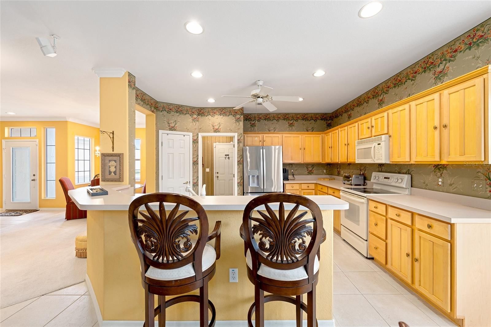 First time on the market! This charming 2-bedroom, 2-bath Madeira model with a front courtyard is being sold turnkey — including a gas golf cart! This popular floor plan offers comfort and functionality, featuring tile and carpet flooring and an enclosed lanai with acrylic windows, horizontal blinds, and ceramic tile. Step outside to a large pavered patio surrounded by privacy hedges—perfect for outdoor relaxation or entertaining. The kitchen, open to the living and dining rooms, includes maple cabinetry, newer stainless steel refrigerator and dishwasher, recessed lighting, and a closet pantry. A utility room just off the kitchen makes an ideal computer niche or hobby space. The living and dining area boasts crown molding and surround sound, while the primary suite features bay windows, carpet flooring, and an ensuite bath with a step-in shower. The oversized garage offers a washer and dryer, drop-down attic stairs, utility sink, and even two bicycles ready for your use. Major updates include a new roof (2021) and HVAC (2018) for peace of mind. Being sold turnkey — just bring your suitcase! Don’t miss this opportunity to own a beautifully maintained Madeira. See it today!