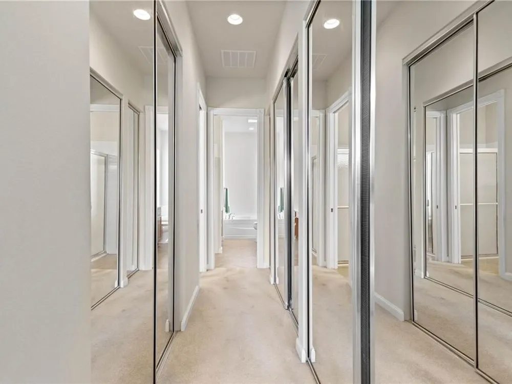 - Built-in Features, High Ceilings, Open Floorplan, Main Level Primary, Solid Surface Counters, Split Bedrooms, Thermostat, Walk-In Closet(s), Window Treatments