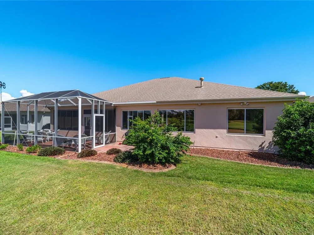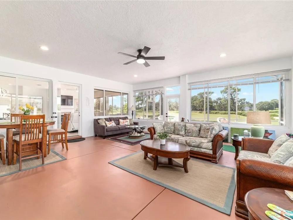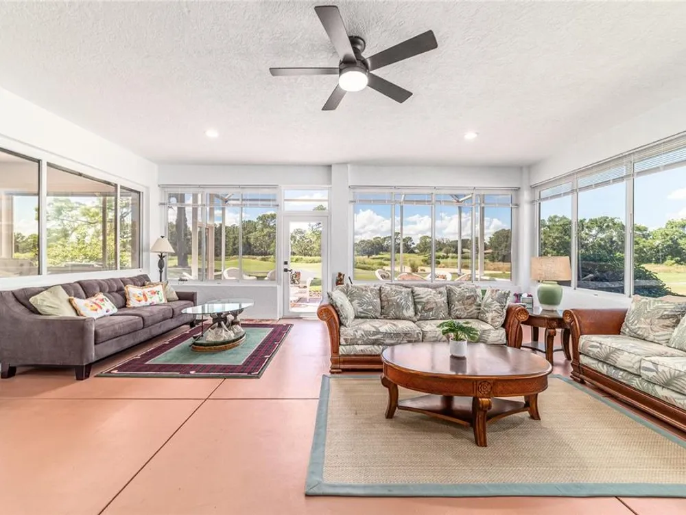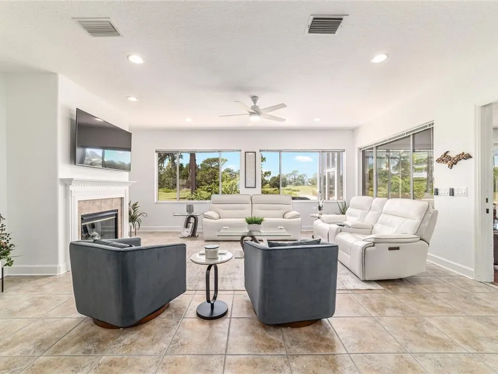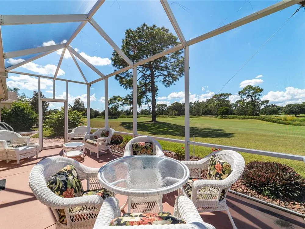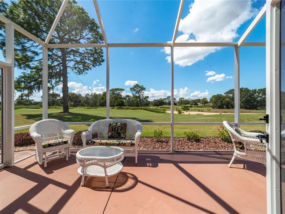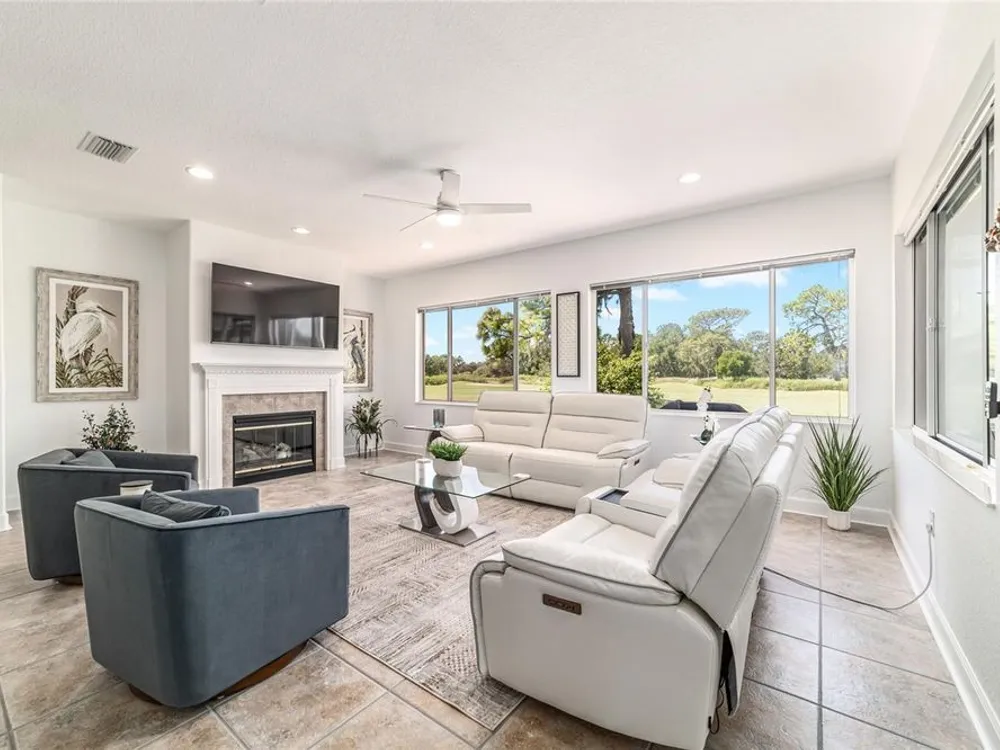 Expansive golf course view with beautiful sunsets! This Williamsburg 2 BR + den, 2.5 BA home with extended garage + golf cart garage offers 2423 sq ft plus a 528 sq ft enclosed lanai. A 24' X 11' birdcage to enjoy watching the golfers tee off. As you enter the home, you are greeted with a stunning baby grand piano. The gorgeous kitchen with a new high end KitchenAid SS suite of appliances including double wall ovens, and 5 burner gas cooktop. Luxury leather granite countertops that are countertop height and widened for eating and serving with marble backsplash make this a show stopper of a kitchen! Laundry room has the same granite, tons of storage space, and a SS utility sink. The lovely gas fireplace in the living room will keep you cozy on the chilly winter nights. Matte black finishes throughout this home, updated lighting, ceiling fans, new electrical switches/outlets make this home upgraded, modern and up to date. This home is turn key, and ready to move in! Your dream home awaits you!