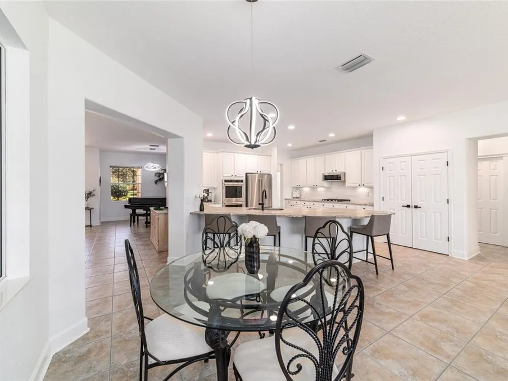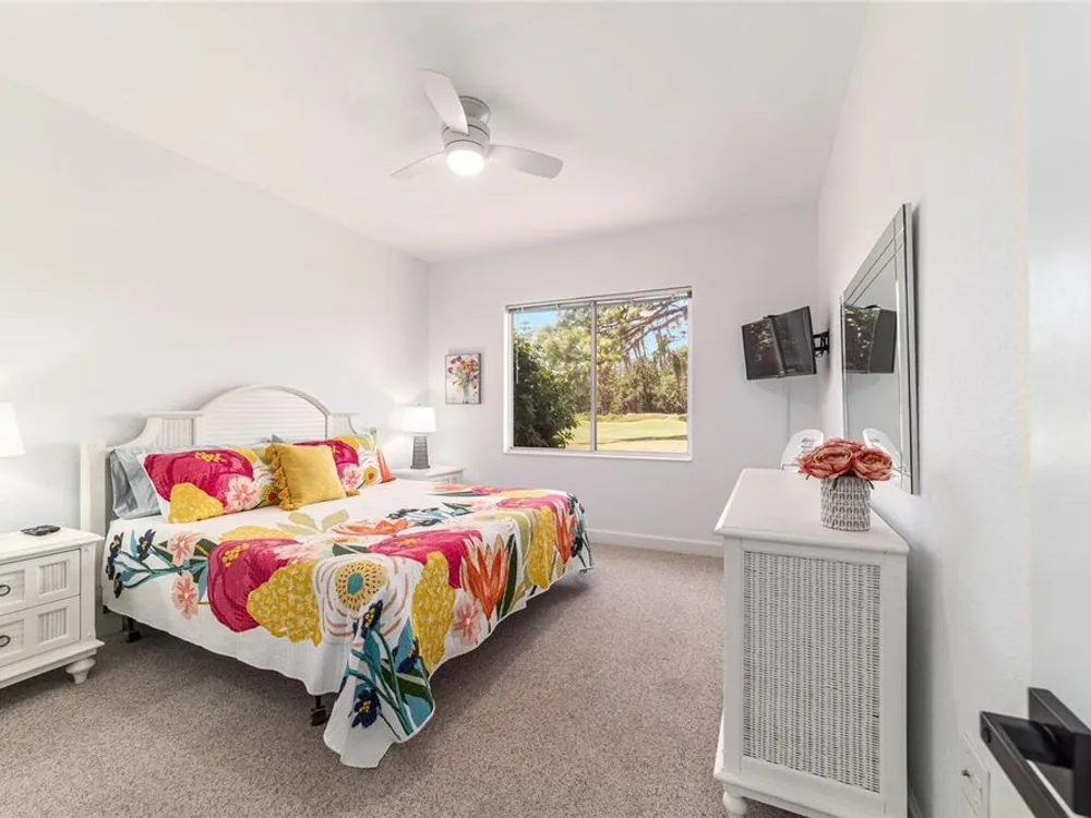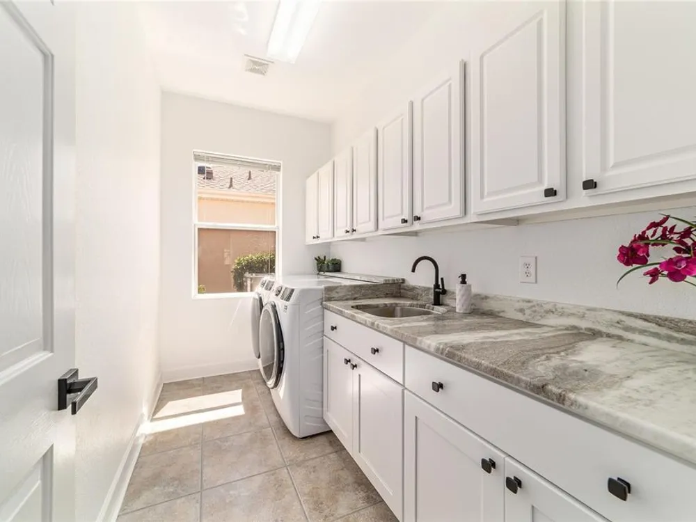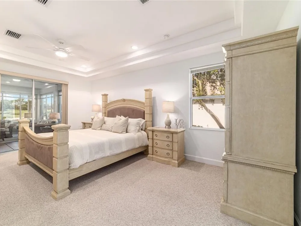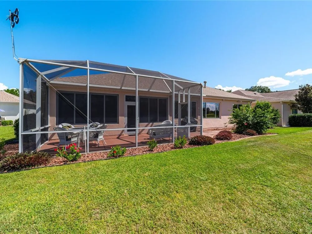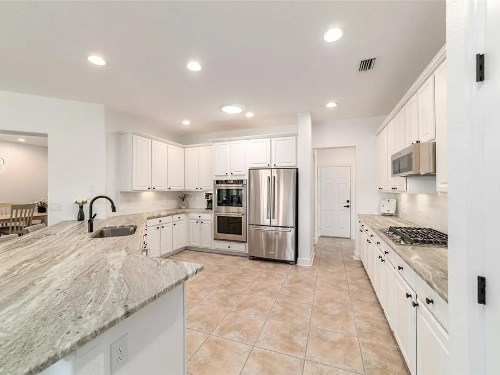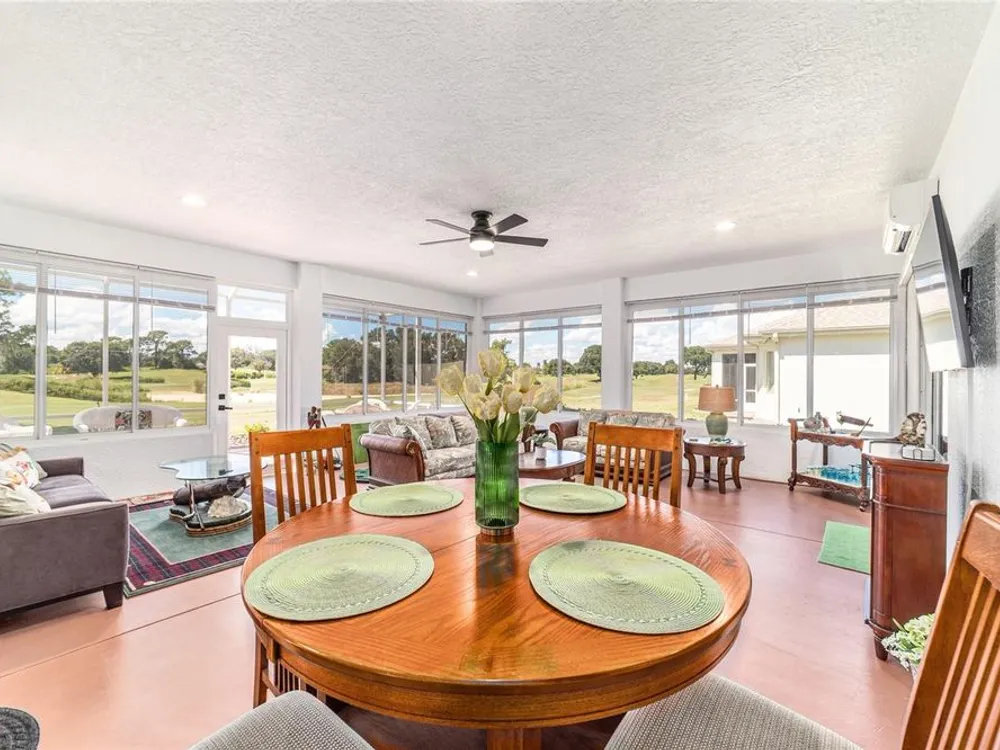 Expansive golf course view with beautiful sunsets! This Williamsburg 2 BR + den, 2.5 BA home with extended garage + golf cart garage offers 2423 sq ft plus a 528 sq ft enclosed lanai. A 24' X 11' birdcage to enjoy watching the golfers tee off. As you enter the home, you are greeted with a stunning baby grand piano. The gorgeous kitchen with a new high end KitchenAid SS suite of appliances including double wall ovens, and 5 burner gas cooktop. Luxury leather granite countertops that are countertop height and widened for eating and serving with marble backsplash make this a show stopper of a kitchen! Laundry room has the same granite, tons of storage space, and a SS utility sink. The lovely gas fireplace in the living room will keep you cozy on the chilly winter nights. Matte black finishes throughout this home, updated lighting, ceiling fans, new electrical switches/outlets make this home upgraded, modern and up to date. This home is turn key, and ready to move in! Your dream home awaits you!
