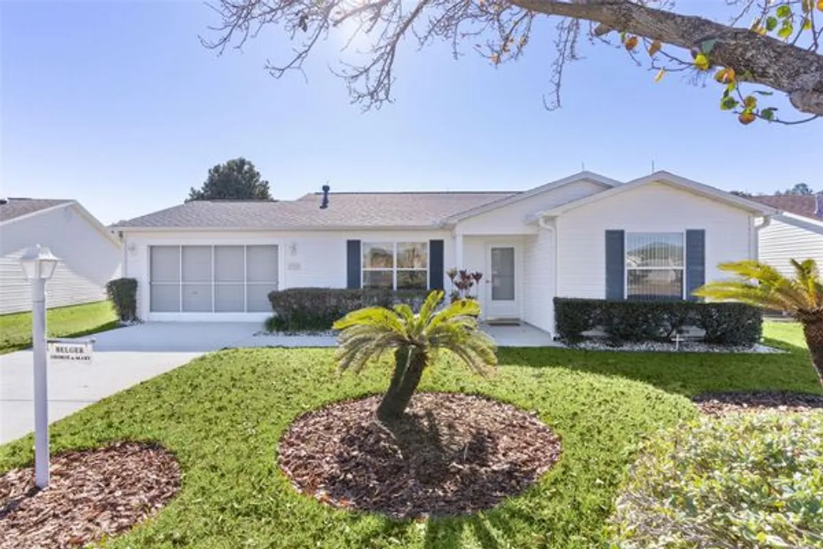 ~NO BOND~ ~2025 HVAC~ ~2019 ROOF~ ~LARGE BACKYARD~ ~FURNITURE PACKAGE AVAILABLE SEPARATELY~ Welcome to this AUSTIN model located in the Village of SANTIAGO nestled on a PRIVATE, OVERSIZED LOT with mature landscaping. Step inside to VAULTED, HIGH CEILINGS and laminate flooring throughout. The living room features a ceiling fan, providing a comfortable and inviting space. The kitchen boasts CERAMIC tile, laminate countertops, and rollout cabinets, perfect for all your cooking needs. The dining room also features HIGH VAULTED CEILINGS, creating an open and airy atmosphere. The primary bedroom offers a ceiling fan, a WALK-IN CLOSET, and an ensuite bath with CERAMIC tile, a walk-in shower, and a linen closet. The guest bedroom includes a built-in closet and ceiling fan, while the guest bath offers CERAMIC tile with a fiberglass tub and shower combo. Relax and unwind in the SCREENED-IN LANAI with RIVER ROCK FLOORING and a ceiling fan, offering a perfect space for enjoying the Florida lifestyle. The 1.5-car garage comes equipped with a laundry area and GE APPLIANCES, adding convenience to your daily routine. A NEW GARAGE DOOR OPENER, laundry tub, attic stairs, and a SLIDING SCREEN DOOR are also a bonus in this space. For your peace of mind, LIGHTNING RODS have been added to the roof. The Hot Water Heater is 2014. This location provides quick and easy access to the Savannah Center, Glenview Country Club, and Polo Fields. With Southern Trace right down E County Rd 466, you have shopping, dining and medical facilities at your fingertips, all just minutes away.