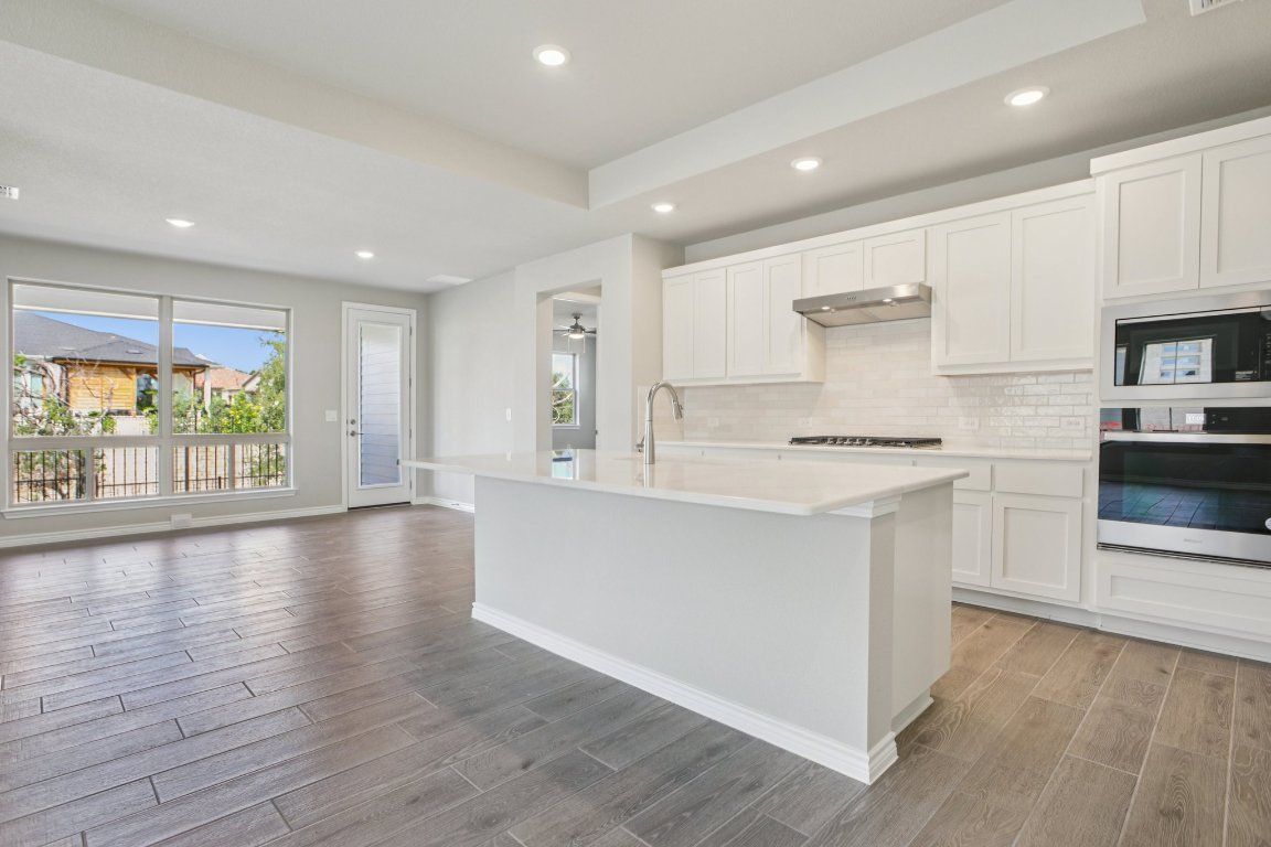 Burke plan with upgraded kitchen, quartz countertops, upgraded PEBBLE flooring, 8' doors throughout, optional tray ceiling in living, optional 2 car side entry garage