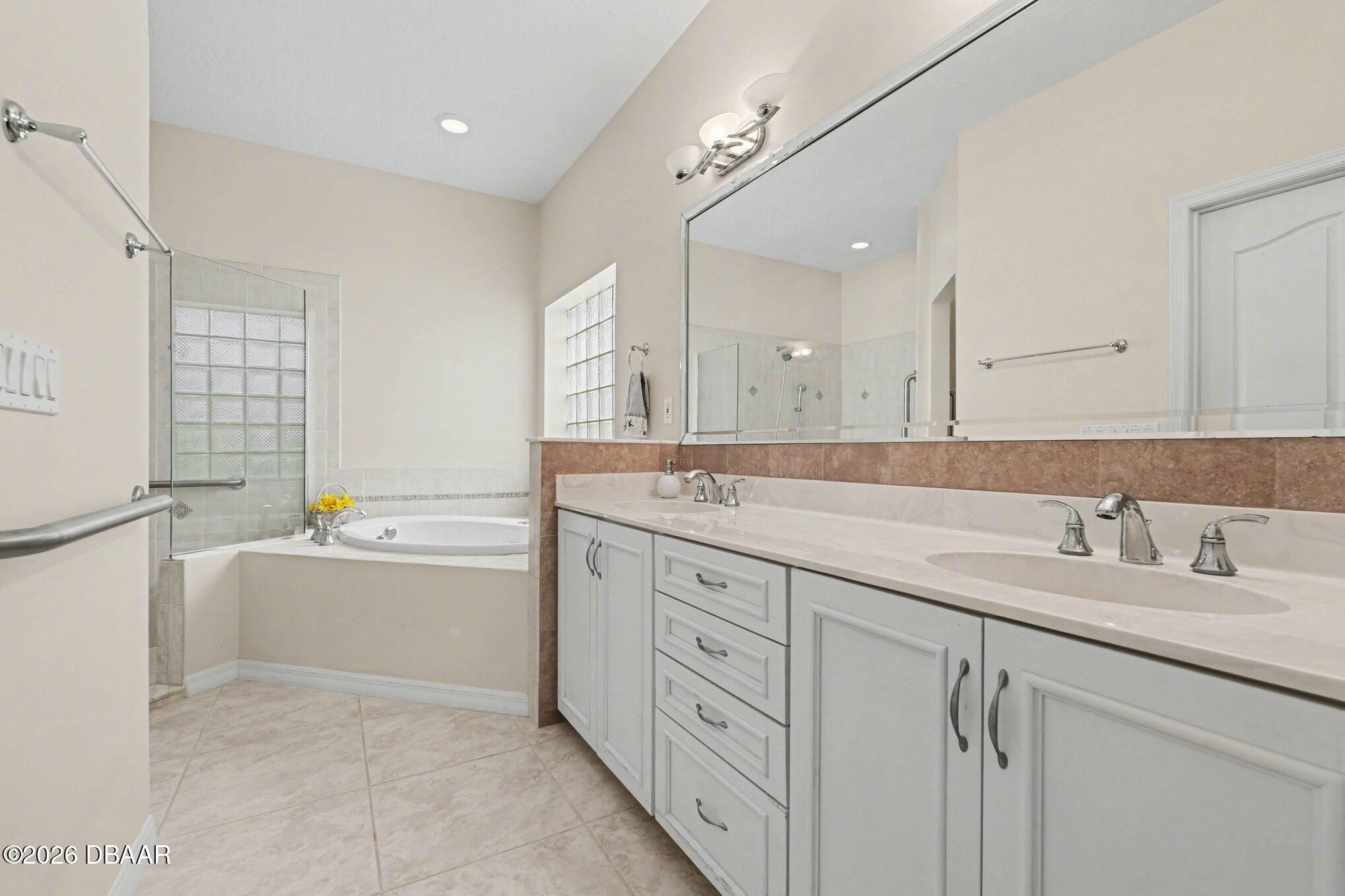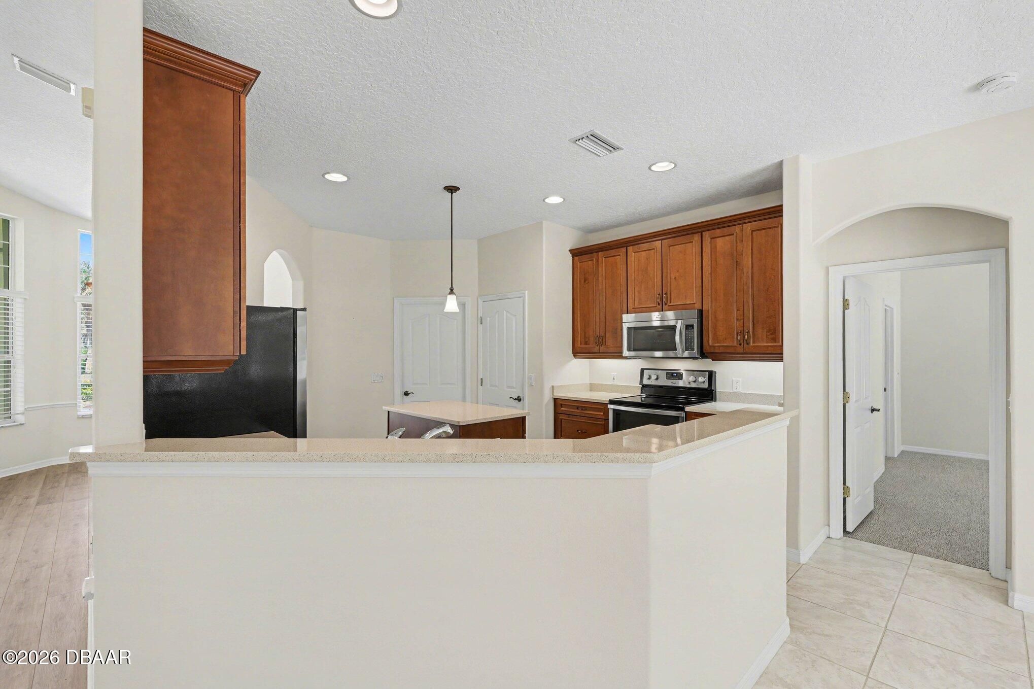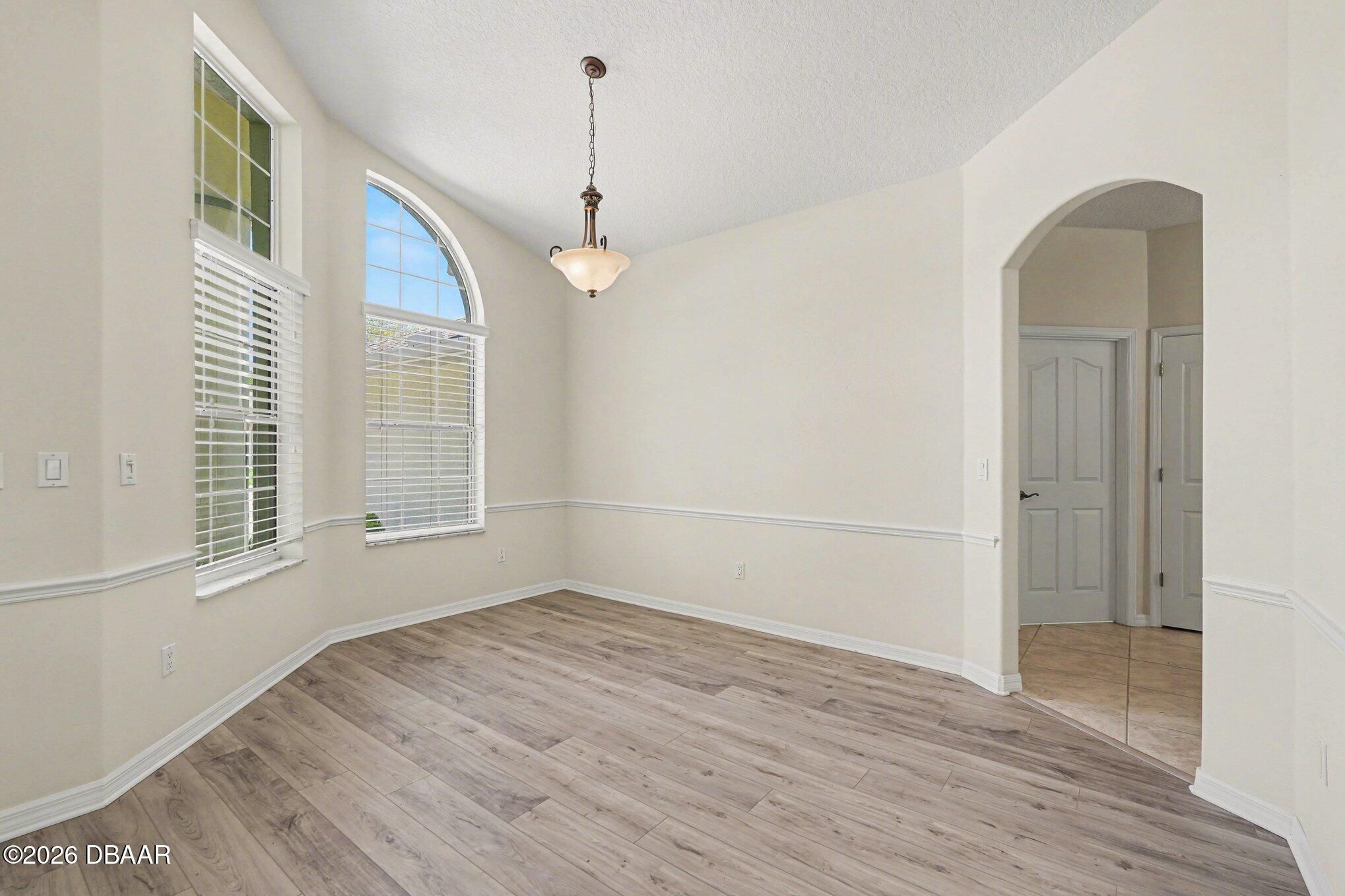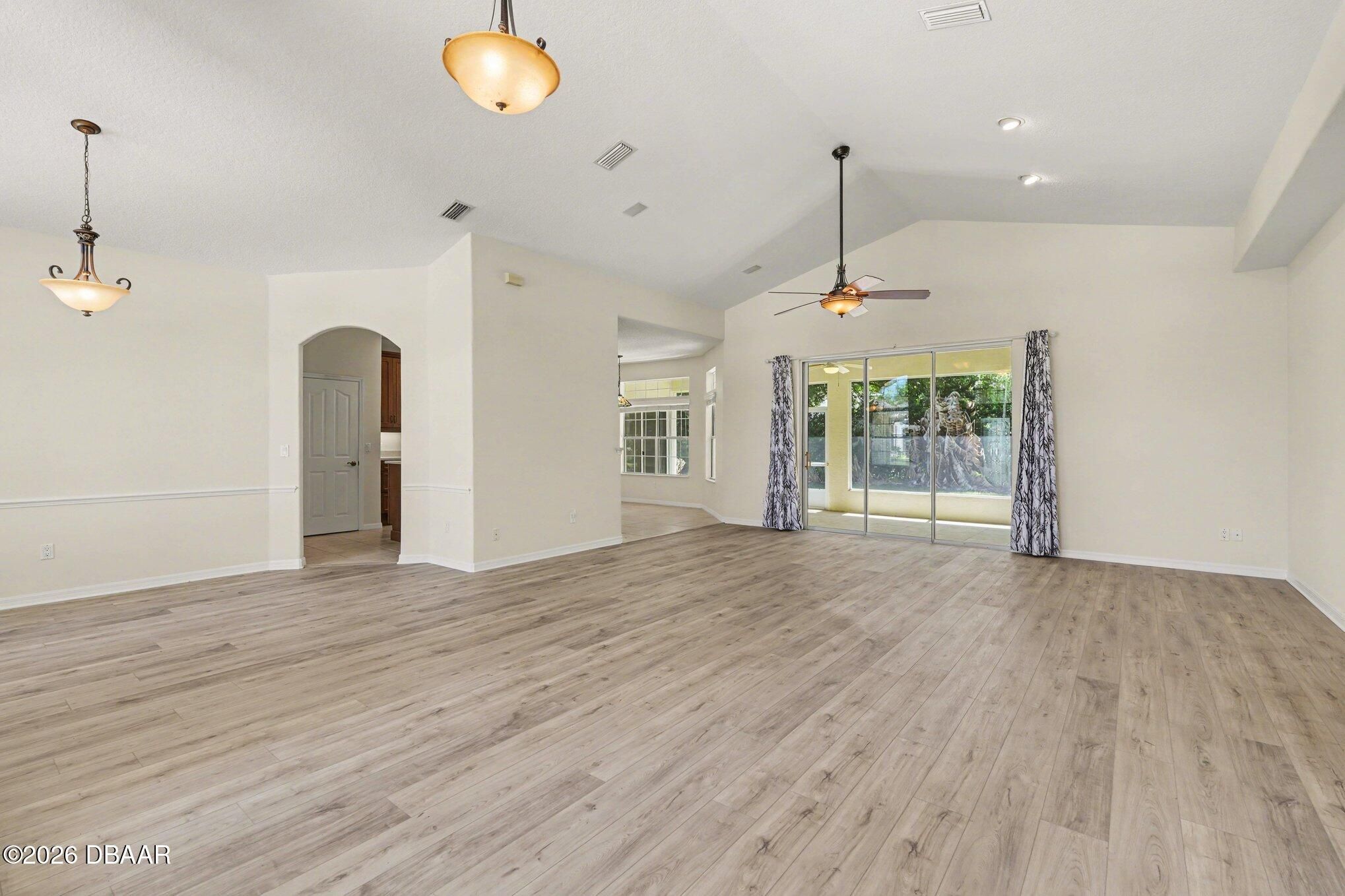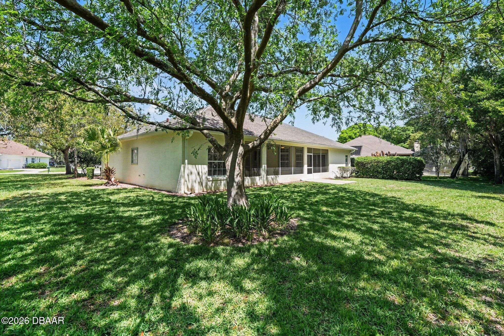 Welcome to a beautifully updated home set on an oversized .39-acre lot in the sought-after Halifax Plantation community. From the moment you arrive, the mature landscaping and expansive circular driveway create a strong first impression. Step through the double leaded-glass entry doors into a light-filled interior featuring vaulted ceilings and an open, flowing layout designed for both everyday living and entertaining. The spacious living and dining areas connect seamlessly to a versatile office/den, while the upgraded eat-in kitchen offers newer wood cabinetry, quartz countertops, stainless steel appliances, a center island, and pantry. A triple-stacking slider opens to a massive screened lanai, overlooking a private, lush backyard, perfect for enjoying Florida living year-round. The split floor plan provides privacy, with a generous primary suite featuring a walk-in shower and soaking tub. Additional highlights include luxury vinyl plank flooring throughout the main living areas. Good-sized interior laundry room with utility sink and storage, updated fixtures and ceiling fans, and a finished garage with a side-entry door. Move-in ready and located within a scenic golf community with miles of tree-lined roads and walking/biking paths. No mandatory golf membership, and the clubhouse restaurant is open to the public. Conveniently located near shopping, dining, and more.
