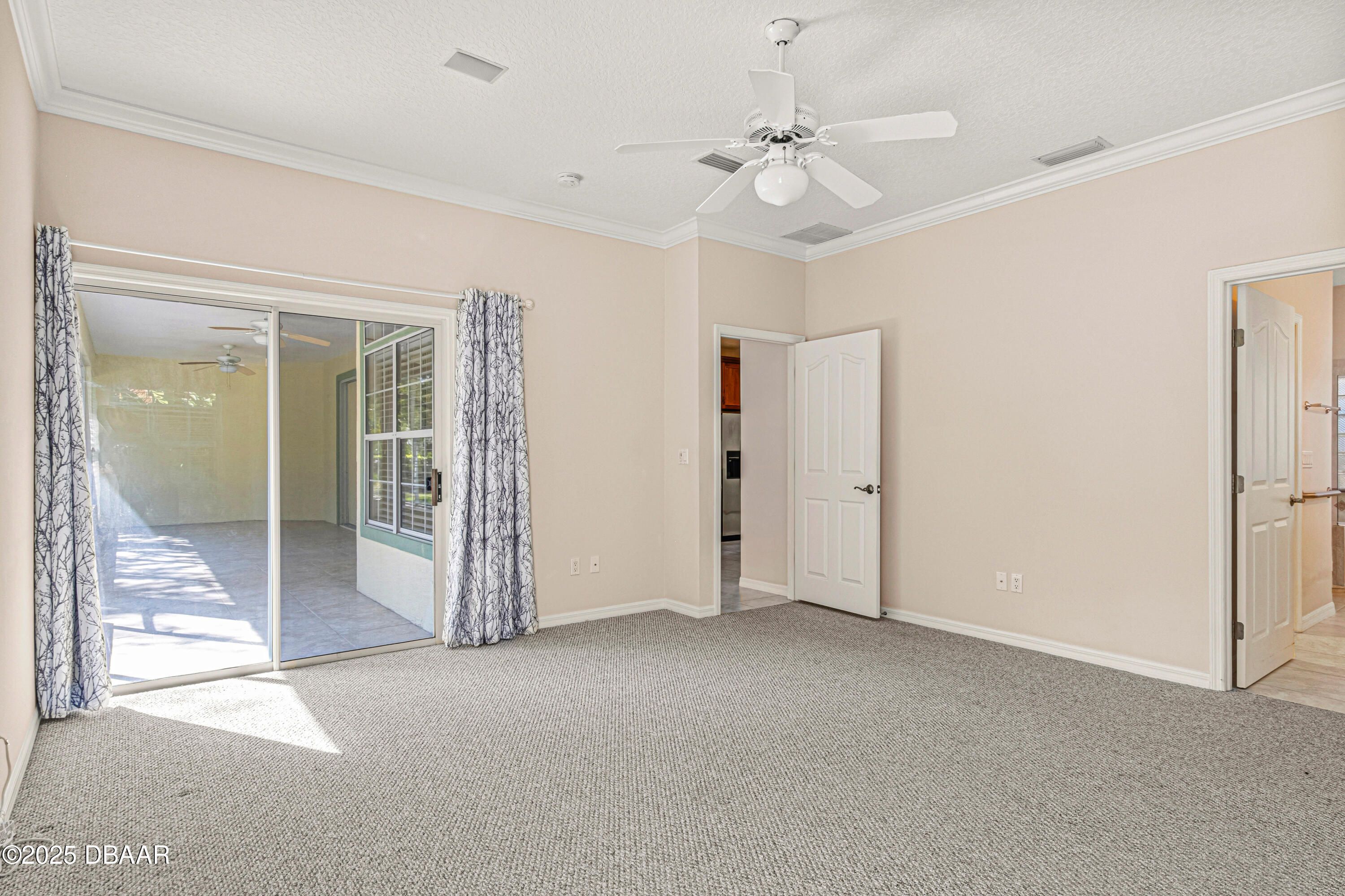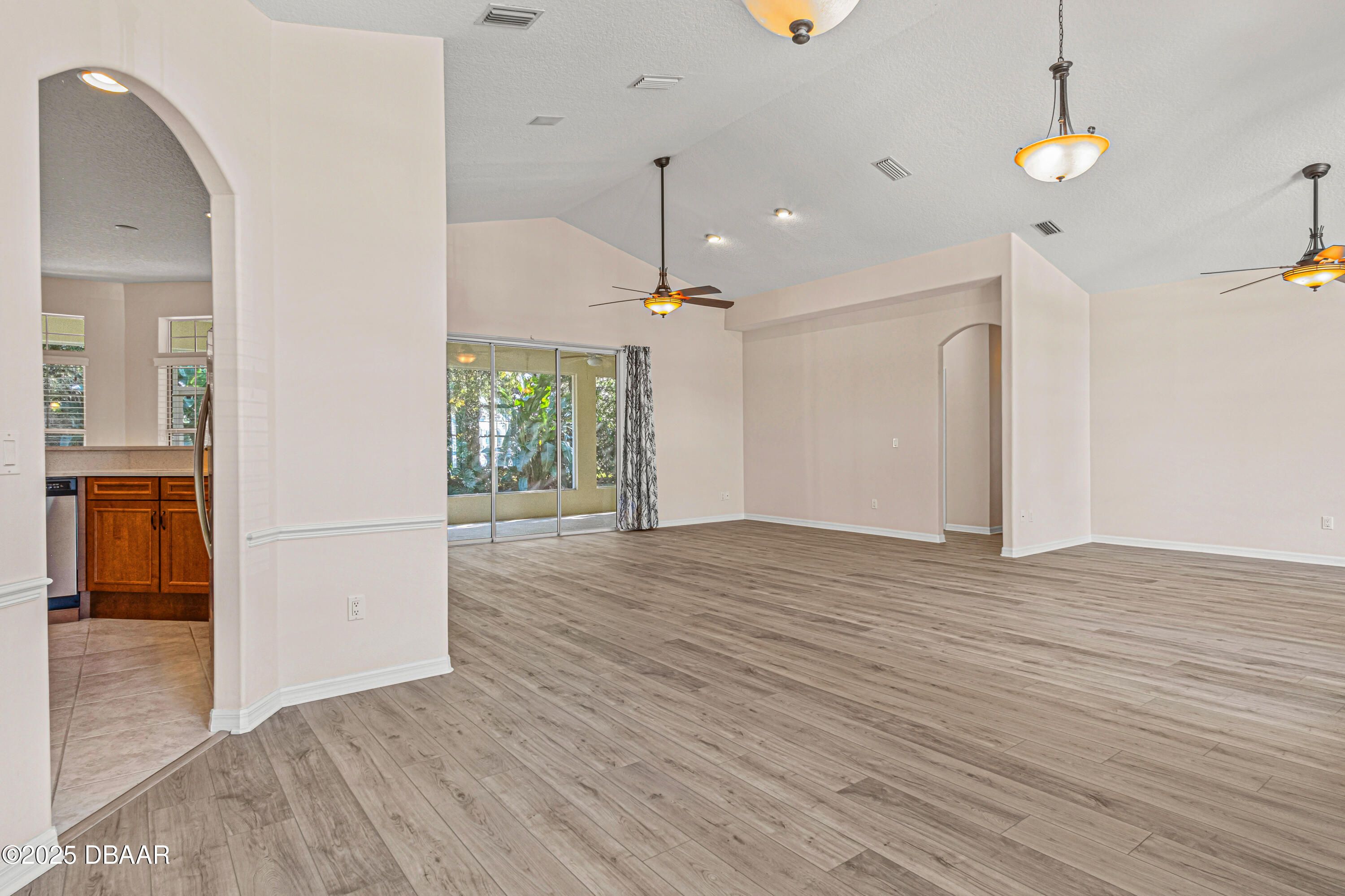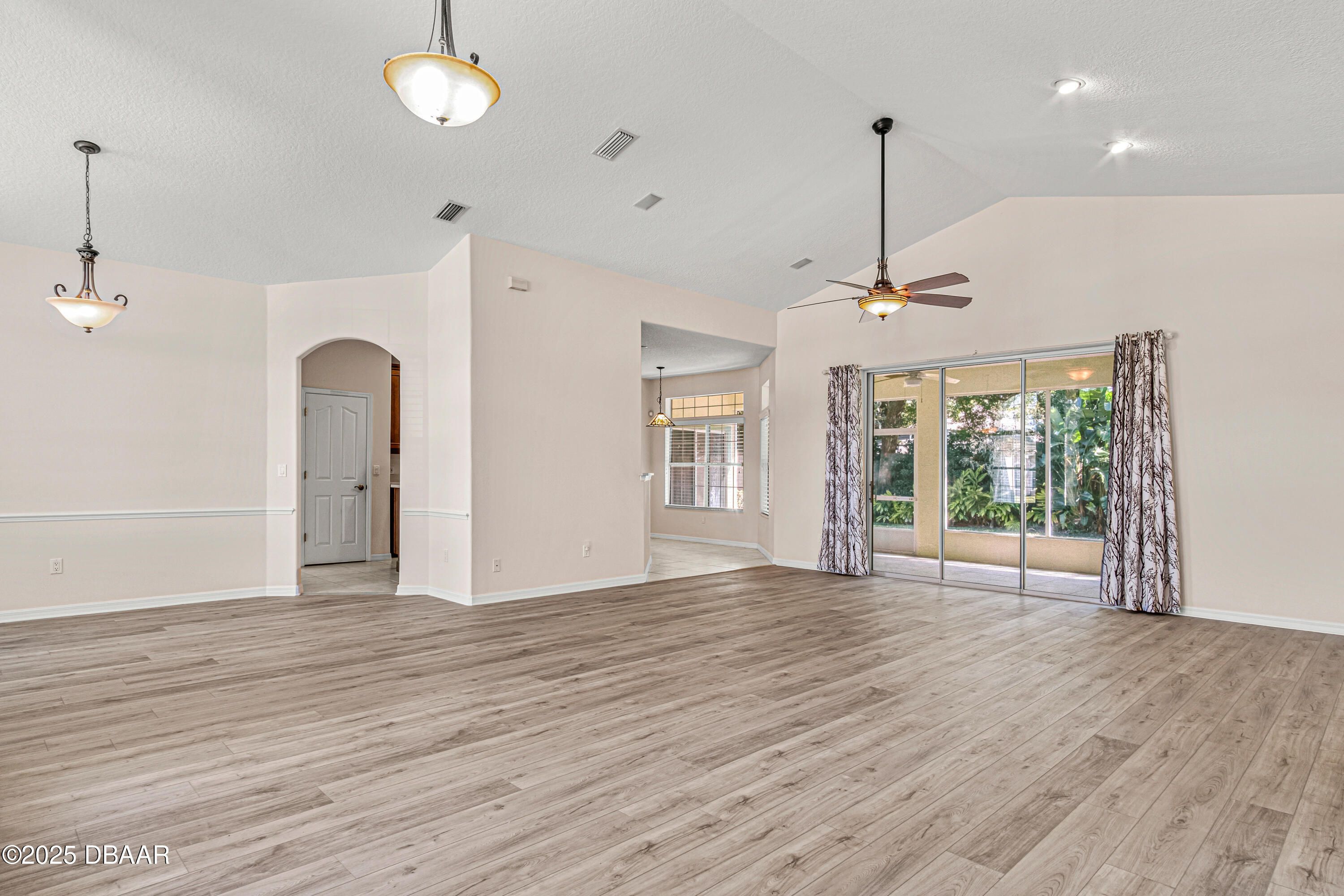 Beautiful spacious and updated home. Enjoy vaulted and high ceilings and an open plan leading to a huge screened lanai and lush private back yard. The Mature landscaping and large circular driveway set the tone. The double door with leaded glass entrance leads to a large living room with dining area and separate office/den area. The upgraded eat in kitchen features newer wood cabinets, center island, pantry, stainless appliances, and quartz counters. There is new light wood style luxury vinyl plank in the main living areas. The home is a split floor plan with inside laundry with tub/sink and storage, Also there are upgraded fixtures and ceiling fans, a finished garage floor, side garage door, stacking slider to the lanai, large windows, Freshly painted the home is in move in condition. The neighborhood features nice homes on spacious lots. Enjoy life in the quality golf community of Halifax Plantation. Miles of scenic tree lined roads and walk/bike ways. Close to shopping at Publix