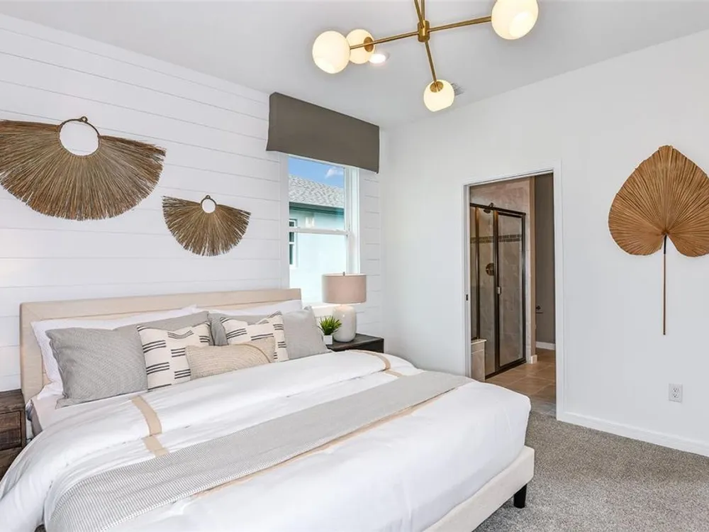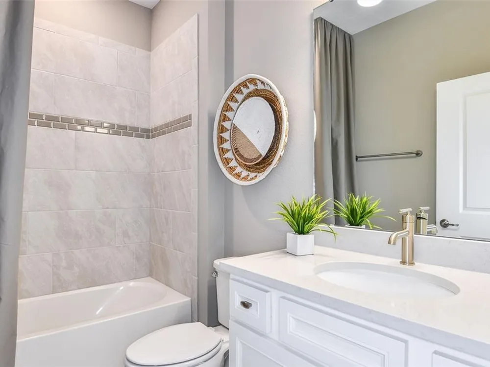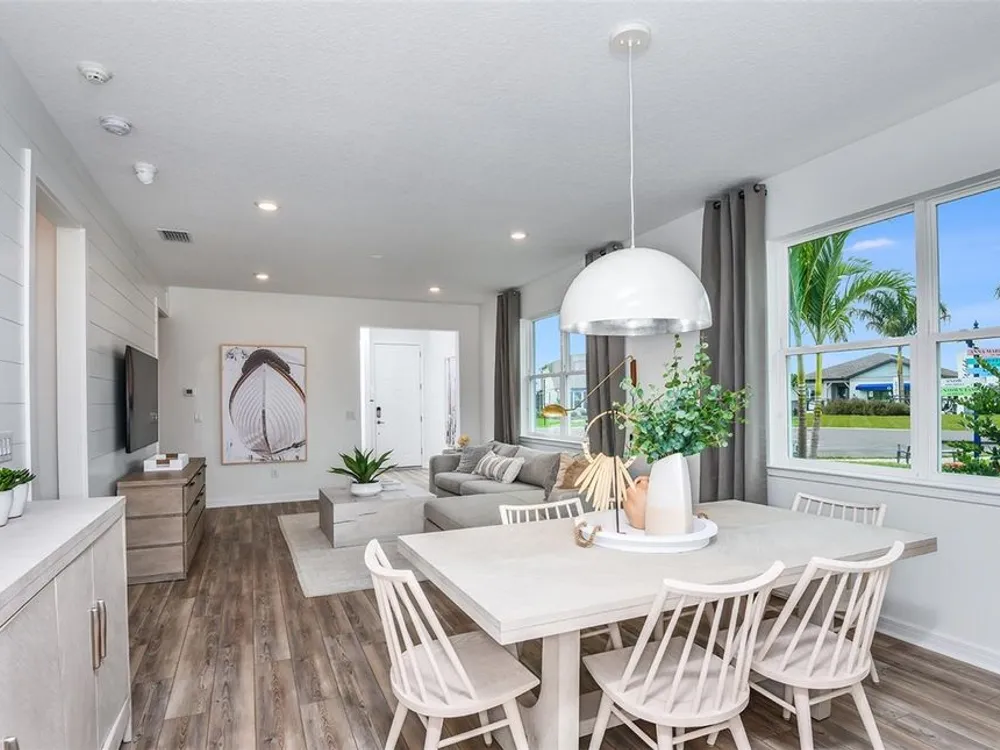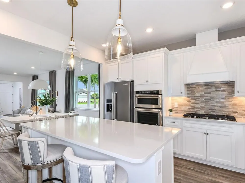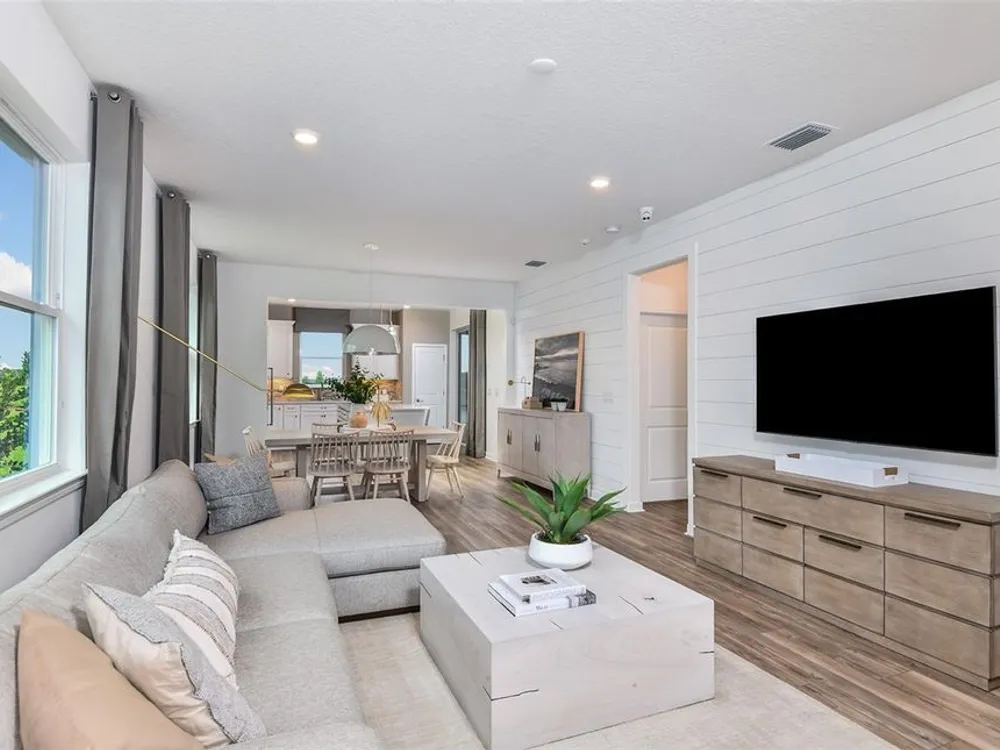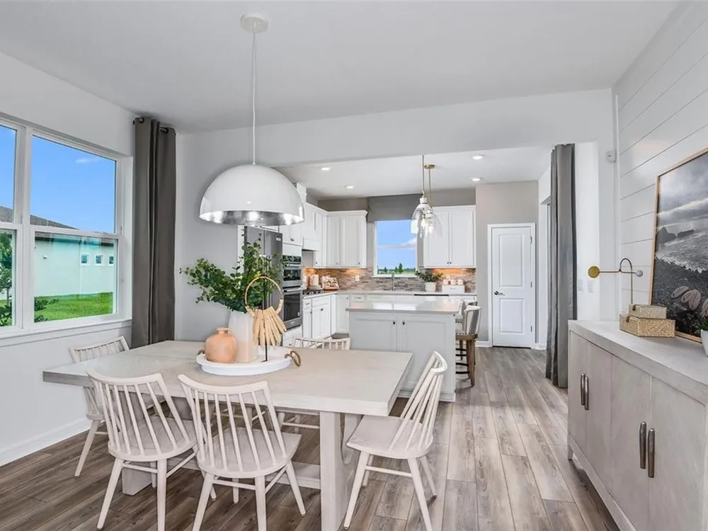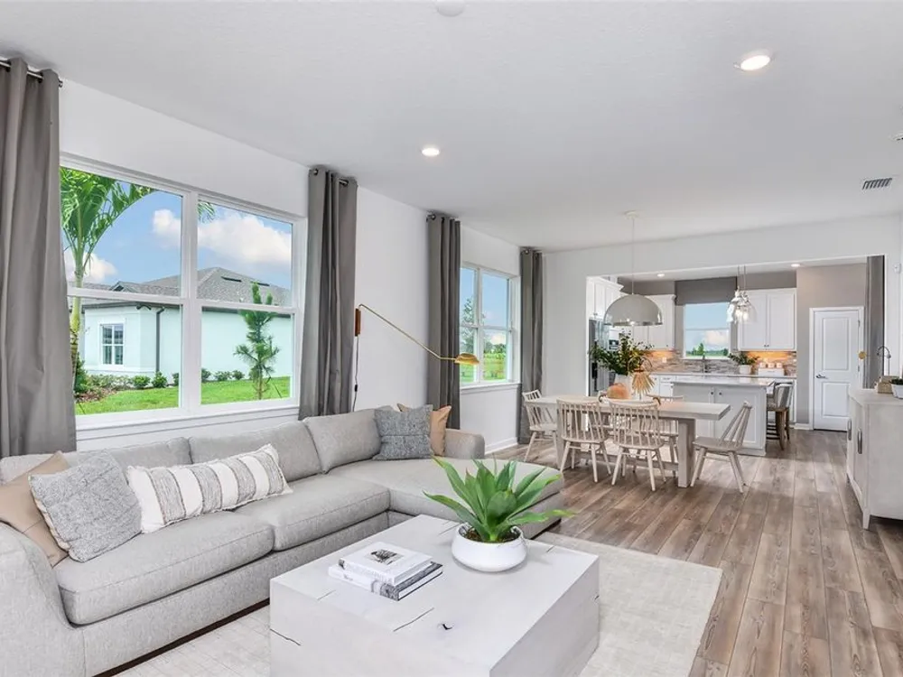 Under Construction. Del Webb at Minneola is a luxurious guard-gated 55+ active adult community offering new construction single-family homes in an unrivaled location on one of the highest peaks in Central Florida. Del Webb Minneola will offer an abundance of resort-style amenities with social events and activities planned by a full-time Lifestyle Director - centered in the stunning clubhouse which offers views of Sugarloaf Mountain. Planned community amenities include a zero-entry resort-style pool, in-ground heated spa, sports courts, on-site bar & grille with indoor and outdoor seating, a fitness center and walking/biking trails. Monthly HOA includes 1 GB high-speed internet, 75 streaming channels and your home's yard maintenance. Visit today to learn more and see for yourself why Del Webb Minneola is the absolute best place to call home! The single-story Compass home design by Del Webb impresses with an open layout, split plan and lots of storage. This home features 2 bedrooms, and Enclosed Flex Room, 2 bathrooms, a 2-car garage and a combined gathering room, café and kitchen – filled with natural light – leading to the covered lanai, making both indoor and outdoor entertaining and everyday living a breeze. The gourmet kitchen features a large island, walk-in pantry, 42’ Winstead White soft-close cabinets, decorative tile backsplash, and quartz countertops. On the opposite side of the kitchen, your private Owner’s Suite looks out to your backyard and covered lanai. It also features an en suite bathroom with walk-in closet, dual sinks, a quartz topped vanity, frameless glass shower with built-in bench, and a private water closet. You’ll love the thoughtful convenience of a laundry room pass-through window from the en suite bathroom. The secondary bedroom, bathroom and flex room towards the front of the home offer space and privacy for everyone. The laundry room offers a utility sink for convenience. Designer-curated finishes elevate every corner of this home, including pendant pre-wire, oil-rubbed bronze hardware and plumbing fixtures, 2” faux wood blinds, and whirlpool washer/dryer. Luxury touches like 8’ interior doors, comfort-height toilets, and wood-look luxury vinyl plank flooring throughout (except for in the laundry room and bathrooms, which are outfitted with beautiful tile) enhance the home's style and comfort. For those who appreciate modern technology, this home comes equipped with a smart thermostat, video doorbell, and LED downlights ensuring your home is as connected as it is beautiful.