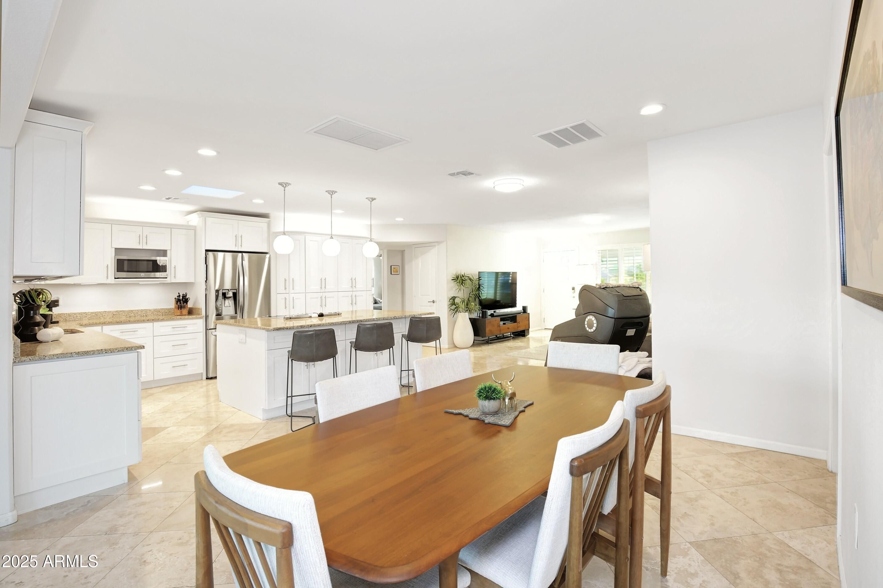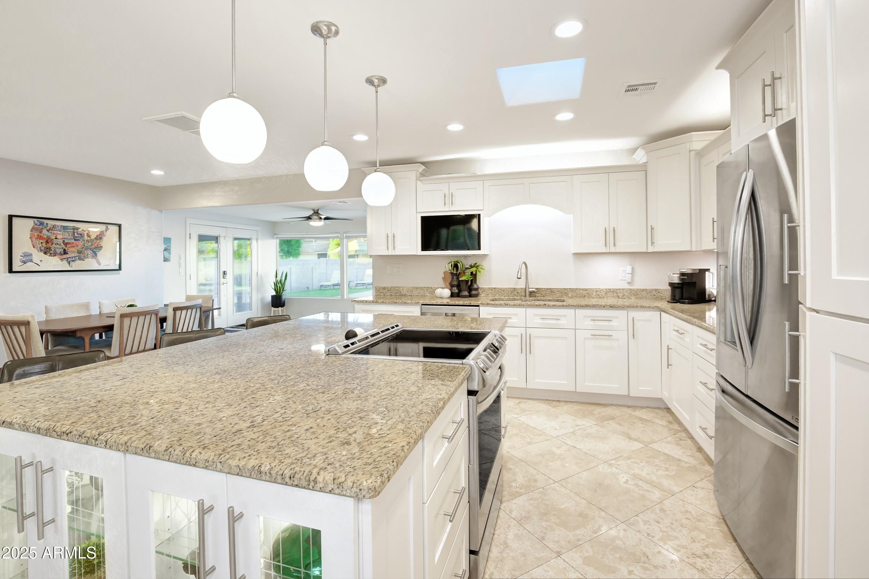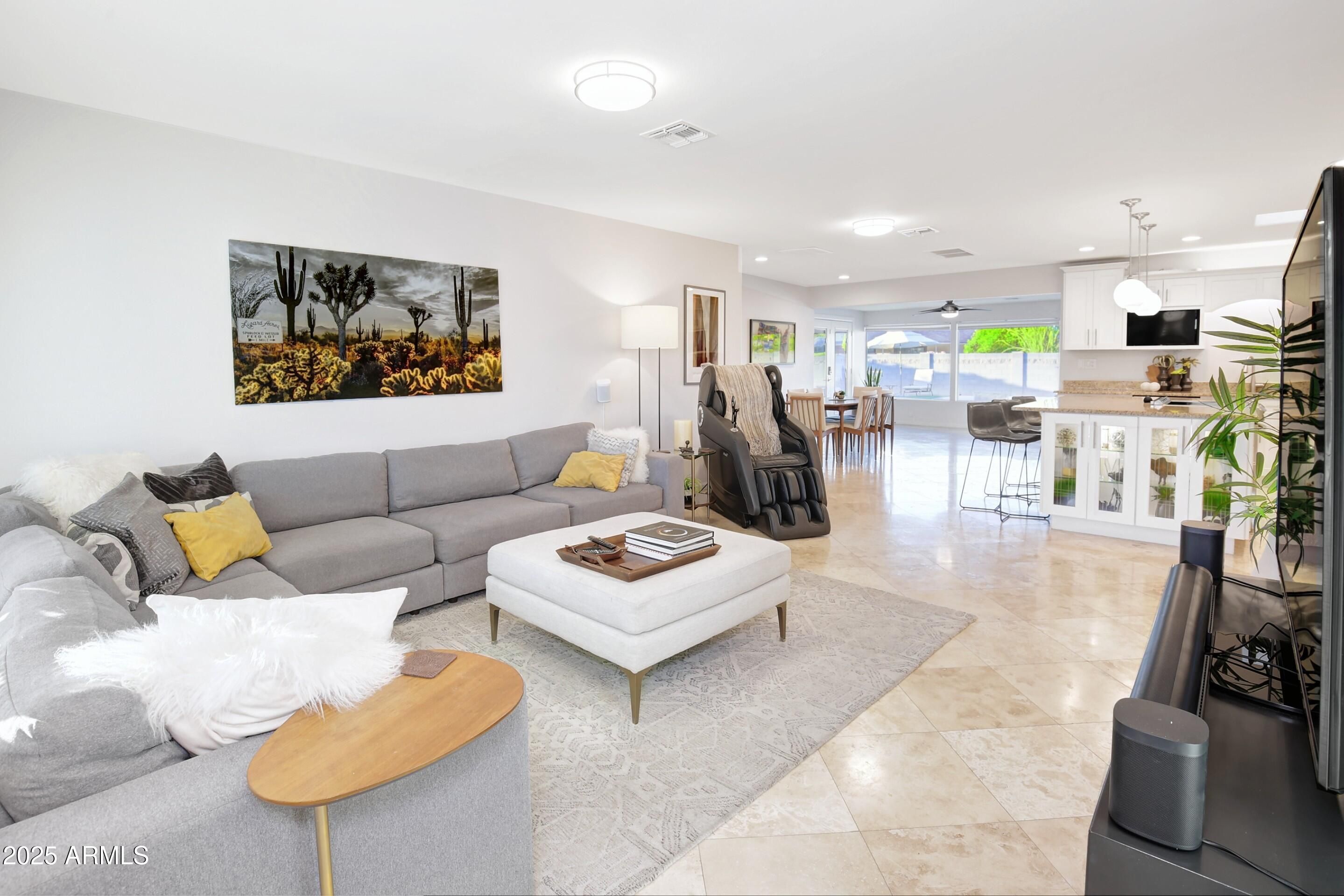 Stunning Corner Lot w/Pool & Spa! This meticulously renovated & expanded 1,822 sf home has been transformed w/ so many high-quality improvements that this move-in-ready gem feels like a brand-new home. Recent updates include roof, windows, & HVAC system replacement. The open-concept remodel features beautiful travertine flooring throughout, granite countertops, & white cabinetry. The gourmet kitchen features stainless steel appliances & a spacious island w/counter seating, making it perfect for entertaining. Both bathrooms showcase elegant tile work w/ glass walk-in showers. The versatile flex space offers a large utility area ideal for a home office or additional sleeping quarters. Outdoor living at its finest: sparkling pool, relaxing hot tub, paver driveway & patios, + cart charging.