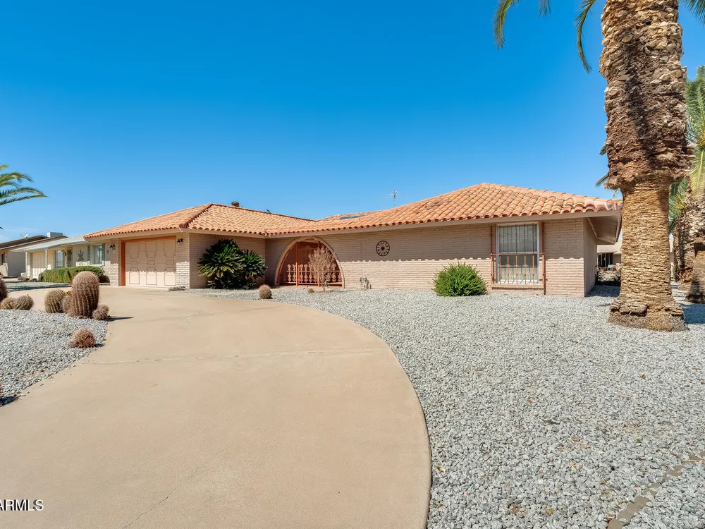 This 3 bedroom, 2 bathroom, Sun City West gem is located on a corner lot with a circular driveway. The spacious gated, Saltillo tiled, front patio is private, yet is open on top to allow sunlight to shine in. Upgrades include new flooring in 2022, new paint in 2021, and brand new sliding doors! Low solar payments, just $157 per month. Recently treated for termites. The AC is serviced regularly and is just 6 years old. Newer water heater installed in 2018. The primary bedroom includes an ensuite and his and her walk-in closets! The large back covered patio offers even more space to enjoy Arizona outdoor living. The extended garage provides plenty of space for storage with built-in cabinets and workspace. There is also plenty of additional space for a golf cart. Don't miss out on this gem!