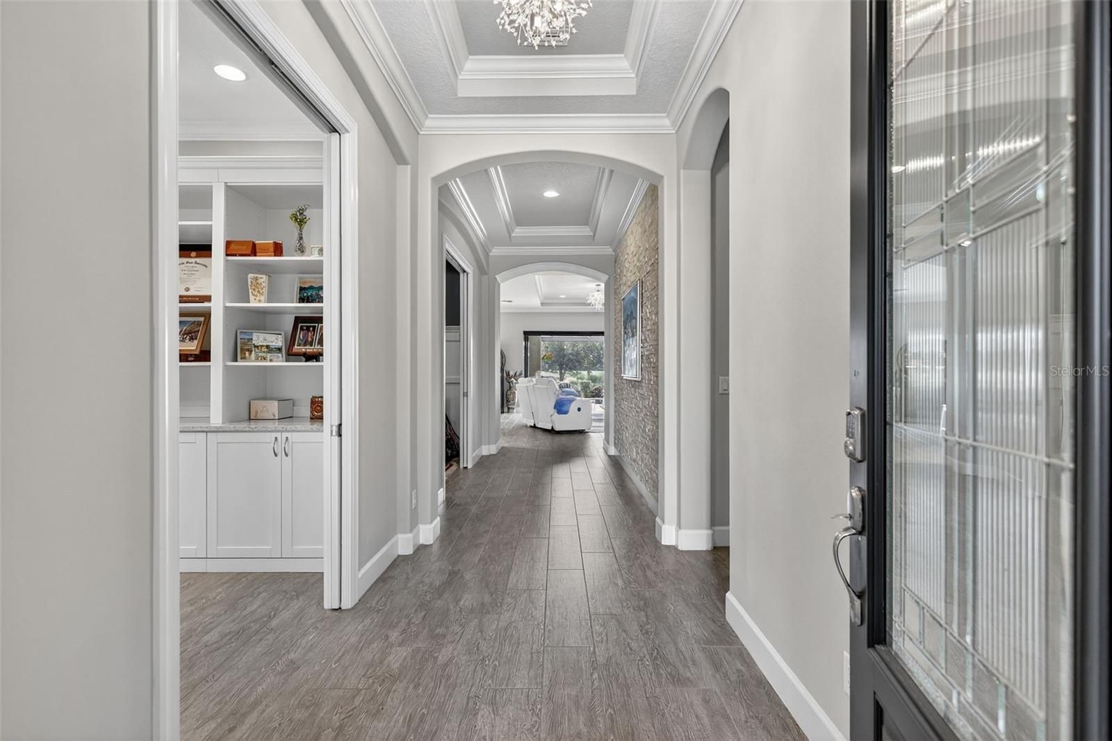 - Built-in Features, Ceiling Fan(s), Crown Molding, High Ceilings, In-Wall Pest Control, Open Floorplan, Solid-Wood Cabinets, Split Bedrooms, Thermostat, Tray Ceiling(s), Walk-In Closet(s)
