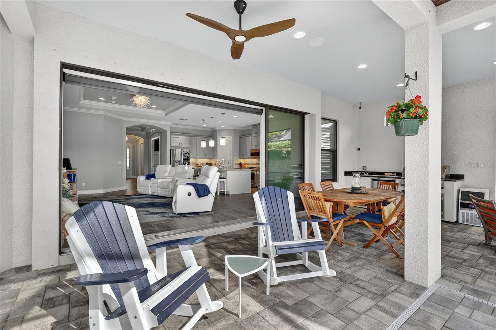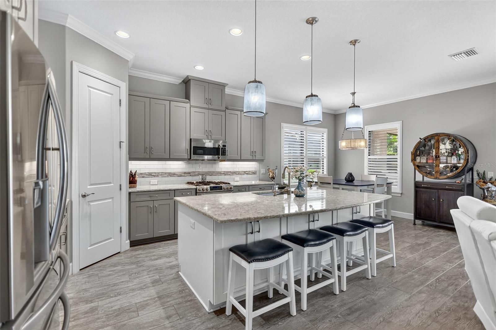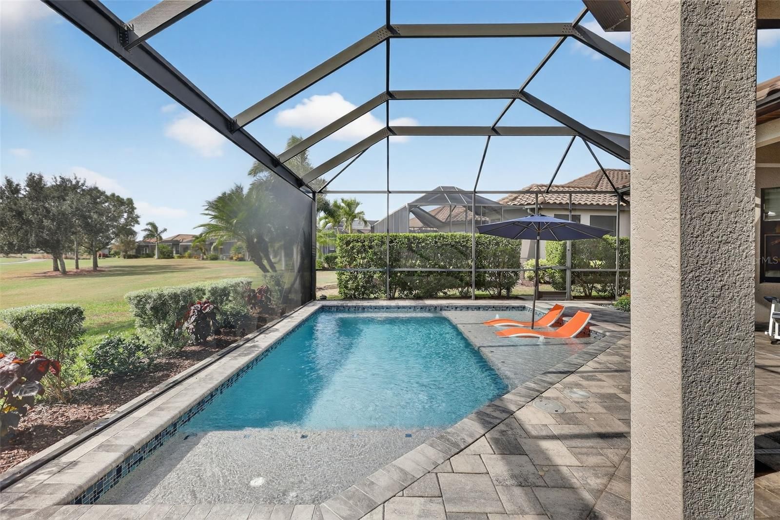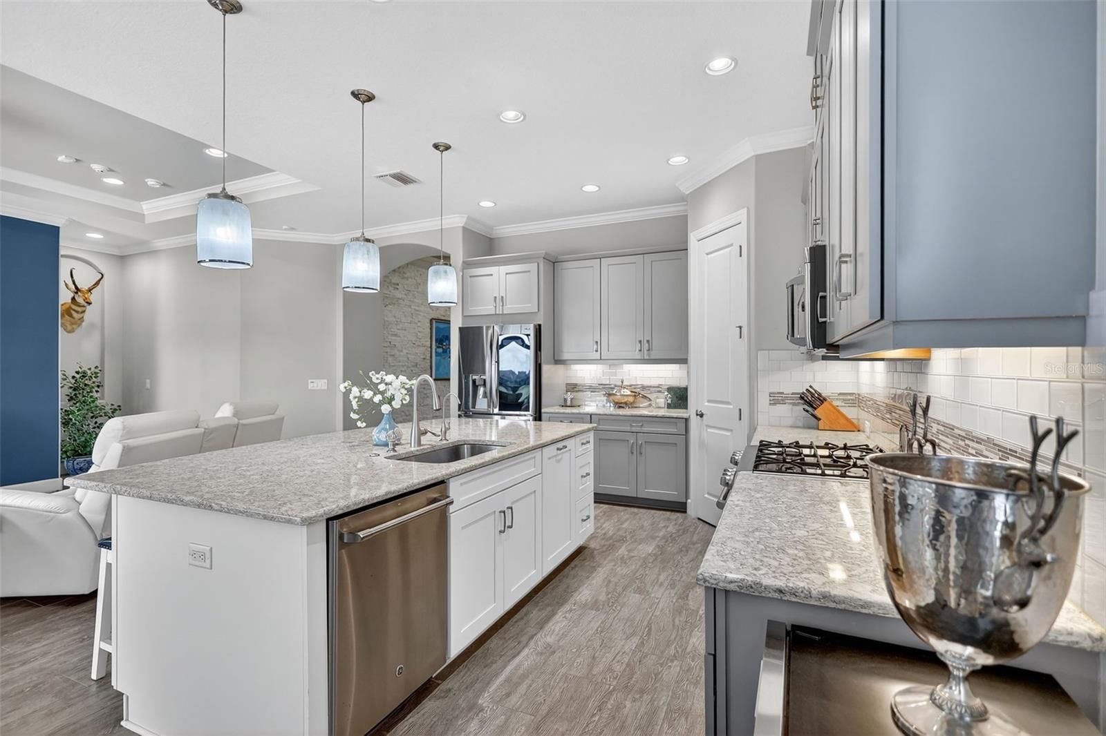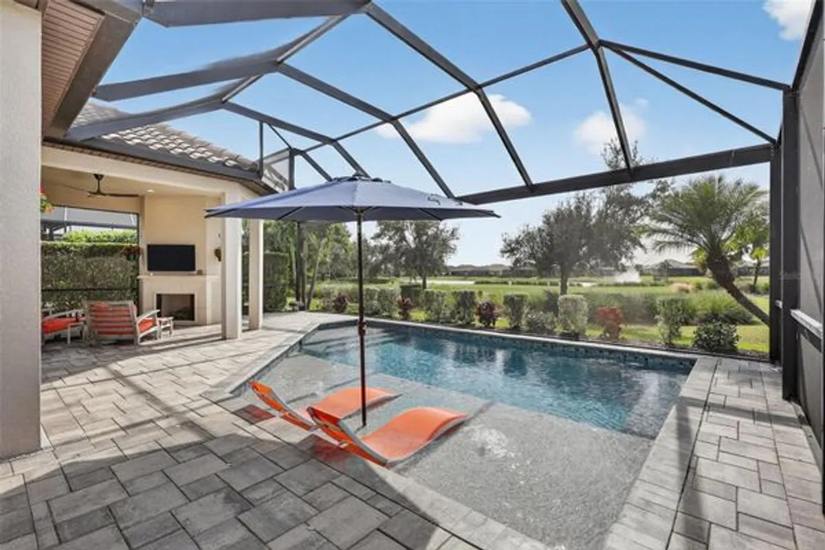 Welcome to this stunning detached golf and pool home in the sought-after Esplanade Golf and Country Club community, offering resort-style living at its finest. Situated on a premium lot, this delightful home boasts a serene water and fairway view from its extended lanai with a fireplace, where you can relax and soak in the beautiful Florida sunshine. Inside, you will find the Farnese plan, a spacious and open floor plan with approx. 2100 sq ft on one level, 2 ensuite bedrooms, and two flex rooms and 2.5 baths and a rare 3 car tandem garage. The gourmet kitchen is a chef's dream, with customized pull-out drawers and 42” cabinets with soft close drawers that offer ample storage space for all your cooking needs. Notice the Quartz counters and GE café series appliances. The interior of the home features 12’high ceilings, including tray ceilings with custom molding’s and built-ins. The generous owner’s suite features bay windows with a serene golf view. The master bath boasts a corner shower, dual sinks & quartz countertops & expansive closet with built-ins. The spacious laundry room has a utility sink and washer and dryer and lots of cabinets. This home also offers a newer HVAC system, upgraded lighting, water softener, tankless water-heater, radiant barrier in the attic. Along with a home warranty for the buyer and part of the CDD paid off. Lounge in your pool in this extended lanai with a panoramic screen and summer kitchen. This special home is located on the 9th hole. This is a golf deeded FULL GOLF MEMBERSHIP maintenance free home offering 18-hole championship golf course for two members. Living in Esplanade is like being on vacation every day. The community is built around healthy living and living well with unlimited exercise and social options. Esplanade offers a wide array of amenities and activities such as an 18-hole championship golf course, two resort pools, hot tubs, resistance pool, pickleball, tennis, bocce ball, two fitness centers, exercise classes, two dog parks, playground, firepit, spa/salon, an on-site lifestyle director, social events, and various clubs. The state-of-the-art Culinary Center offers residents several dining options such as the Barrel House Bistro, Bahama Bar, as well as catering services, wine tastings, and special events. Esplanade is located in the heart of Lakewood Ranch, close to I-75, Lakewood Ranch Main St., University Town Center, Sarasota Polo Club, shopping, dining, entertainment, hospitals, cultural attractions, boating, parks, and Florida’s famous sandy beaches.