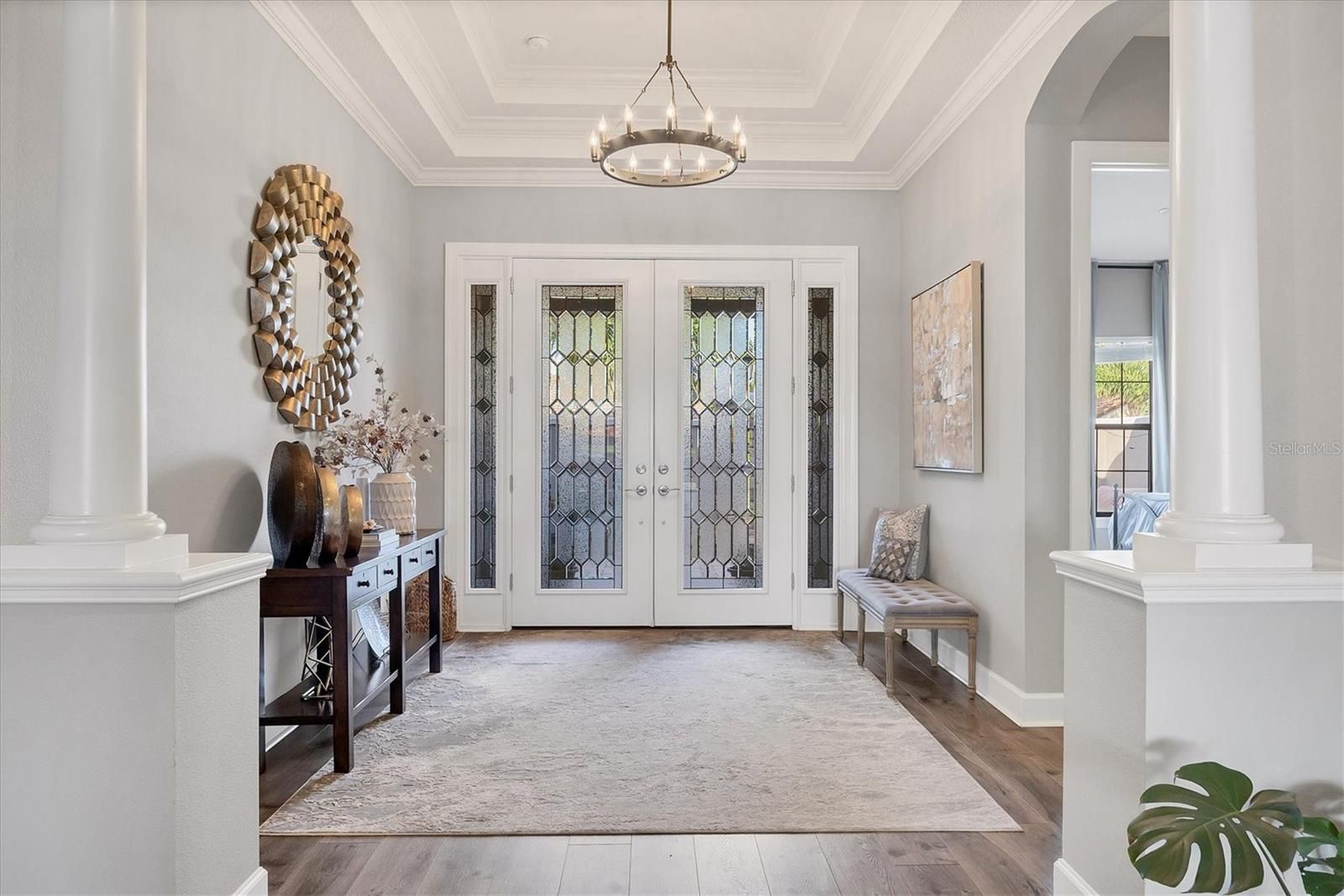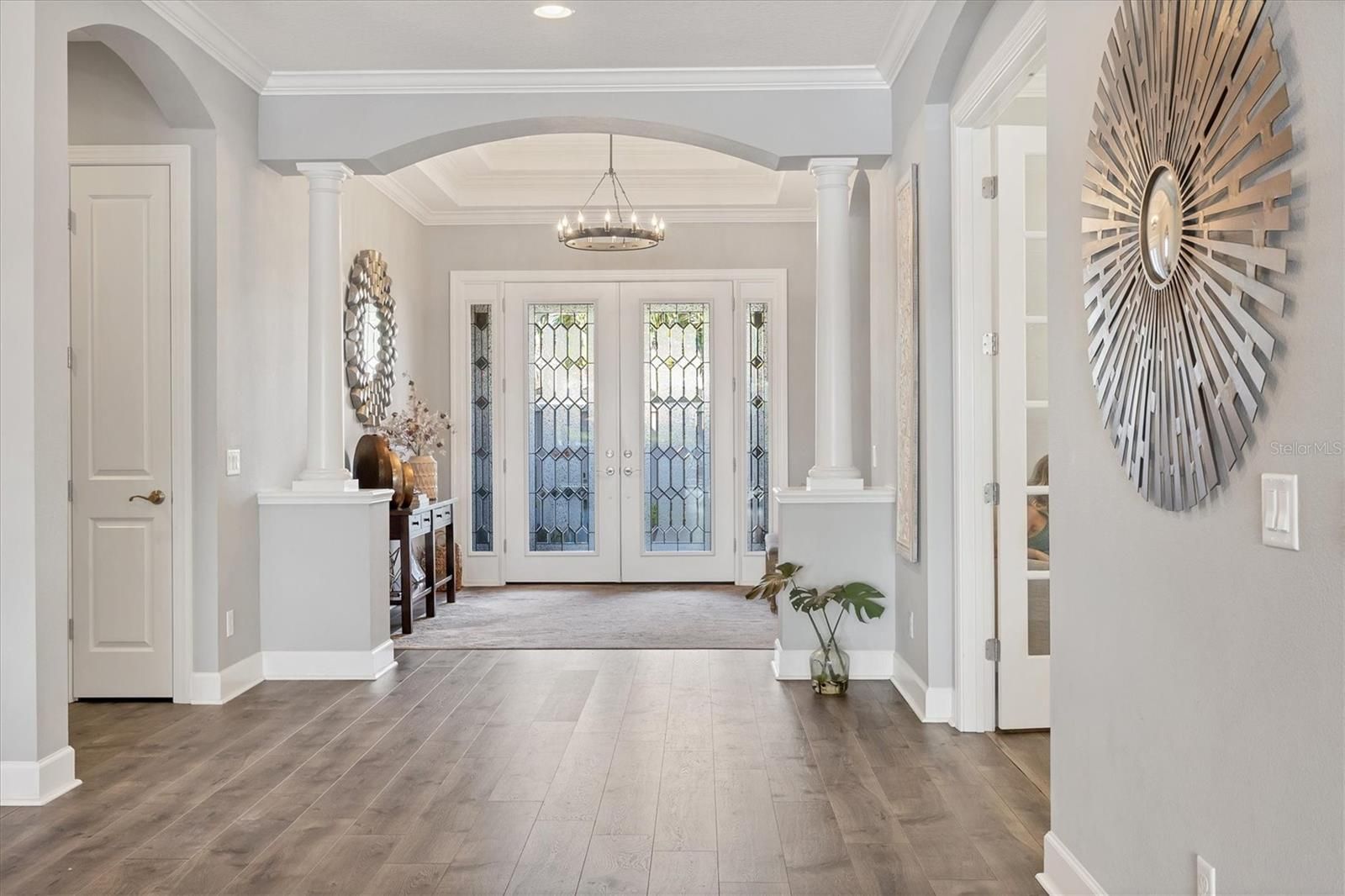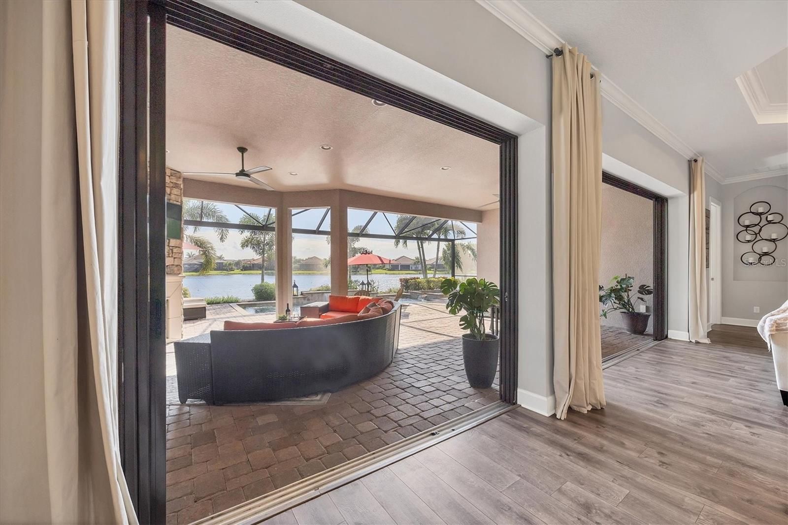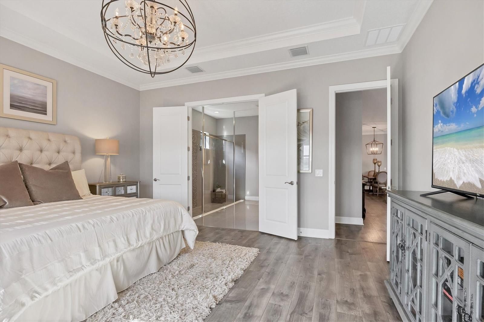 Embrace the ultimate resort-style living in this stunning water view home, featuring the coveted Pallazio VII floor plan with an added nook. This residence boasts an expansive outdoor living space with a gas fireplace, perfect for both relaxation and entertainment, enhanced by Elevation C with a 4 ft garage extension. With a FULL GOLF MEMBERSHIP included, you can enjoy the best of golf and leisure right at your doorstep! As you enter through the charming, gated courtyard and double doors, you will be welcomed by impressive columns and soaring ceilings that set the tone for elegance. The open-concept great room, adorned with crown molding and bathed in natural light from disappearing pocket sliding doors, seamlessly connects to the lanai with breathtaking southwest facing views of the pool and outdoor oasis. The upgraded gourmet kitchen is a chefs dream, featuring stainless-steel appliances including Quartz Cambria countertops, a 36-inch natural gas cooktop, and a built-in oven. The oversized island, highlighted by stylish pendant lighting, offers ample storage and is perfect for entertaining or family meals. Enjoy morning coffee in the extended breakfast area, with sliding glass pocket doors that open to the lanai. Retreat to the grand primary bedroom, a private sanctuary complete with a spacious en-suite bathroom featuring dual sinks, a frameless glass shower, and a large walk-in closet. Two guest bedrooms provide comfort and privacy, one with an en-suite bathroom and the other with convenient access to a separate bath. The generously sized study/den, accessible through elegant 8 ft. French double doors, offers versatility for work or can easily be transformed into a fourth bedroom. Step outside to the extended screened lanai, where the expansive paver deck and endless water views invite you to soak up Florida’s sunshine. With a wealth of community amenities, including an 18-hole championship golf course, tennis and pickleball courts, two resort-style pools, and a full-service spa, you will never run out of things to do. Enjoy fine dining at the Barrel House Bistro, or casual meals at the Bahama Bar, along with an active social calendar filled with events. Located in award-winning Lakewood Ranch, you are just moments away from shopping, dining, local farmers? markets, scenic trails, and beautiful beaches. Don't miss your chance to own this meticulously designed home in one of Florida's premier communities, schedule your showing today and step into your dream lifestyle! GREAT ROOM AND PRIMARY BEDROOM LIGHT FIXTURES DO NOT CONVEY.