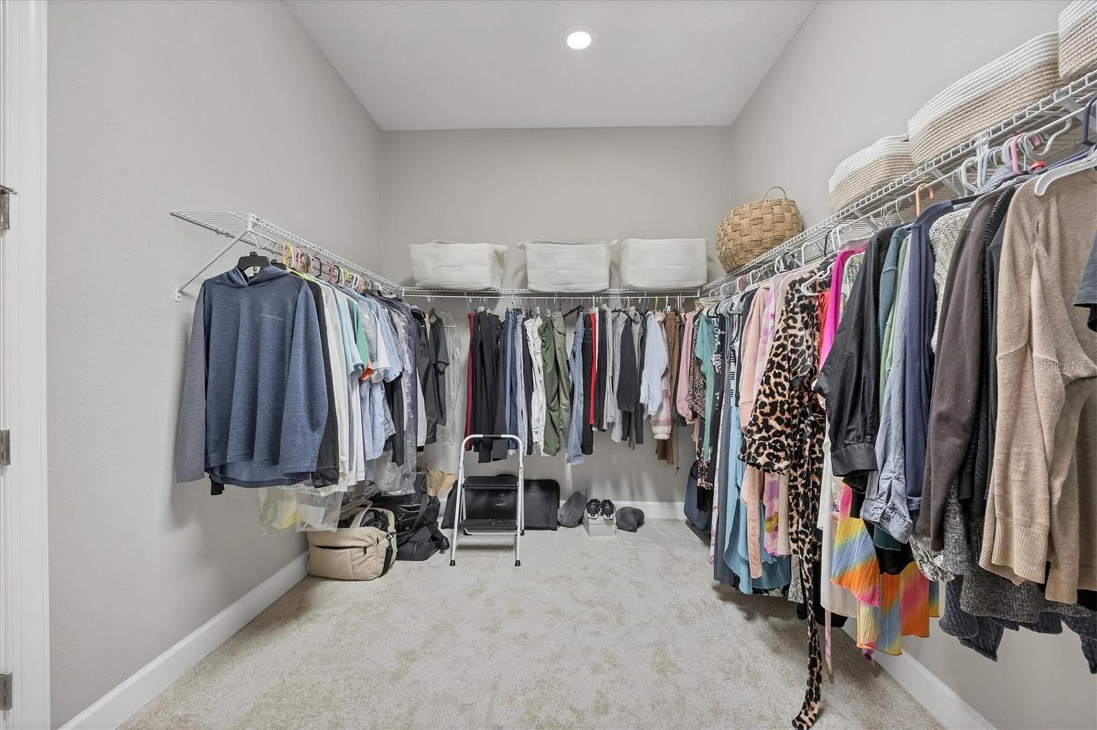 - Ceiling Fan(s), Crown Molding, Eat-in Kitchen, High Ceilings, In-Wall Pest Control, Kitchen/Family Room Combo, Living/Dining Room, Open Floorplan, Main Level Primary, Solid-Wood Cabinets, Stone Counters, Thermostat, Tray Ceiling(s), Walk-In Closet(s), Window Treatments